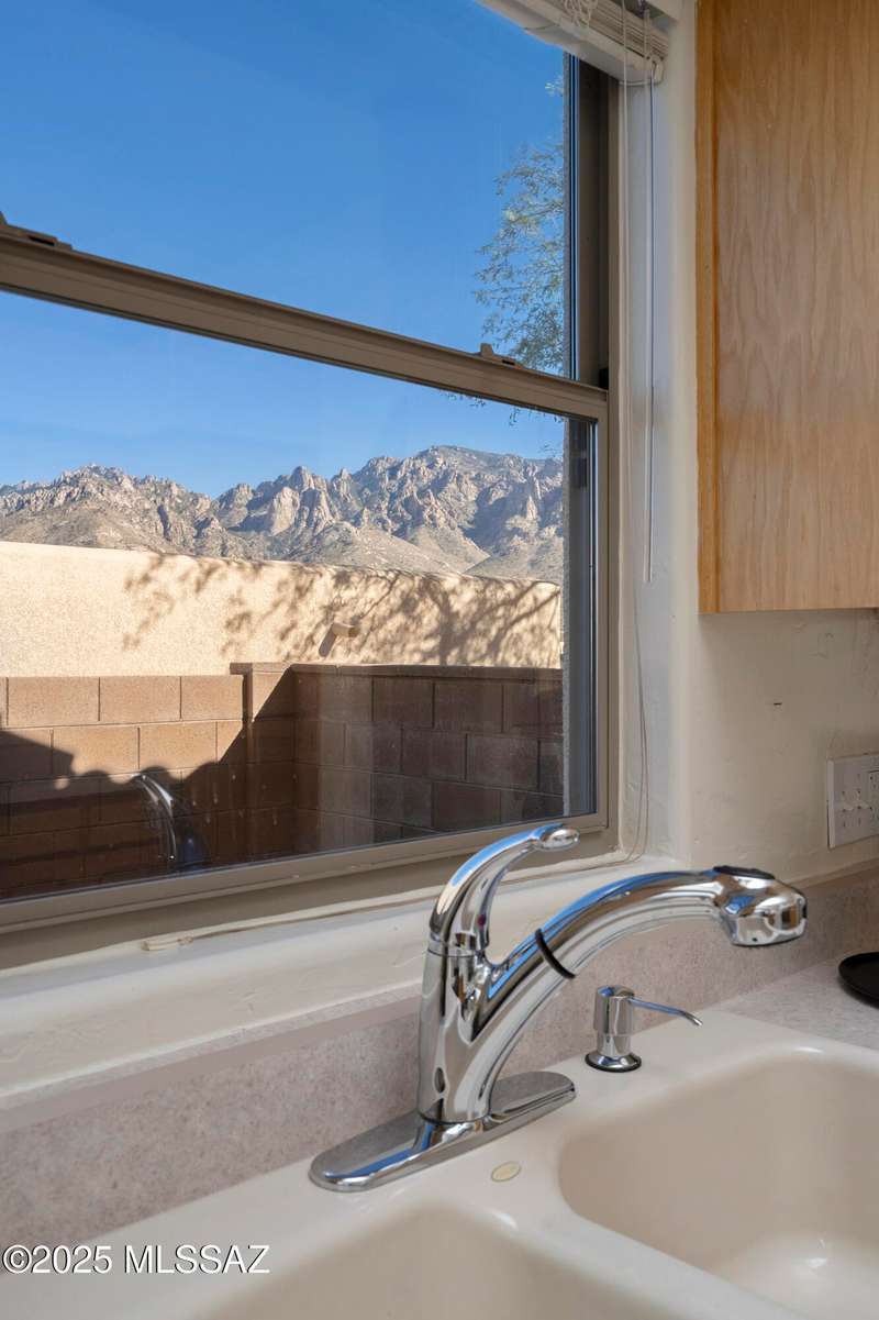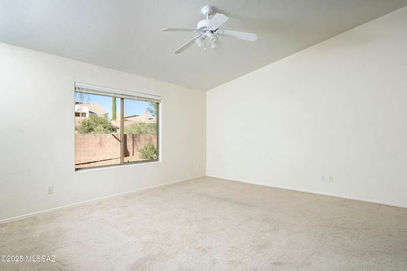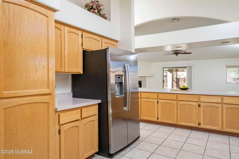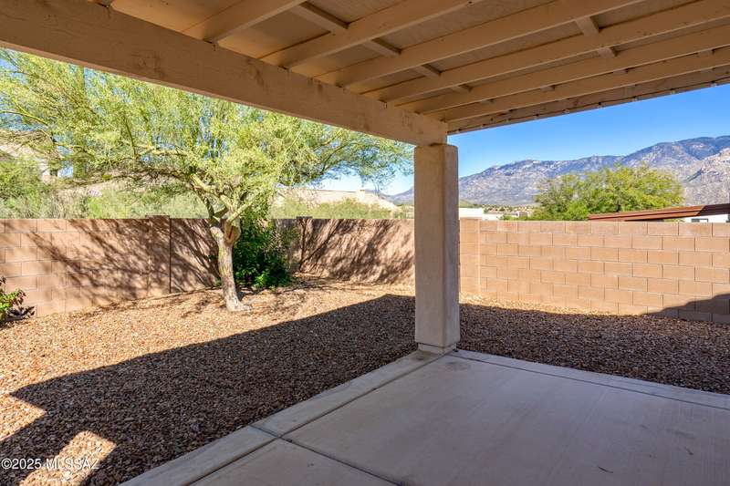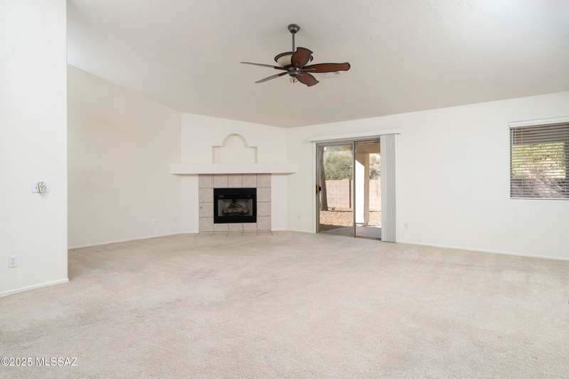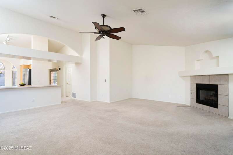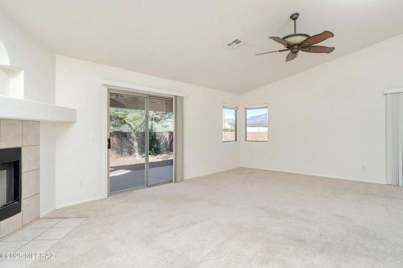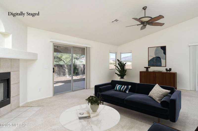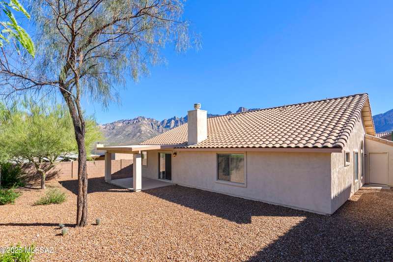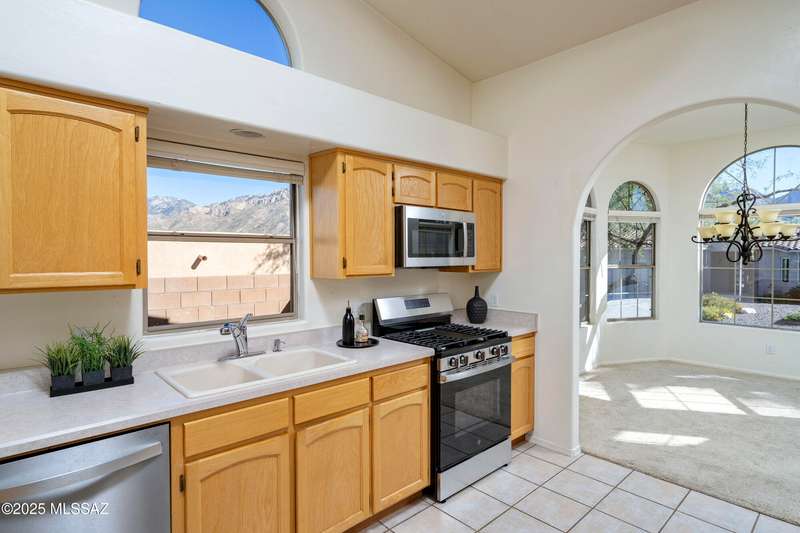 Set in the desirable Catalina Shadows neighborhood, this light-filled Oro Valley home offers an easy, single-story lifestyle with great bones and Catalina Mountain views out of several windows. The split bedroom plan features high ceilings and half-moon clerestory windows that bring in natural light. The kitchen has BRAND NEW appliances, abundant cabinetry, and a pass-through peninsula with breakfast bar, flanked by a dining room at the front and a generous living space with fireplace and backyard access. Double doors lead to the primary suite overlooking the backyard, complete with a walk-in closet with window and a private bath offering dual sinks, a garden tub, walk-in shower, and separate toilet room. One bedroom sits near the entry--ideal for guests or a quiet office. A second guest