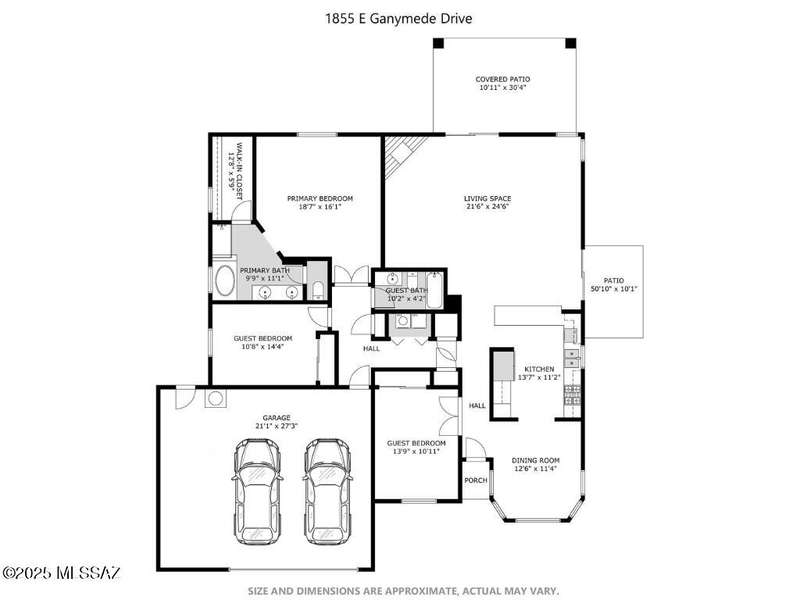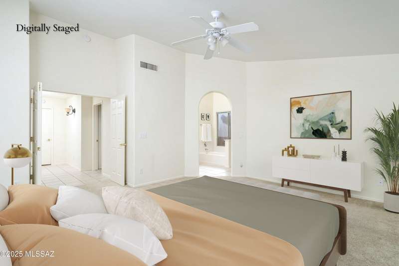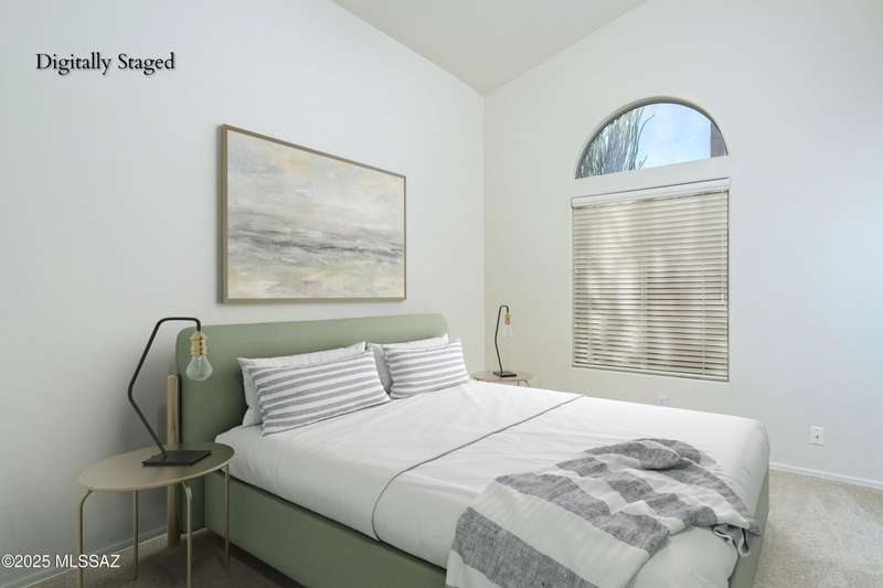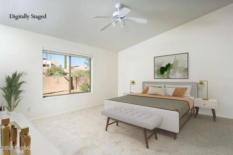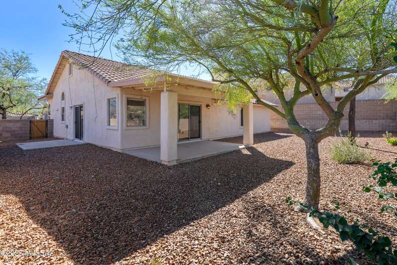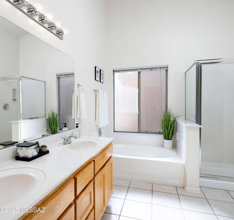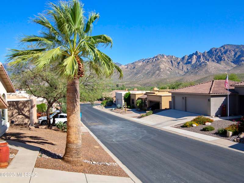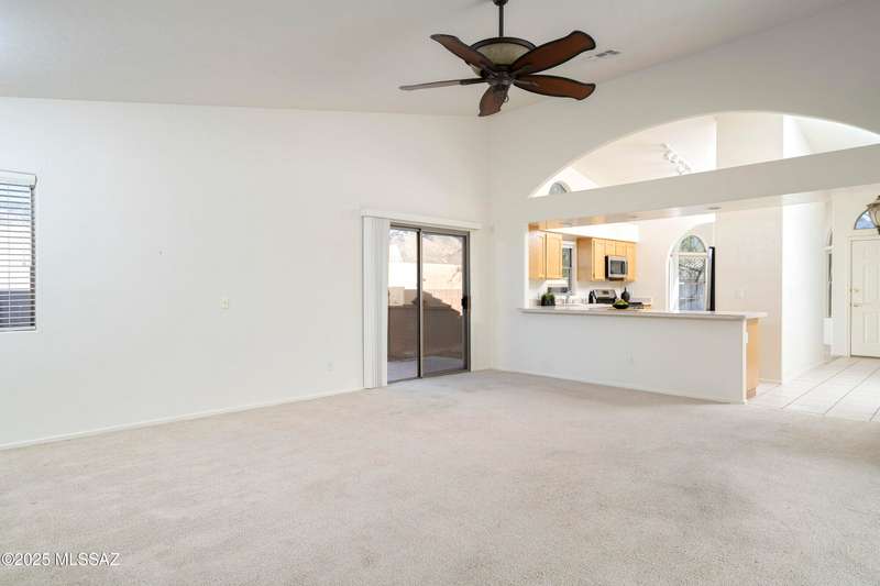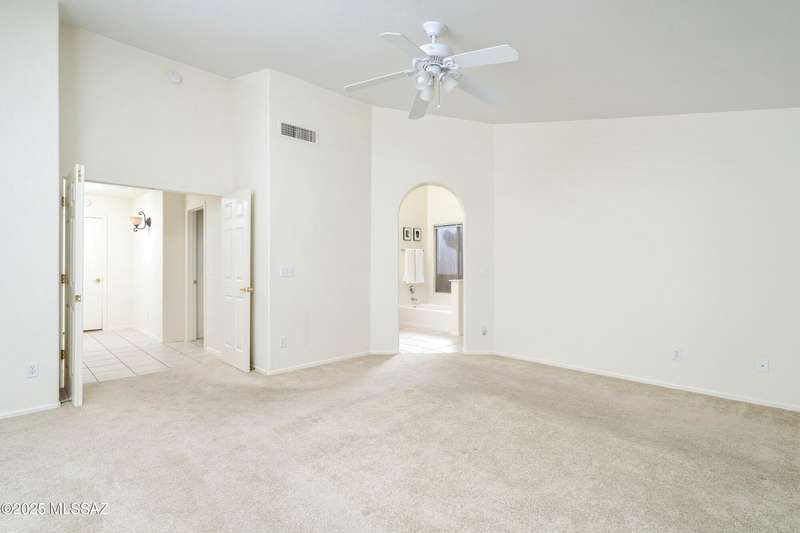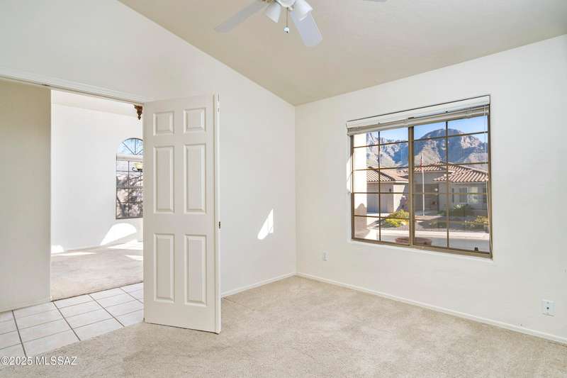 Set in the desirable Catalina Shadows neighborhood, this light-filled Oro Valley home offers an easy, single-story lifestyle with great bones and Catalina Mountain views out of several windows. The split bedroom plan features high ceilings and half-moon clerestory windows that bring in natural light. The kitchen has BRAND NEW appliances, abundant cabinetry, and a pass-through peninsula with breakfast bar, flanked by a dining room at the front and a generous living space with fireplace and backyard access. Double doors lead to the primary suite overlooking the backyard, complete with a walk-in closet with window and a private bath offering dual sinks, a garden tub, walk-in shower, and separate toilet room. One bedroom sits near the entry--ideal for guests or a quiet office. A second guest