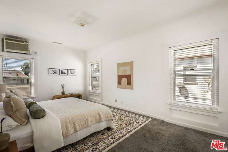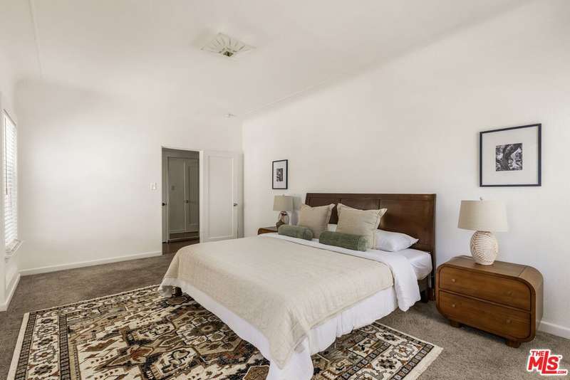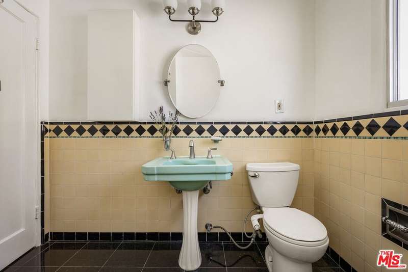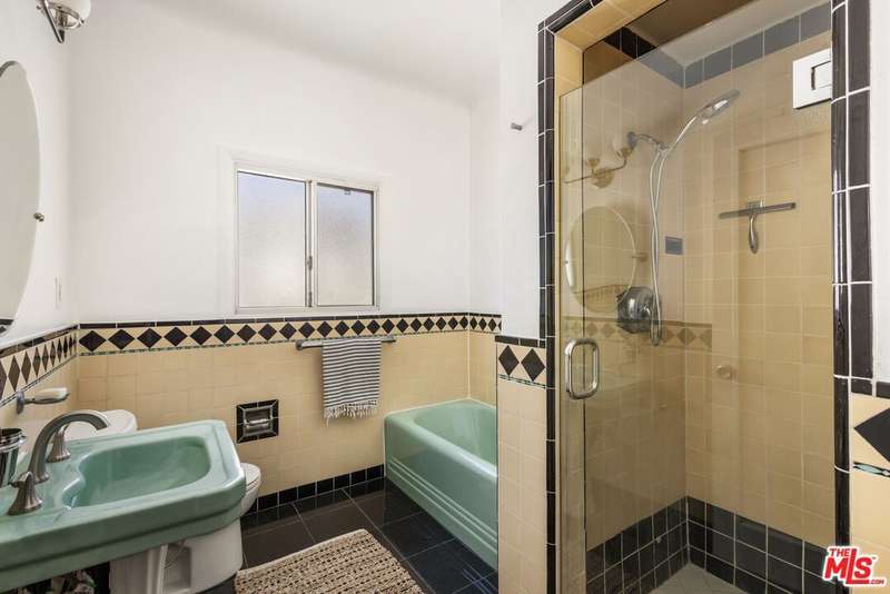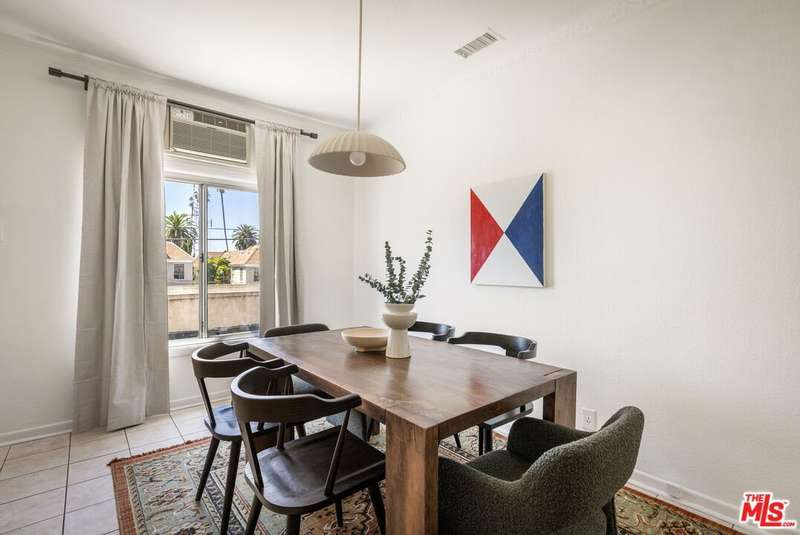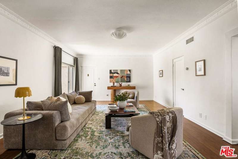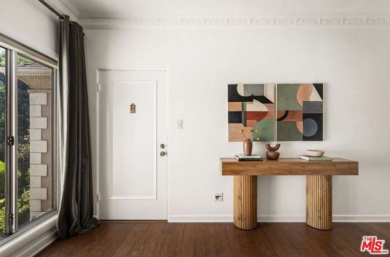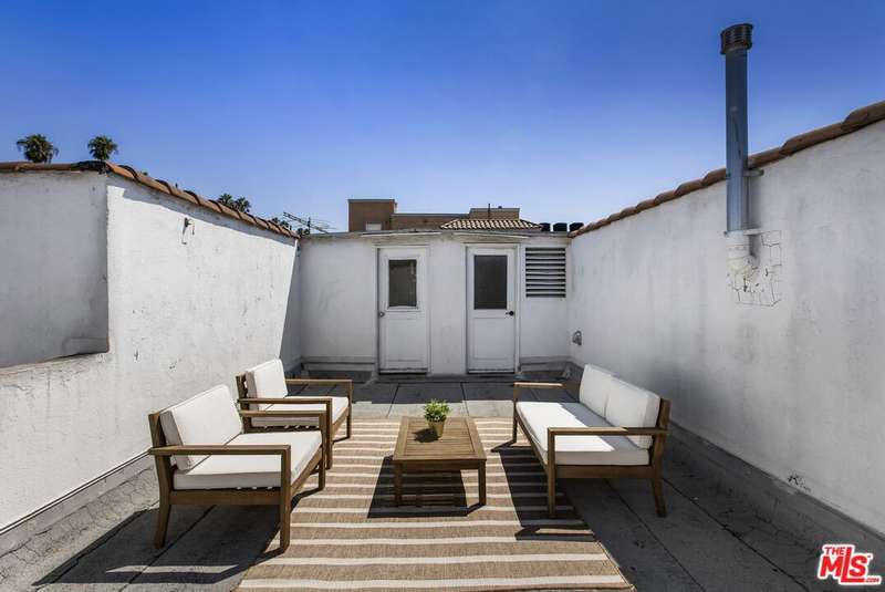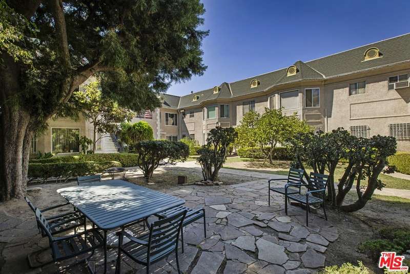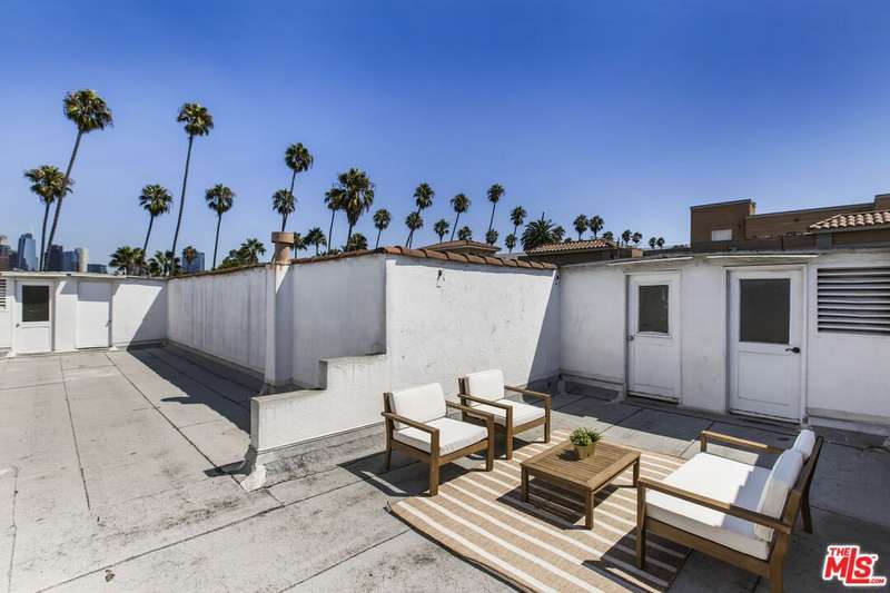 Enchanting 1930s French Normandy Condo - they just don't build them like this anymore! Tucked behind gates and set far back from the street, you'll arrive through a lush central courtyard with a front lawn, prolific lemon tree, and gorgeous shared outdoor dining area. Perfectly positioned at the rear of the complex, this oversized top-level one-bedroom feels both private and full of character. The gracious living room features warm bamboo floors, original crown molding, a freshly painted interior, and a large picture window overlooking the verdant courtyard. A separate dining room with built-in sideboard and a timeless pendant light flows seamlessly into the updated kitchen with granite counters, Shaker-style cabinetry, and stainless steel appliances. The sun-drenched spacious bedroom easily accommodates a king-size bed, while the beautifully tiled vintage bathroom remains period-appropriate with a separate tub and shower. Thoughtful updates throughout include fresh paint, new light fixtures, and central heat. Additional highlights include in-unit laundry room with extra storage, basement storage, private 1-car garage, and shared rooftop deck with downtown views. With easy access to DTLA and Koreatown, this condo is a truly timeless gem in the heart of the city.