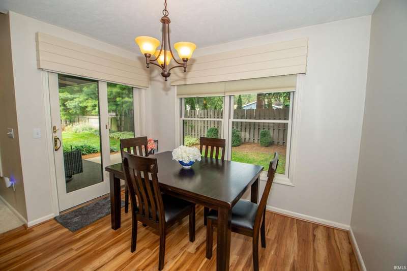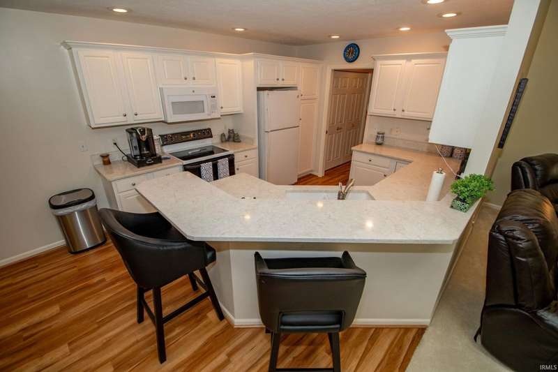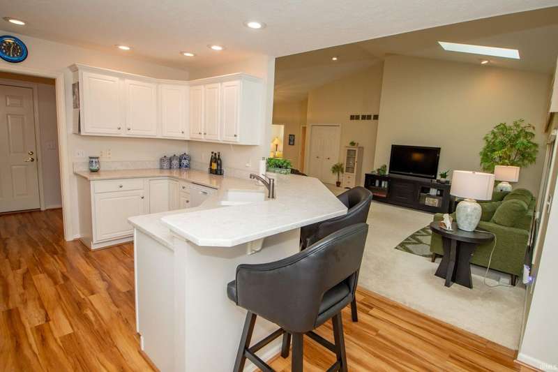 Welcome to this wonderful villa community, perfectly situated near shopping, dining, and all the conveniences you need. Nestled on a spacious corner lot, this home offers exceptional privacy with privacy fence on rear and side, mature landscaping, and a covered patio. Extra yard space set up to enjoy your own hidden garden space. Inside, you'll love the open-concept design with vaulted ceilings, abundant natural light, and custom blinds. The updated kitchen features new quartz countertops and modern finishes. A main-level laundry room with utility sink and extra storage makes everyday living easy. The primary suite offers a peaceful retreat with a walk-in closet, double sinks, and space to unwind. The finished lower level includes a large family room with egress windows and plenty of additional storage. Many thoughtful upgrades throughout include a newer on-demand water heater. ? truly move-in ready.