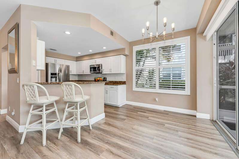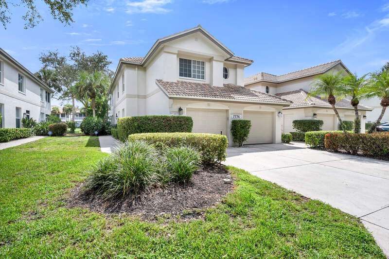 This lovingly updated FIRST FLOOR, END UNIT coach home offers serene lake views in the highly desirable North Naples gated community, The Orchards. This bright and inviting residence features 3 bedrooms, 2 baths, a private laundry room, plenty of storage and an attached GARAGE, all thoughtfully designed for comfort and convenience. Located in a rare "quad" building with only four attached units, the home enjoys added privacy and abundant natural light. Inside, you'll find updated luxury vinyl plank (LVP) flooring throughout the main living areas and kitchen, complemented by plantation shutters on all windows and electronic sun shades on the lanai for effortless light control. The updated kitchen includes white cabinets, granite counters and stainless appliances. The spacious master bedroom is en suite and includes dual sinks, a separate soaking tub and walk-in shower, offering a relaxing retreat at day's end. Two additional carpeted bedrooms provide flexibility for guests or a home office, while generous storage closets and a private laundry room with washer and dryer add everyday practicality. Peace of mind comes with the newer tile roof (replaced just 5 years ago), 2 year young AC system, and 3 year water heater. The lanai features manual accordion storm shutters-perfect for keeping your outdoor furniture clean and dry while offering easy storm protection. Residents of The Orchards enjoy a vibrant lifestyle with two community pools, a relaxing spa/hot tub, fitness center, tennis and pickleball courts, bocce, basketball, and a children's play area. The clubhouse is currently undergoing a beautiful renovation, further enhancing this well established neighborhood's appeal. All of this in a prime North Naples location, just minutes from white sand beaches, shopping, dining, and top rated schools. This is the perfect blend of style, comfort, and convenience-your Naples lifestyle awaits!
