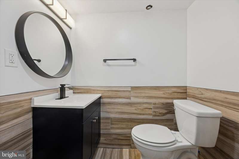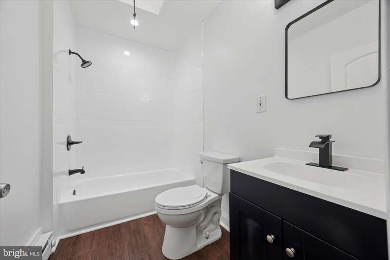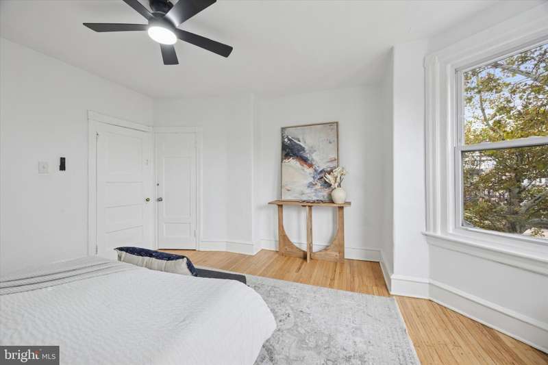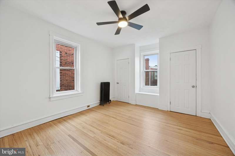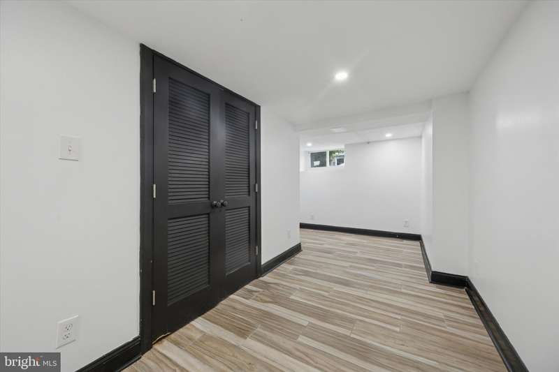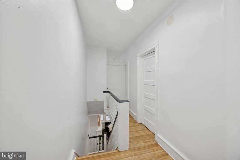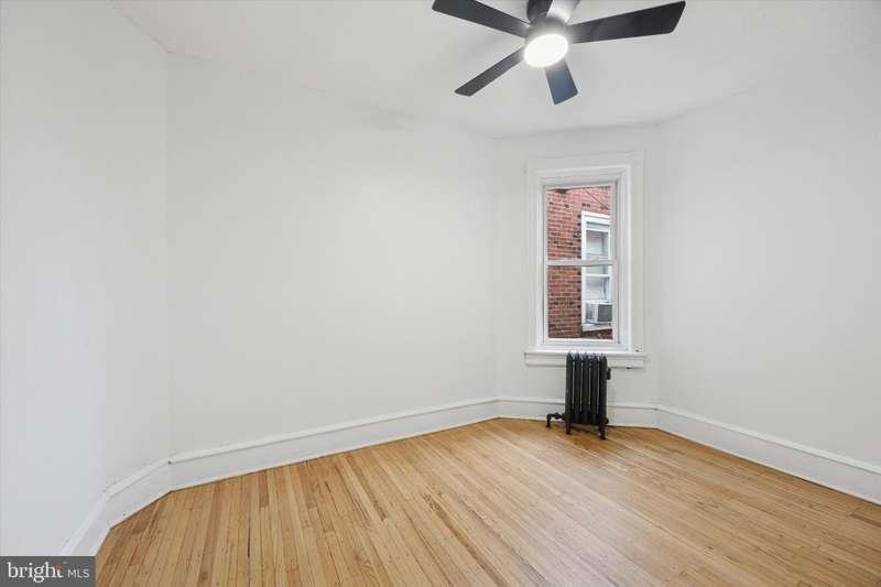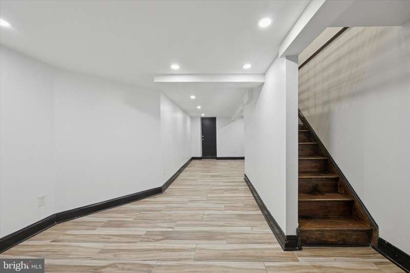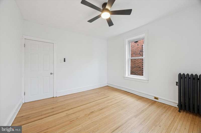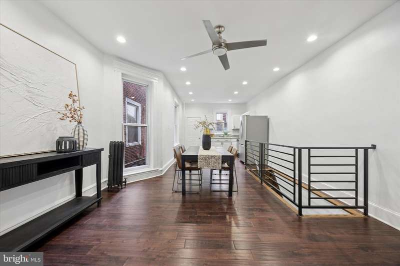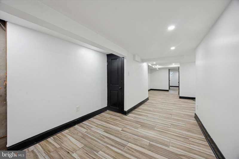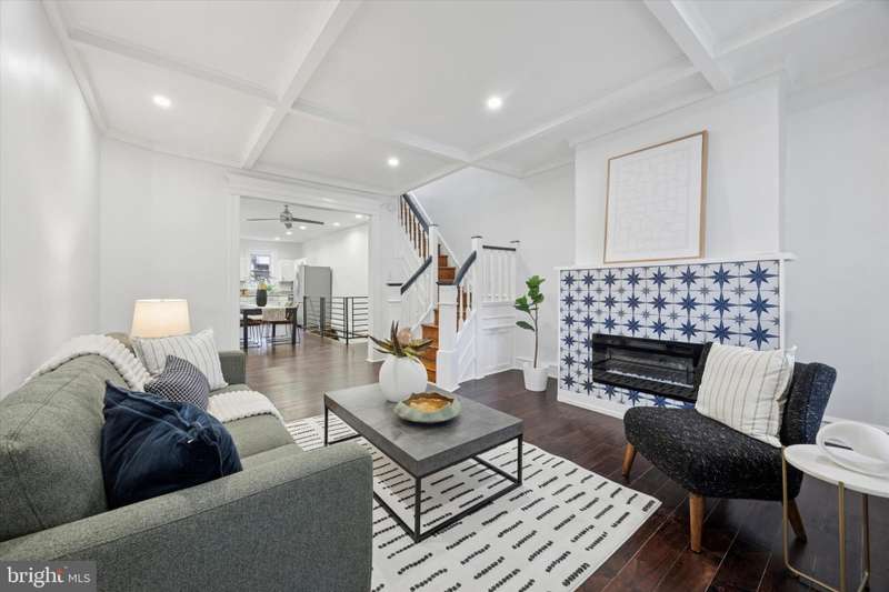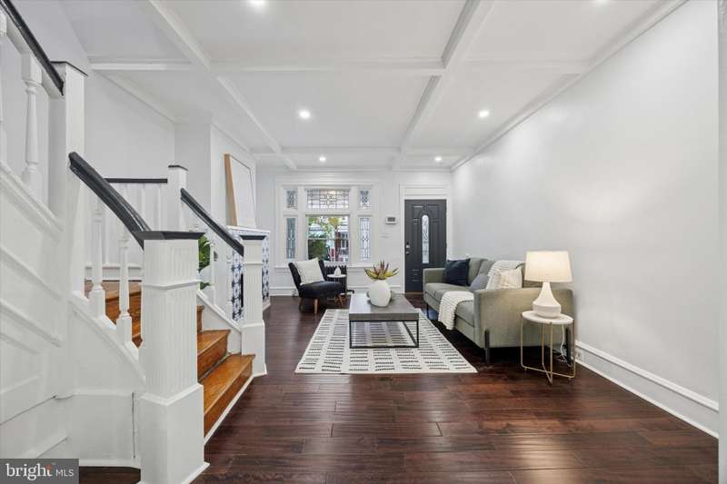 On one of the nicest blocks of Cobbs Creek, this rowhome has been updated where it counts while leaving plenty of charm intact. In the living room, the fresh white paint on the walls, coffered ceiling and original turned staircase make the leaded glass window and contemporary gas fireplace with cement tile surround blend perfectly together. The classic rowhome layout has been opened up, yet an extra-wide doorway with original dentil trim subtly separating the living and dining rooms was preserved, as was a sweet under-stair closet with original door. Oversized windows, including a floor-to-ceiling one in the dining room, flood the entire floor with natural light. The rear kitchen has freshly painted cabinets, handsome granite countertops with stainless steel undermount sink and stainless steel Whirlpool appliances including a five-burner range and French door fridge. A mudroom with extra storage space opens to the nicely sized rear yard. The finished basement with wood grain tile runs the full length of the house, offering two different hang zones separated by a powder room, a large mechanical closet, plus room left for storage. The second floor has gorgeous freshly refinished narrow-plank oak floors throughout the three bedrooms and hallway. The primary bedroom has a lovely bay window, the rear bedroom has two exposures including a charming window bench seat flanked by closets, and the middle true bedroom gets nice eastern light. Ornate radiators give each room an extra touch of charm. The oh-so-fresh-and-clean hall bathroom has a functional skylight and a new contemporary vanity, mirror and all black hardware. This tree-lined street, one of the loveliest stretches of already lovely Larchwood Ave, is in the heart of Cobbs Creek and is convenient to greenspace, shopping and public transit.