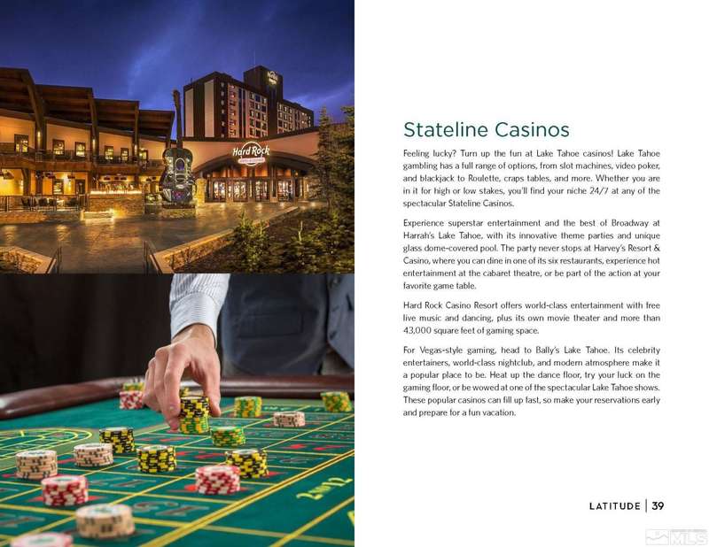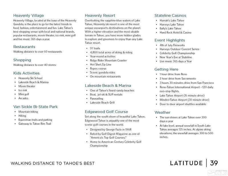 Incredible opportunity for commercial, condominium or hospitality development in the coveted Stateline Corridor in tax-friendly Nevada. Walking distance to the Heavenly Village, Stateline Casinos, Edgewood Golf Course, over 3,000 hotel rooms and directly across the street from the thriving new 5,200 person Tahoe Blue Event Center providing walking access to world-class skiing, golfing, boating, dining, nightlife, Property approved with active TRPA permit for 40-unit luxury residences, restaurant and outlet., 110 Lake Parkway has an active TRPA permit for an upscale mixed use residences development featuring: 40 residential units totaling 117,724 square feet Building footprint 41,523 square feet Total floor area 230,145 square feet Project land coverage of 57,645 square feet Two levels of underground parking with 119 spaces Elevator access to residential units from underground parking Club level features 26,789 square feet of amenities space, featuring a fitness center, kids' zone, theater, club room, TV lounge, board rooms, golf simulator, and outdoor gathering spaces Restaurant and Outfitter space Amenities featuring a pool, fitness center, lounge area, business center and condo-hotel front desk.