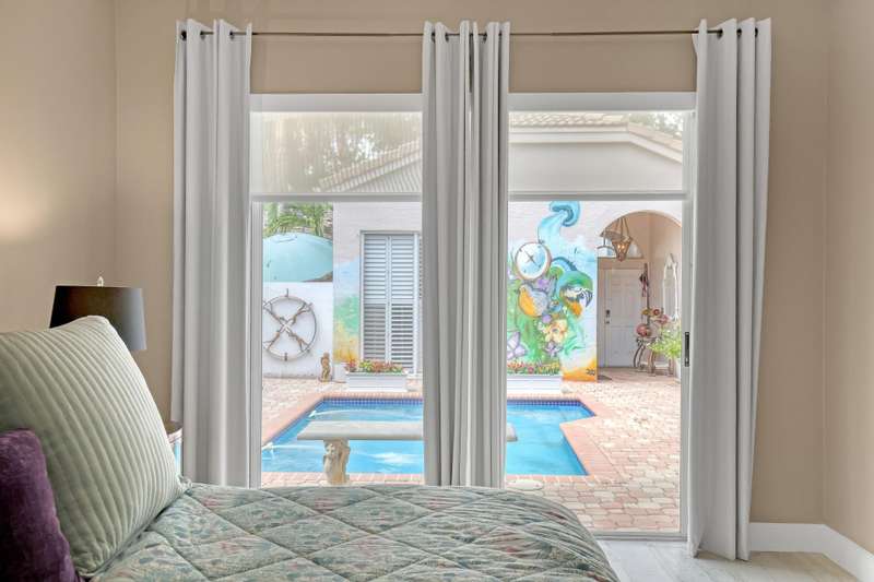 Step into a world of style, comfort and privacy in this beautifully designed 2-bedroom 2- bathroom residence plus 1- bedroom 1- bathroom guest cottage. The home embraces a sun-drenched courtyard pool, bringing the outdoors in, so everyday feels like a resort getaway. The Primary suite is a true retreat, with pool views a generous walk-in closet, a spa inspired bath complete with Roman tub, dual vanities and a separate shower. The second bedroom currently functions as a den with a desk and built in-shelves. Entertain with ease in the formal dining room overlooking a tranquil Zen garden. The guest cottage adds another layer of versatility, complete with a kitchenette, private bedroom, bath and direct pool access ideal for visitors, extended family, or creative studio.