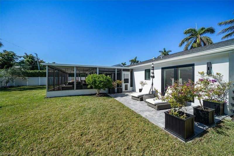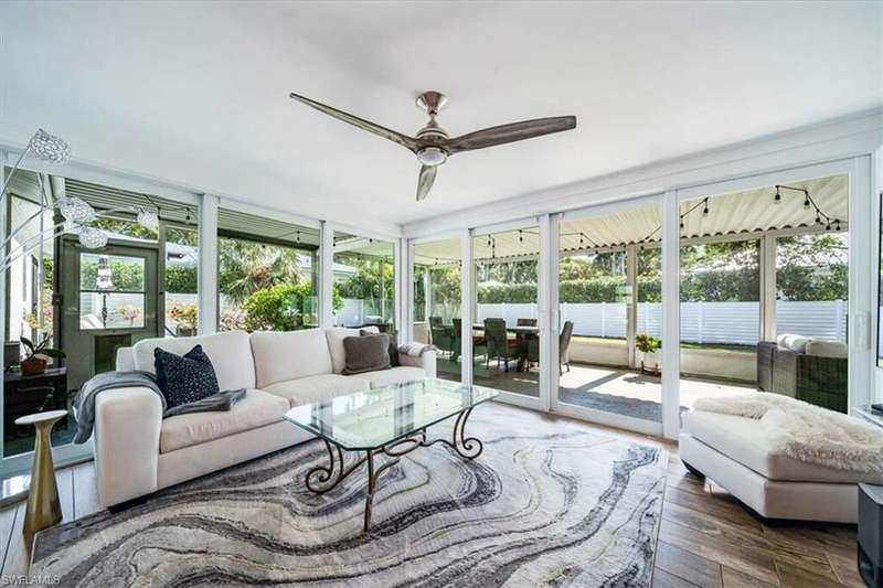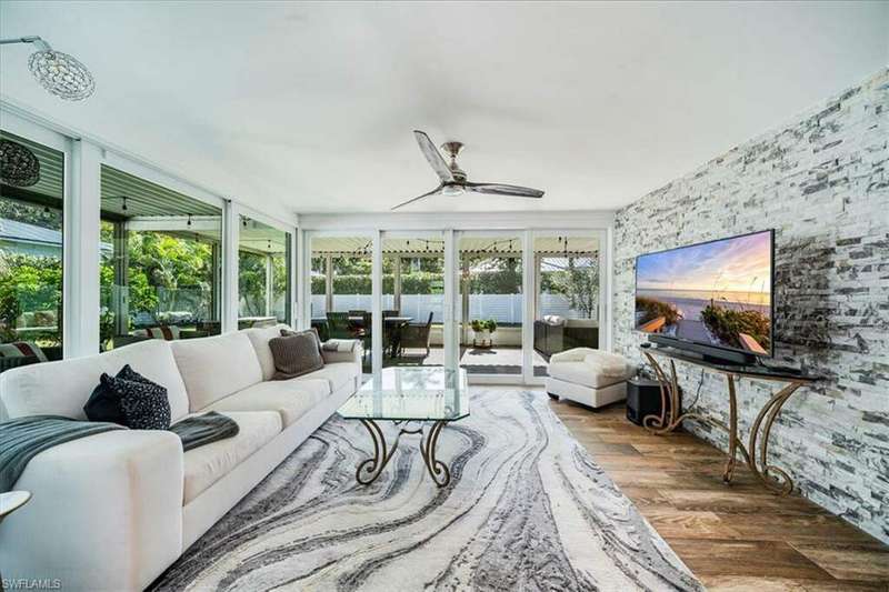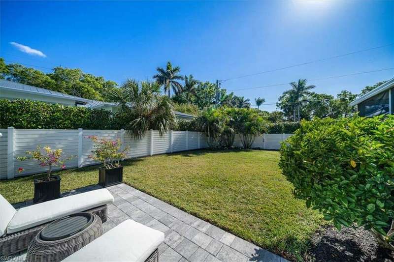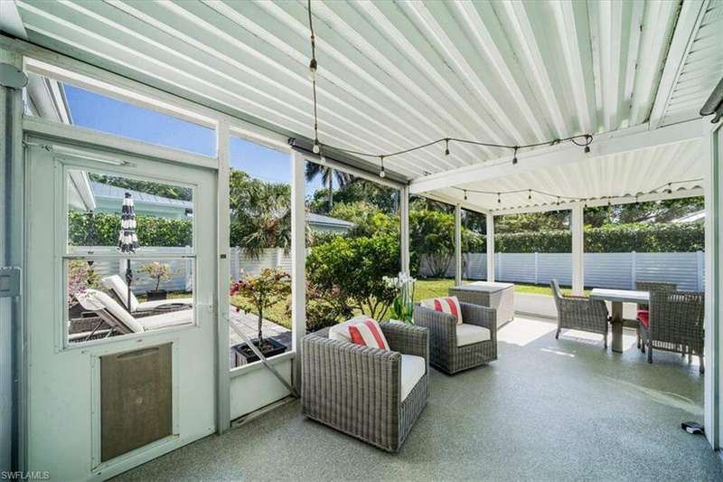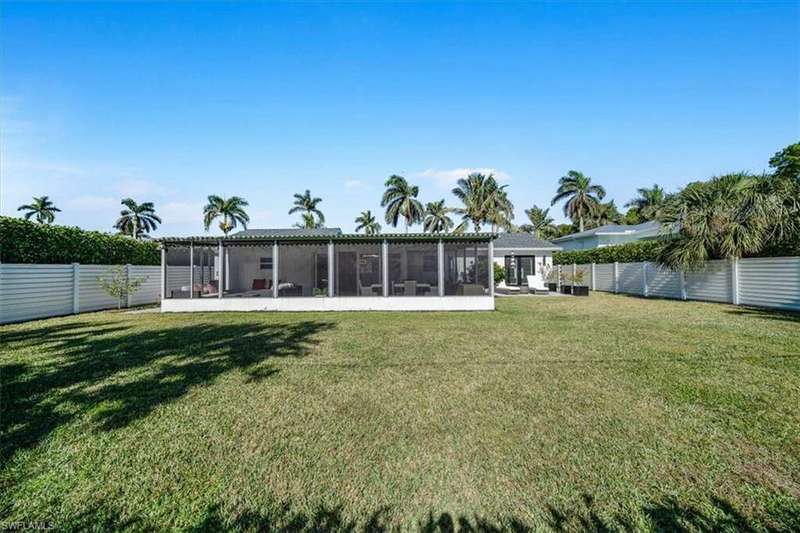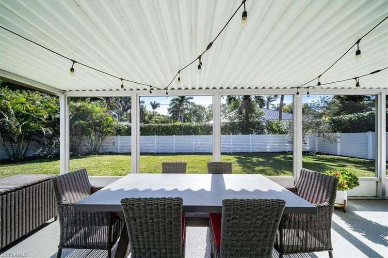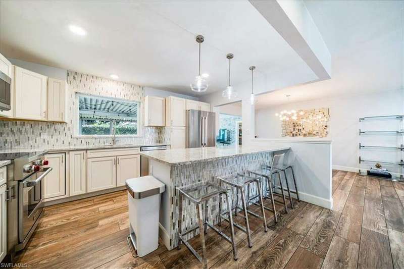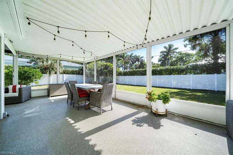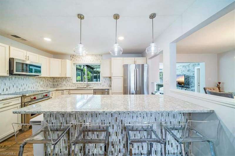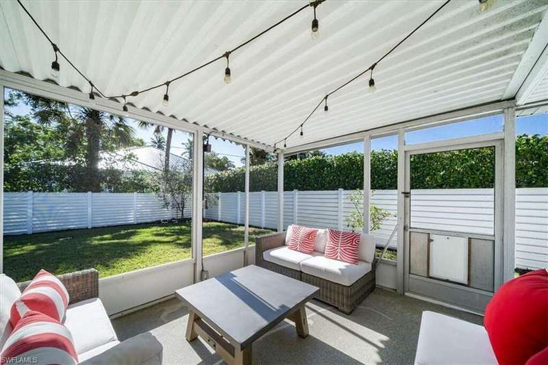 Gorgeous curb appeal!! This absolutely charming 3-bedroom, 2-bath ranch-style home in the desirable Lake Park neighborhood boasts stunning curb appeal with a freshly painted white exterior, bold black trim, main roof is asphalt shingles, metal lanai roof, and tasteful wood detailing accents. The inviting front porch, new light fixtures, and paver driveway with governors circle driveway for extra cars enhance the welcoming aesthetic. The beautifully landscaped yard is framed by newer white PVC privacy fencing and a gated rear yard. Decorative metal rain gutter downspouts add a touch of sophistication, creating a Santa Barbara-inspired exterior that feels crisp and contemporary. Inside, the open-concept layout is modernized with seamless "wood-look" tile plank flooring throughout, the kitchen features lighter creamy cabinetry, a tiled backsplash, breakfast bar, and high-end appliances including a WOLF induction cooktop, BOSCH dishwasher, and French door refrigerator/freezer. The owner's suite offers an en-suite bath and dual closets, while the guest suite opens to a paver patio overlooking the private backyard. The renovated guest bathroom includes white tiled shower walls accented with mosaic bands, a floating double-sink vanity, and extra storage. A glass-enclosed family room with tile plank floors, a stone accent wall, and a ceiling fan provides additional living space, while the screen-enclosed porch with epoxy flooring and string lights is perfect for relaxing or entertaining. The oversized 1.5 garage features built-in storage rack and the enclosed laundry room is equipped with Samsung front-loading washer and dryer. With its lushly landscaped and private backyard, proximity to top-rated schools, trendy restaurants, and Naples' sunny beaches, this home offers a perfect blend of classic charm and modern living in a highly sought-after walking community.