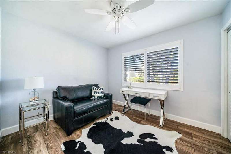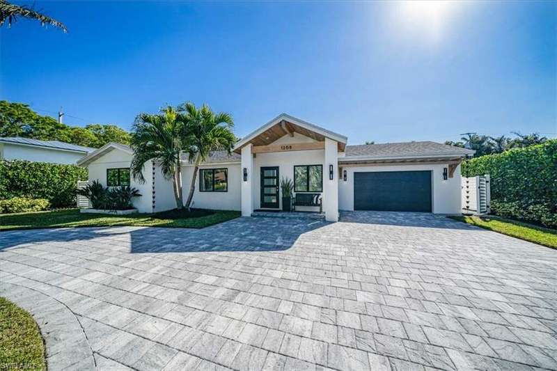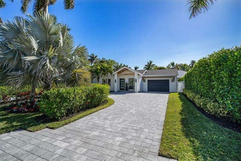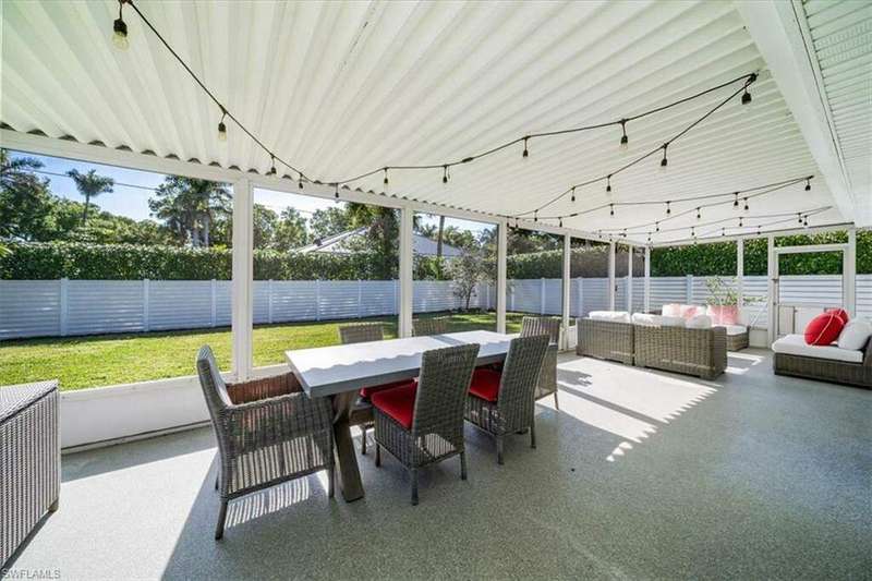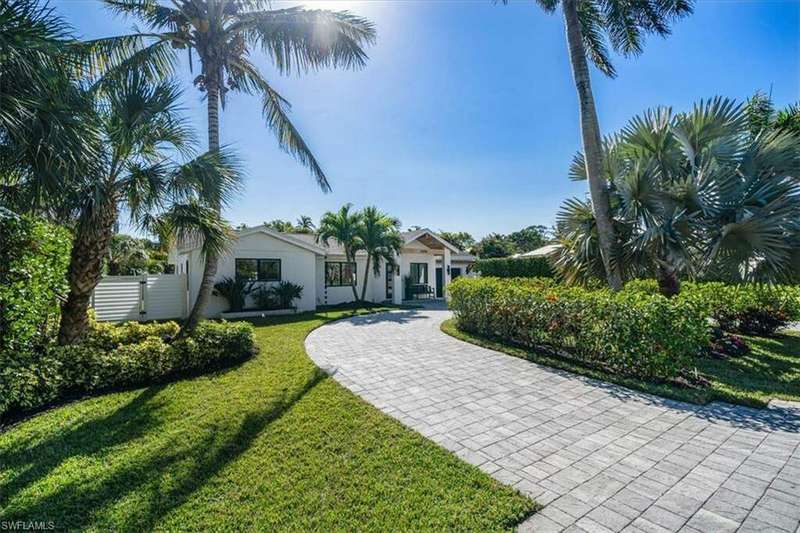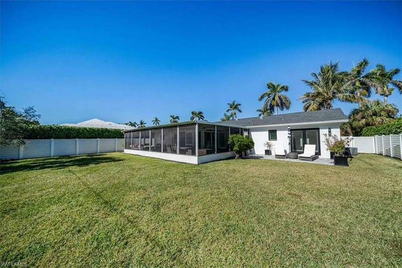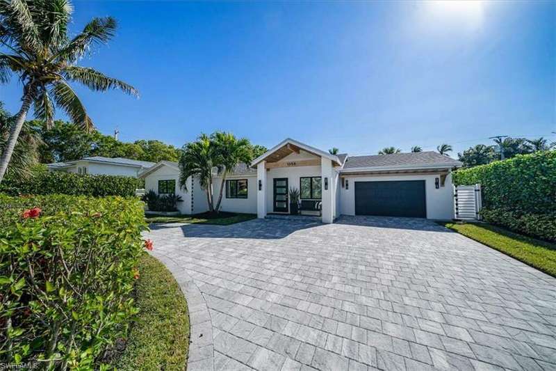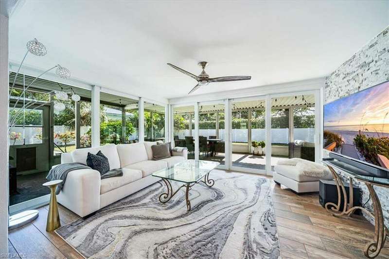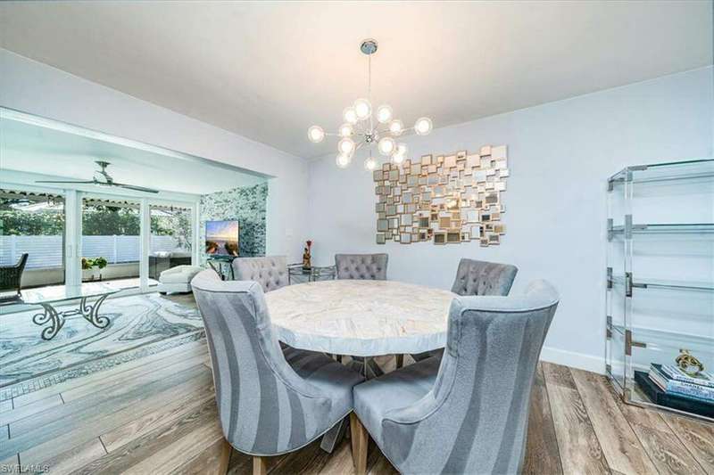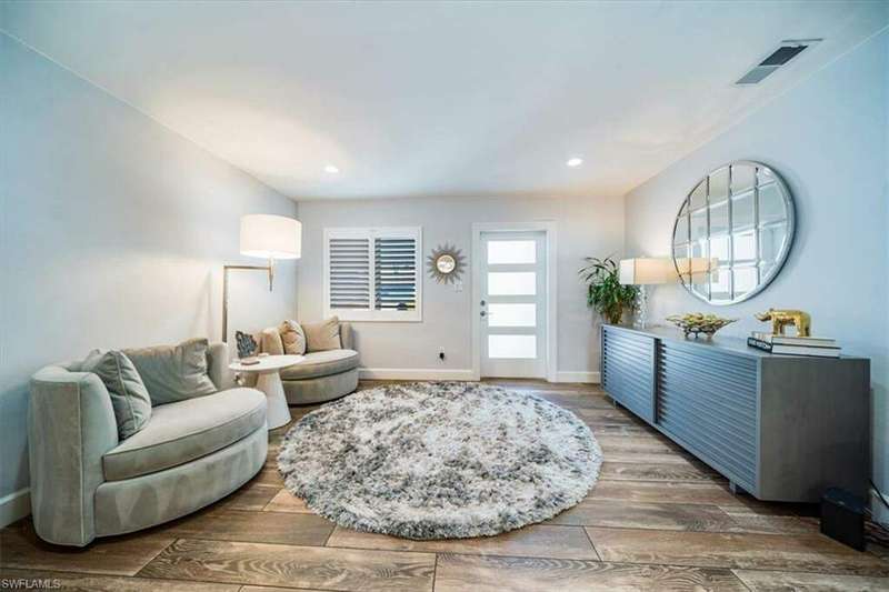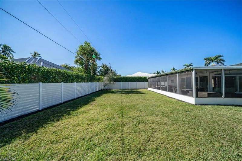 Gorgeous curb appeal!! This absolutely charming 3-bedroom, 2-bath ranch-style home in the desirable Lake Park neighborhood boasts stunning curb appeal with a freshly painted white exterior, bold black trim, main roof is asphalt shingles, metal lanai roof, and tasteful wood detailing accents. The inviting front porch, new light fixtures, and paver driveway with governors circle driveway for extra cars enhance the welcoming aesthetic. The beautifully landscaped yard is framed by newer white PVC privacy fencing and a gated rear yard. Decorative metal rain gutter downspouts add a touch of sophistication, creating a Santa Barbara-inspired exterior that feels crisp and contemporary. Inside, the open-concept layout is modernized with seamless "wood-look" tile plank flooring throughout, the kitchen features lighter creamy cabinetry, a tiled backsplash, breakfast bar, and high-end appliances including a WOLF induction cooktop, BOSCH dishwasher, and French door refrigerator/freezer. The owner's suite offers an en-suite bath and dual closets, while the guest suite opens to a paver patio overlooking the private backyard. The renovated guest bathroom includes white tiled shower walls accented with mosaic bands, a floating double-sink vanity, and extra storage. A glass-enclosed family room with tile plank floors, a stone accent wall, and a ceiling fan provides additional living space, while the screen-enclosed porch with epoxy flooring and string lights is perfect for relaxing or entertaining. The oversized 1.5 garage features built-in storage rack and the enclosed laundry room is equipped with Samsung front-loading washer and dryer. With its lushly landscaped and private backyard, proximity to top-rated schools, trendy restaurants, and Naples' sunny beaches, this home offers a perfect blend of classic charm and modern living in a highly sought-after walking community.