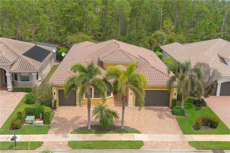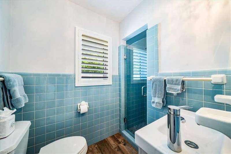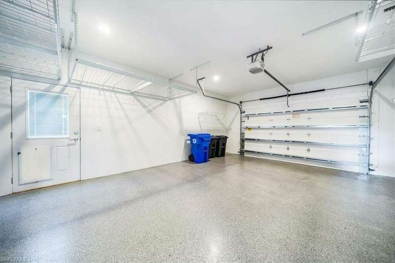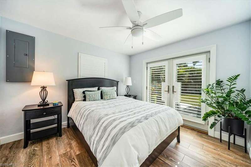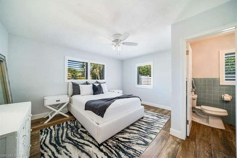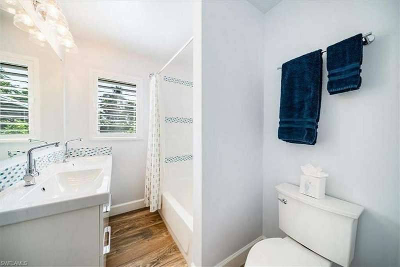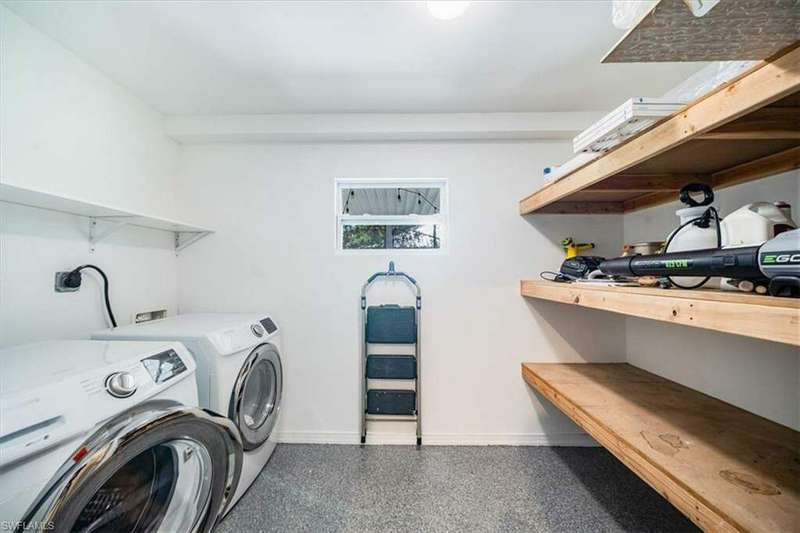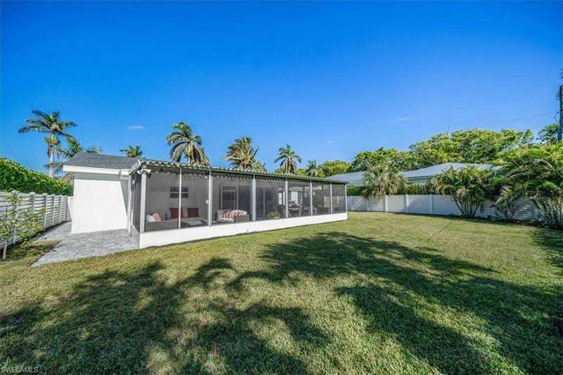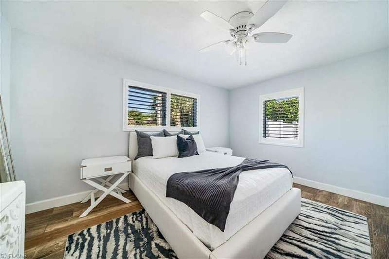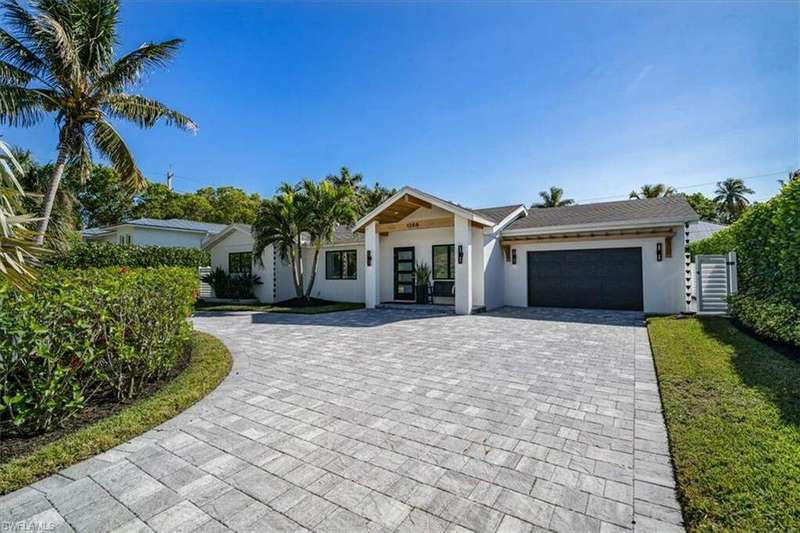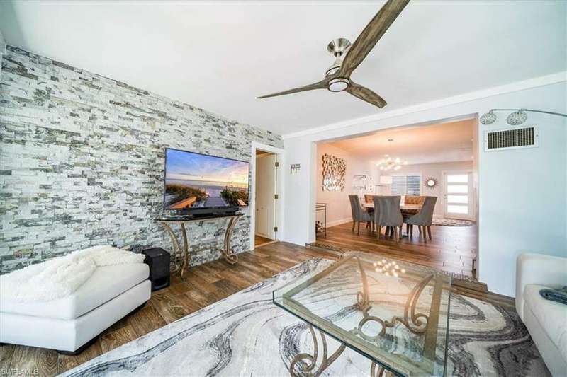 Gorgeous curb appeal!! This absolutely charming 3-bedroom, 2-bath ranch-style home in the desirable Lake Park neighborhood boasts stunning curb appeal with a freshly painted white exterior, bold black trim, main roof is asphalt shingles, metal lanai roof, and tasteful wood detailing accents. The inviting front porch, new light fixtures, and paver driveway with governors circle driveway for extra cars enhance the welcoming aesthetic. The beautifully landscaped yard is framed by newer white PVC privacy fencing and a gated rear yard. Decorative metal rain gutter downspouts add a touch of sophistication, creating a Santa Barbara-inspired exterior that feels crisp and contemporary. Inside, the open-concept layout is modernized with seamless "wood-look" tile plank flooring throughout, the kitchen features lighter creamy cabinetry, a tiled backsplash, breakfast bar, and high-end appliances including a WOLF induction cooktop, BOSCH dishwasher, and French door refrigerator/freezer. The owner's suite offers an en-suite bath and dual closets, while the guest suite opens to a paver patio overlooking the private backyard. The renovated guest bathroom includes white tiled shower walls accented with mosaic bands, a floating double-sink vanity, and extra storage. A glass-enclosed family room with tile plank floors, a stone accent wall, and a ceiling fan provides additional living space, while the screen-enclosed porch with epoxy flooring and string lights is perfect for relaxing or entertaining. The oversized 1.5 garage features built-in storage rack and the enclosed laundry room is equipped with Samsung front-loading washer and dryer. With its lushly landscaped and private backyard, proximity to top-rated schools, trendy restaurants, and Naples' sunny beaches, this home offers a perfect blend of classic charm and modern living in a highly sought-after walking community.
