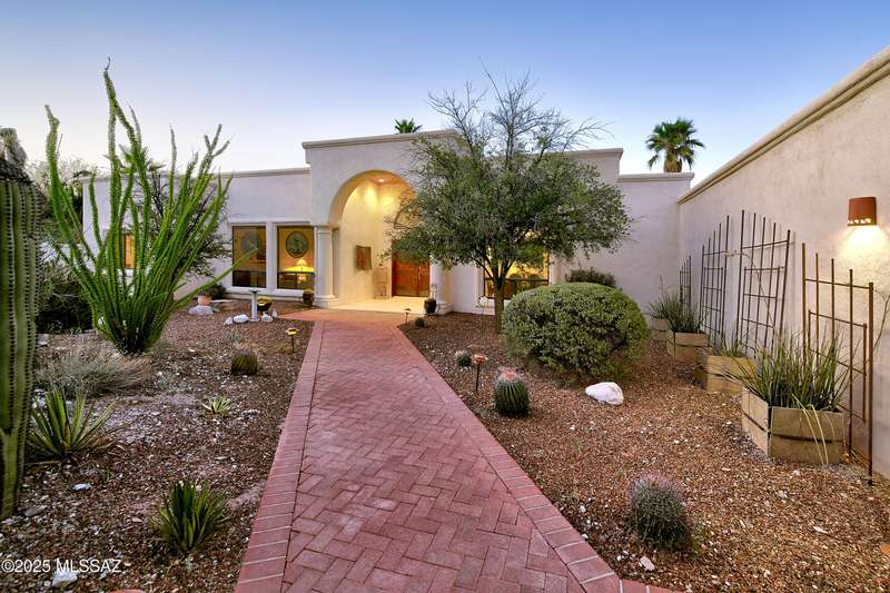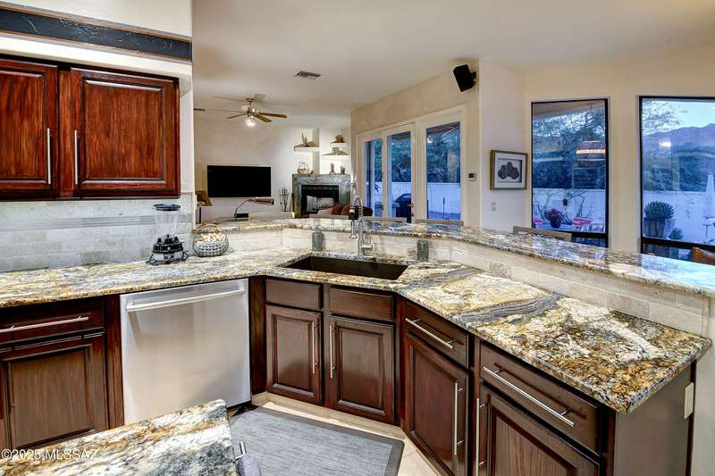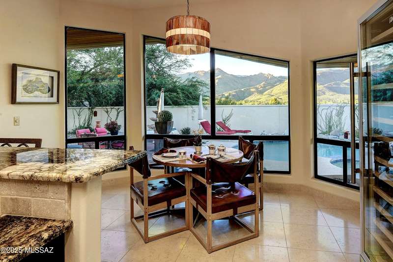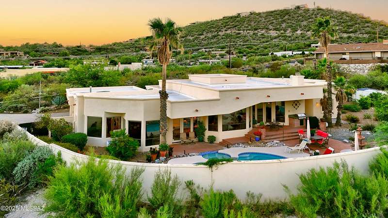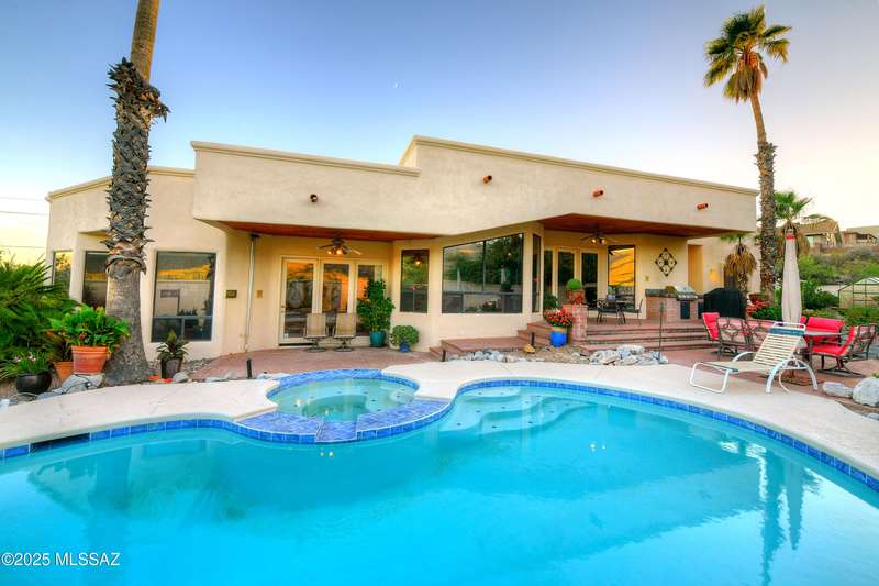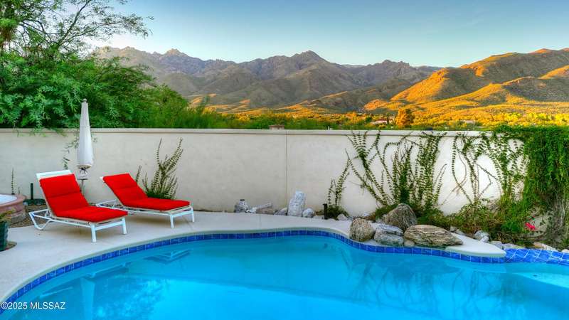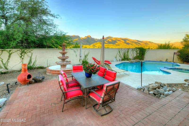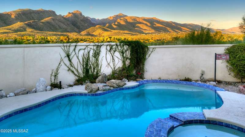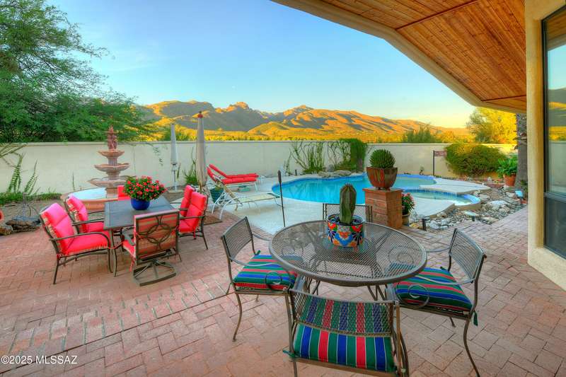 Sweeping mountain views, fantastic finishes and a beautiful backyard oasis welcome you to this inviting retreat on a raised foothills lot. Sky high covered entry and double doors flow into formal living & dining spaces, perfect for entertaining. Gorgeous kitchen with granite counters, SS appliances, gas cooktop & sunny breakfast nook. Just beyond the spacious greatroom offers a cozy fireplace, wet bar & soaring windows framing the view & French doors to the backyard. Step outside to enjoy Tucson living at its finest with sparkling pool, expansive sideyard, large covered patio & extended pavers ideal for outdoor gatherings. Generous primary with lovely sitting area is a relaxing escape. Huge laundry room with ample storage. 3-car garage. A truly wonderfully designed home.