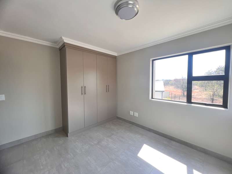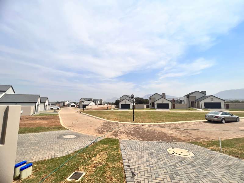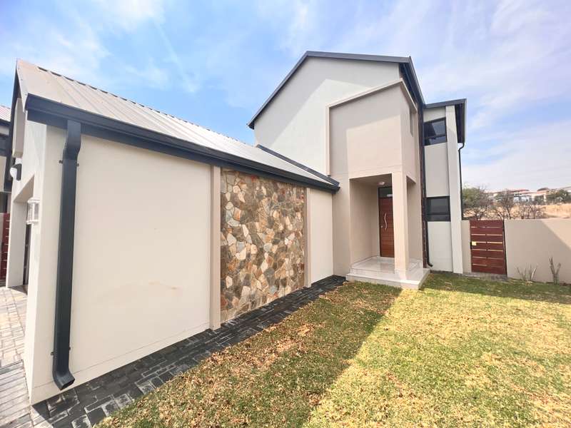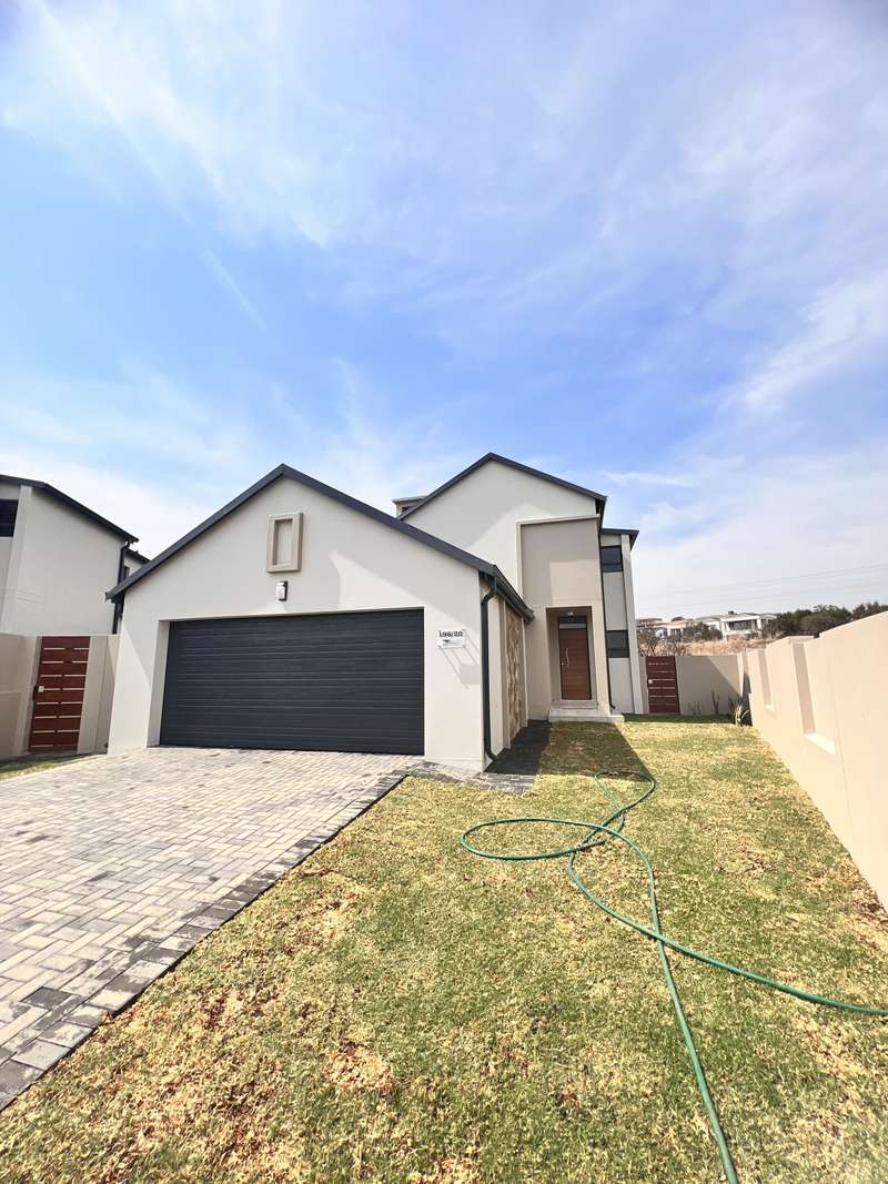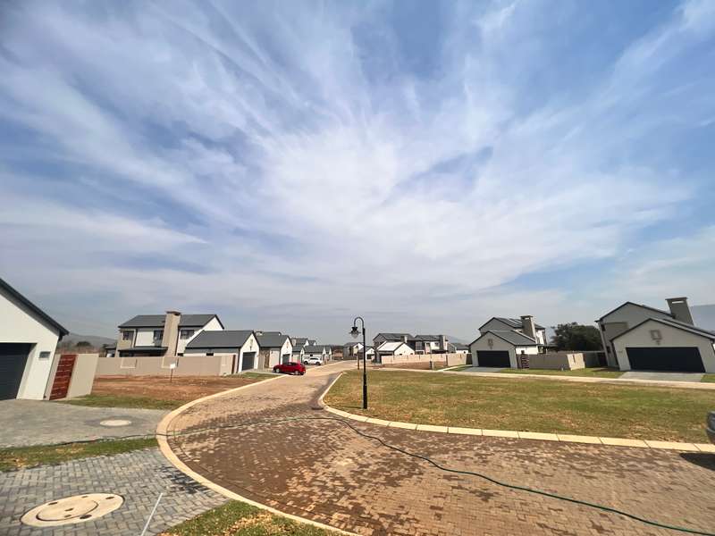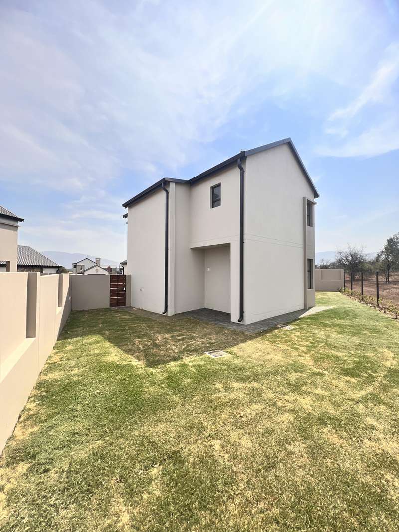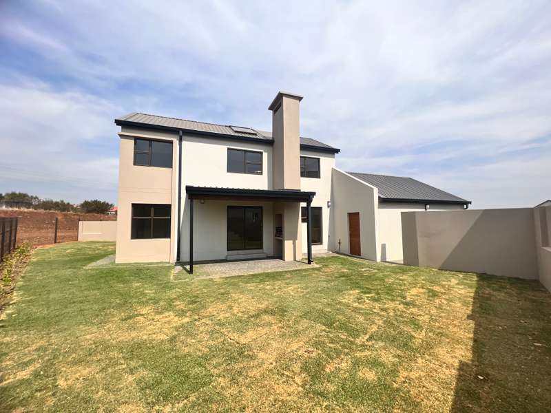 La Camargue ~~ Private Country Estate ~~ Part of a wildlife security Estate, where Blesbuck, Nyala, Impala, Springbok, Wildebeest roaming around freely.There is a village, with smaller stands, within the Estate with the advantages of one of the larger stands, (wildlife, walking trails, parks, security - face detection, electric fence, 24 hours vehicle patrol and future clubhouse,There are still open stands, if you prefer to build yourself. This double storey ~ three bedroom home, with living area downstairs and three bedrooms upstairs are available. The main bedroom has a full en-suite bathroom. The other two bedrooms share a bathroom, but there is a bonus, of a separate guest toilet downstairs. The kitchen has a gas stove, pantry and granite tops. The modern open plan living area, walk out on a patio, with a braai and the back yard. Call me now for viewing Arrangement......
