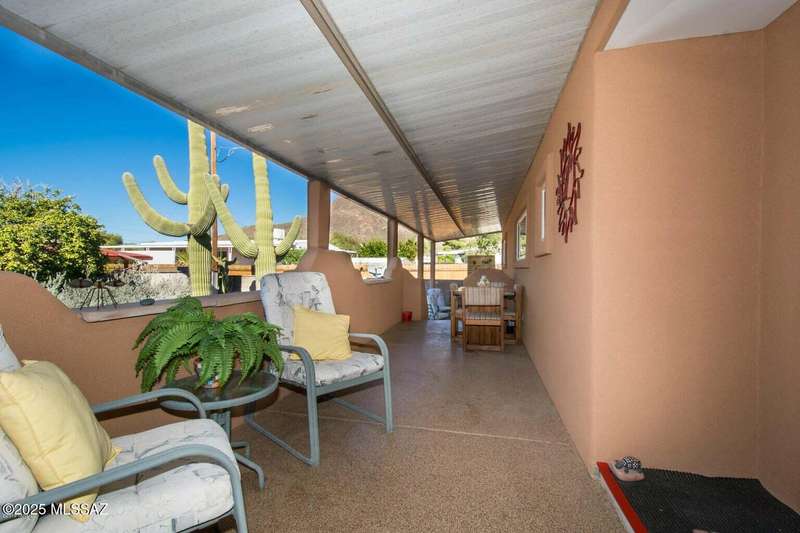 Wonderful remodeled home in the highly sought after Tucson Estates community! This great home has had many updates including stucco, built-in cabinets, built-in bar and an AZ room! Great for outdoor AND indoor entertaining. The covered patios on the West side offer beautiful views of the Tucson Mountains. Pavers in the front and on the East side. Carport is brand new! The patio has decorative epoxy coating. Southern exposure keeps the home warm all winter long and the bedrooms stay very cool. The best part is that YOU OWN THE LAND!