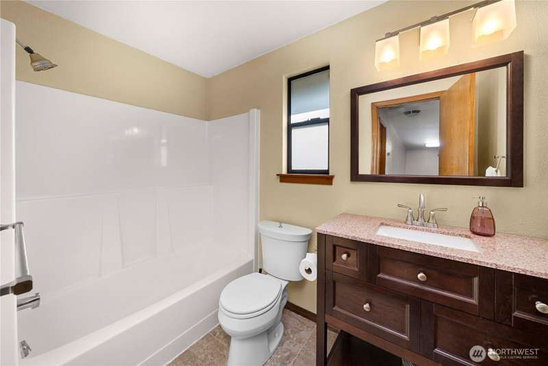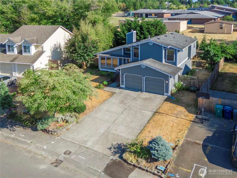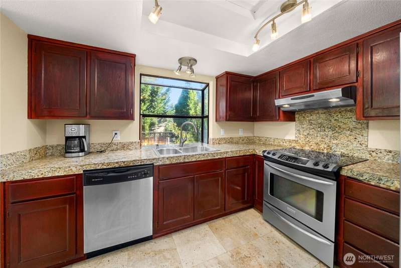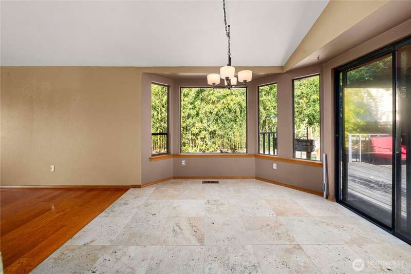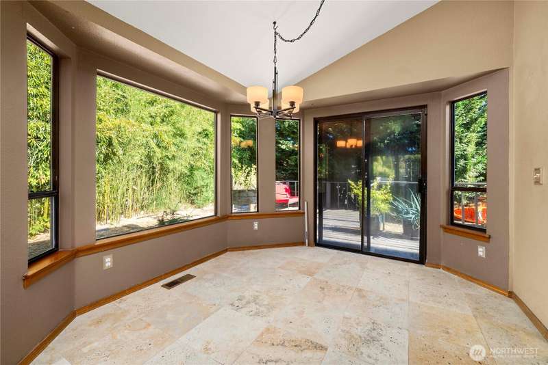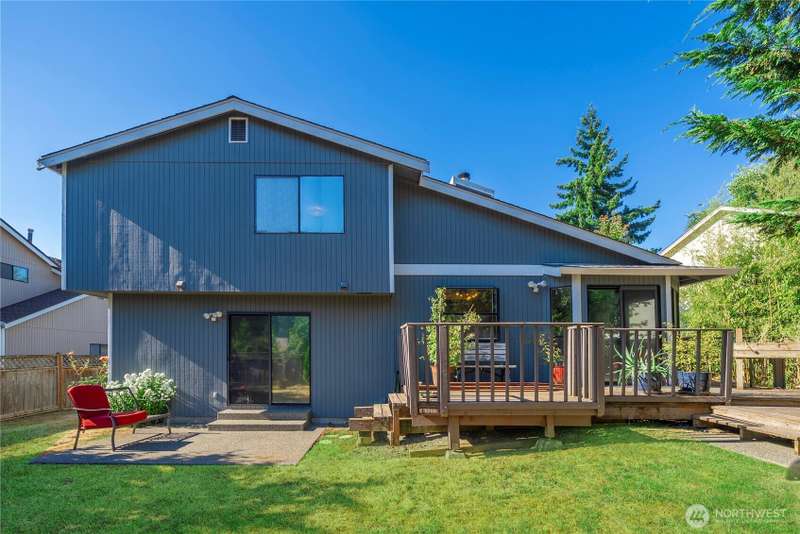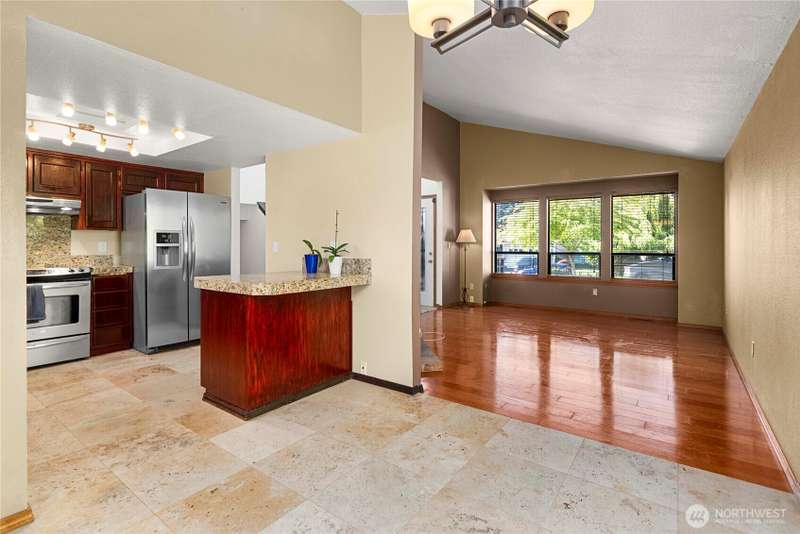 Discover the potential in this spacious tri-level home nestled in the desirable Alderbrook neighborhood! Featuring 3 bedrooms & 2.5 baths, this home offers a bright & open main level w/ high vaulted ceilings & skylight that brings in abundant natural light. Travertine tile in entry, dining room & kitchen. Upstairs, you'll find a generous primary suite w/ a private full bath, 2 additional bedrooms, & a full hallway bath w/ marble tile. The lower level includes a cozy family room, a convenient laundry area, & half bath w/ marble tile—perfect for everyday living. Step outside to a large deck overlooking the private backyard, ideal for relaxing or hosting. All this in a prime location close to shopping, dining, parks, schools, transit, & I-5.