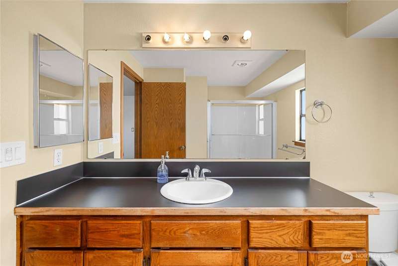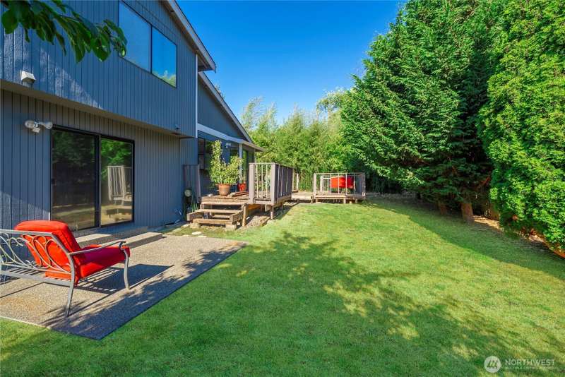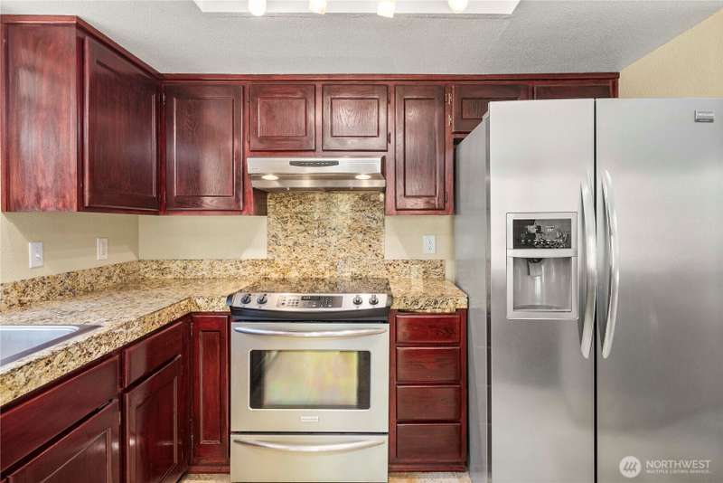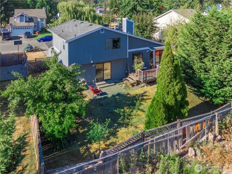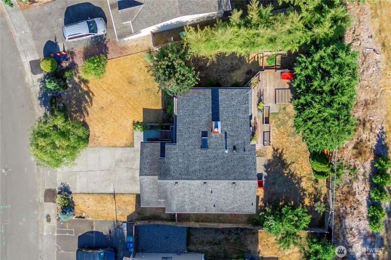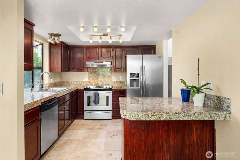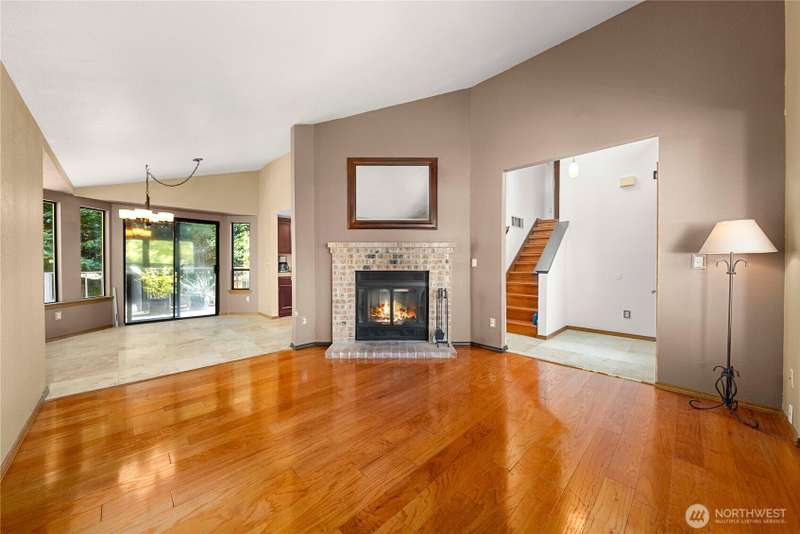 Discover the potential in this spacious tri-level home nestled in the desirable Alderbrook neighborhood! Featuring 3 bedrooms & 2.5 baths, this home offers a bright & open main level w/ high vaulted ceilings & skylight that brings in abundant natural light. Travertine tile in entry, dining room & kitchen. Upstairs, you'll find a generous primary suite w/ a private full bath, 2 additional bedrooms, & a full hallway bath w/ marble tile. The lower level includes a cozy family room, a convenient laundry area, & half bath w/ marble tile—perfect for everyday living. Step outside to a large deck overlooking the private backyard, ideal for relaxing or hosting. All this in a prime location close to shopping, dining, parks, schools, transit, & I-5.