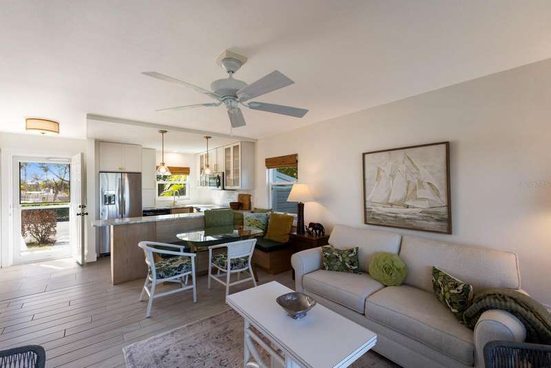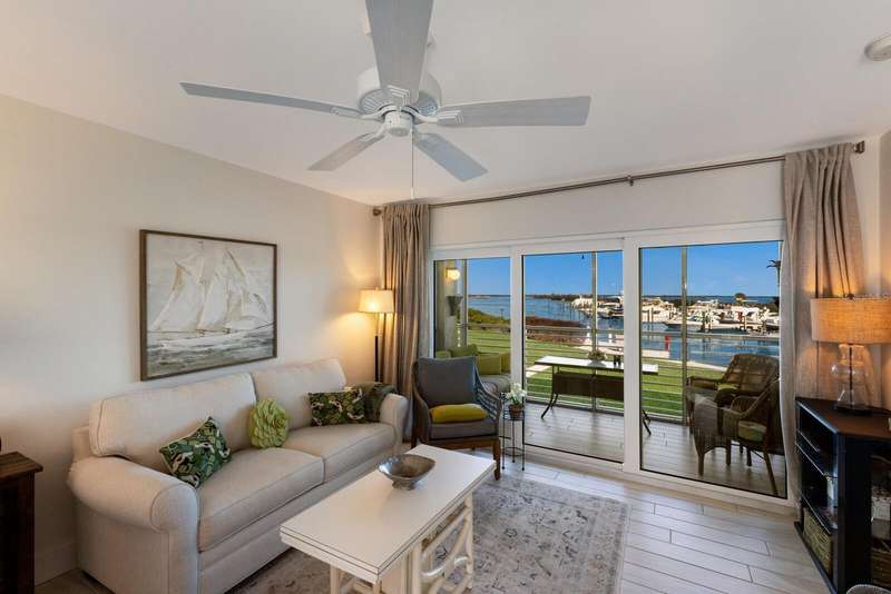 Enjoy a front row view of Charlotte Harbor! This one bedroom, one bath end unit was beautifully renovated in 2022. It boasts beautiful kitchen cabinets, custom built in bench seating with hidden locked owners storage, ocean beige dolomite kitchen counters ( harder than marble and more heat resistant than quartz). The bathroom has pompeii iscle quartz countertop. New AC in 2023! Sit on your screened in lanai and watch the flora and fauna entertain you during the day. Wake up to a majestic sunrise! Marina Village is a serene and beautiful setting!