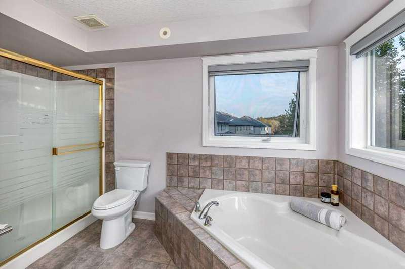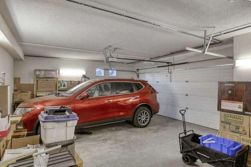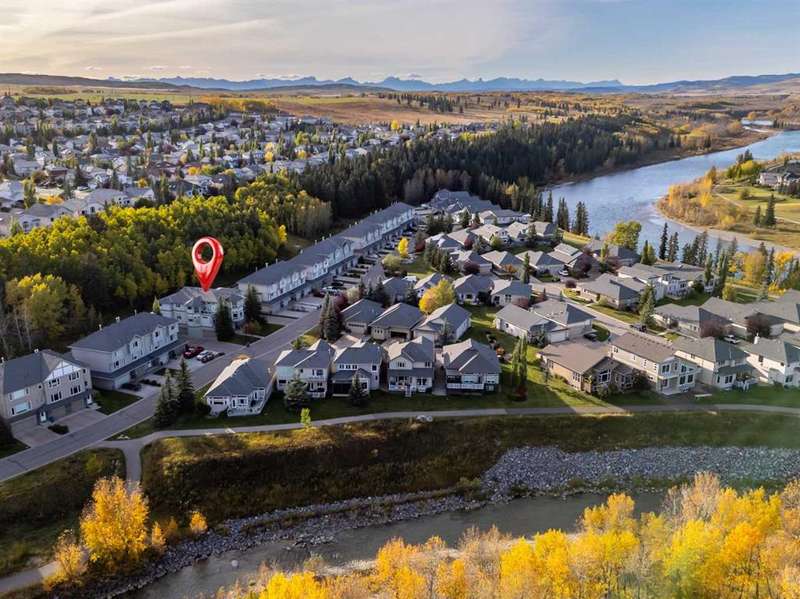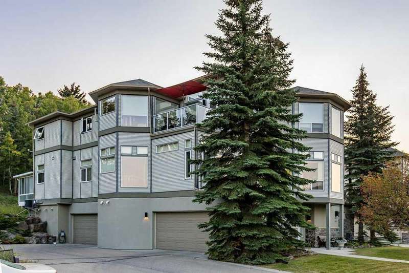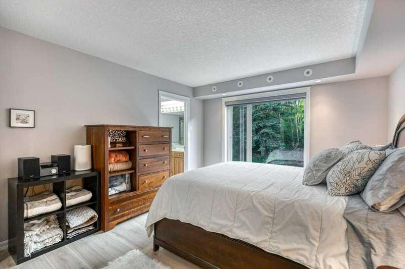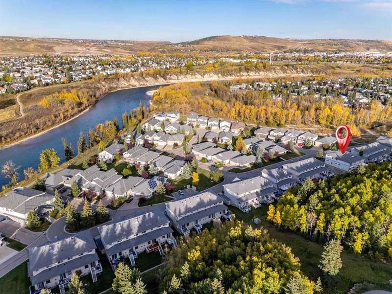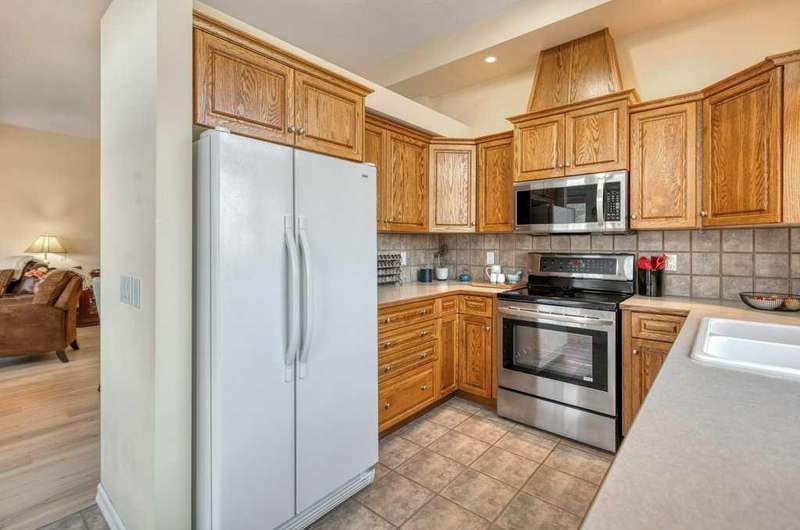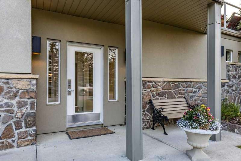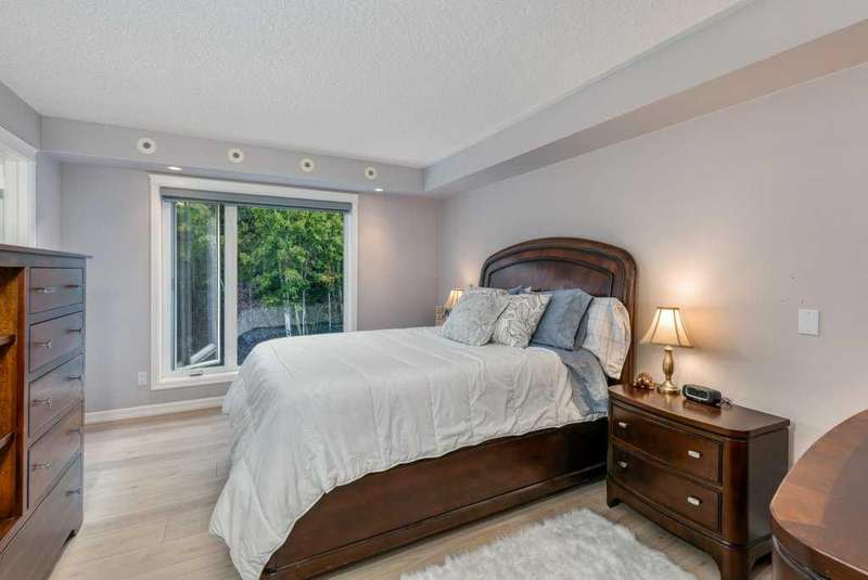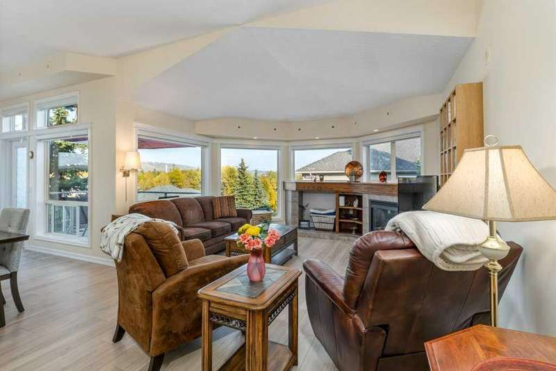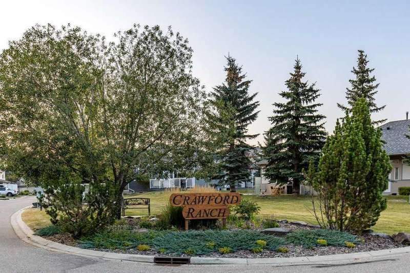 This is a rare opportunity to purchase a top-floor bungalow-style apartment with an oversized, heated double attached garage in the serene riverside community of Crawford Ranch. A secure, private 'New York' style elevator opens directly into your foyer, offering both convenience and privacy. The layout includes 10-foot ceilings, two bedrooms, and two full bathrooms. The living room features a cozy gas fireplace with built-ins, while the kitchen offers ample cabinetry, counter space, and access to a spacious deck. A separate dining area adds flexibility for everyday use or entertaining. The primary bedroom window backs onto a forested area, making it extremely private. The spacious ensuite includes a soaker tub, separate shower and large walk-in closet. The second bedroom and full bath are ideal for guests. In-suite laundry is located near the secondary exit, which leads directly to an outdoor greenspace. There is also the added bonus of a sink in the garage, with hot and cold water. Recent updates include a new hot water tank, new laminate flooring, new MET blinds (including some darkening blinds and motorized blinds) and custom cabinet work in the pantry & front closet. Steps from the river and walking paths, this home is well-suited for buyers seeking a practical, low-maintenance lifestyle in a quiet community.