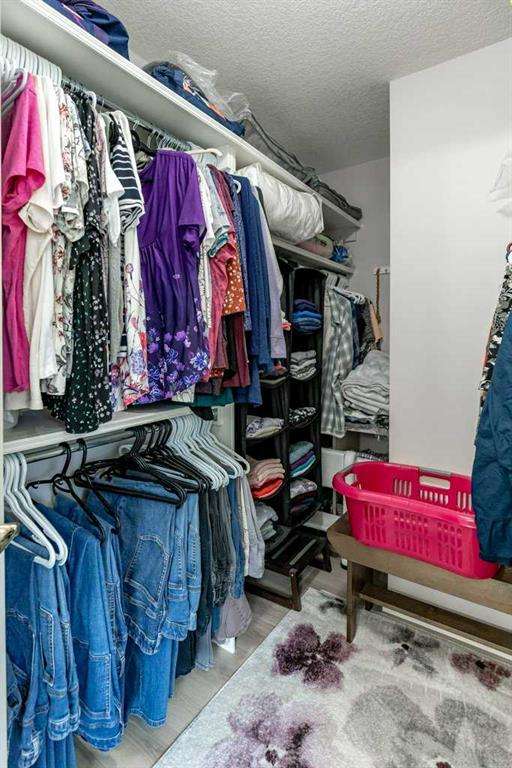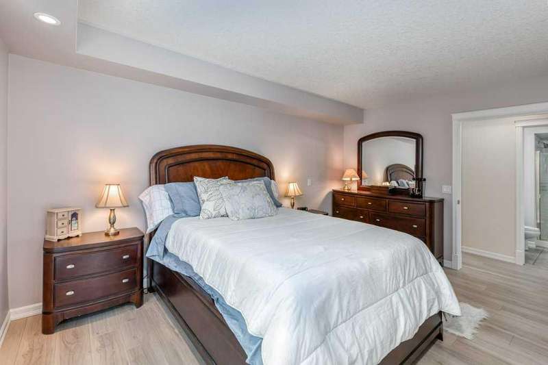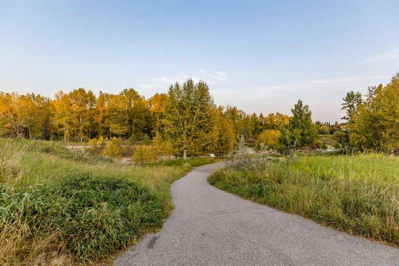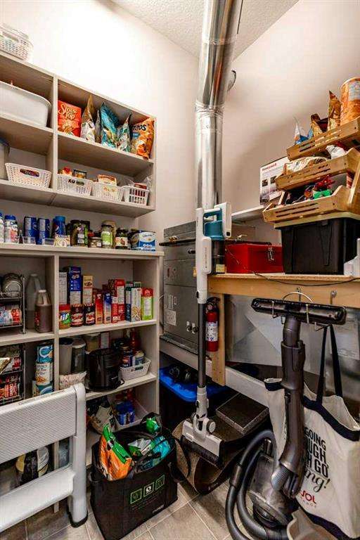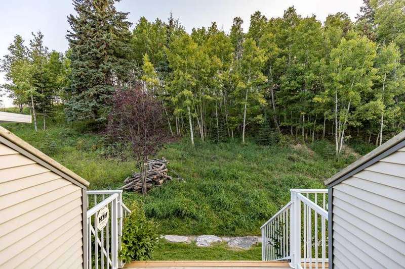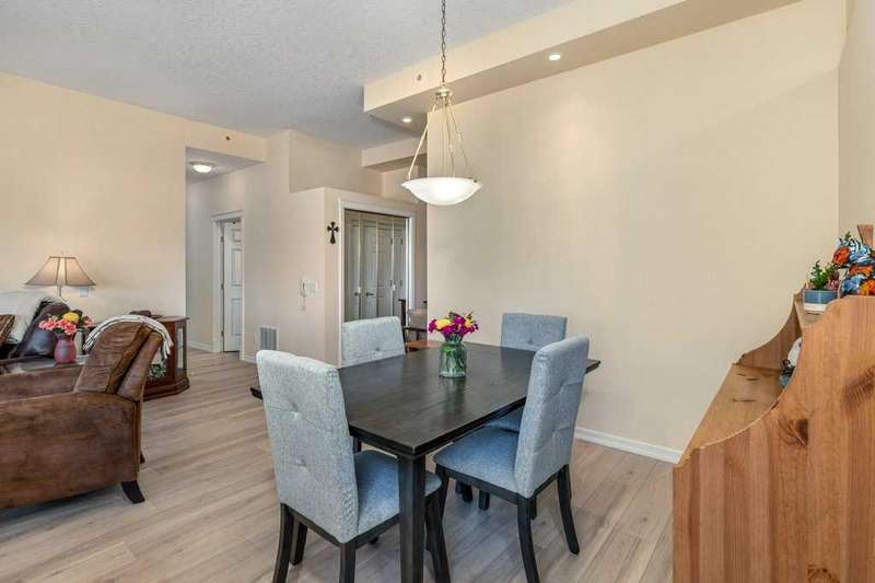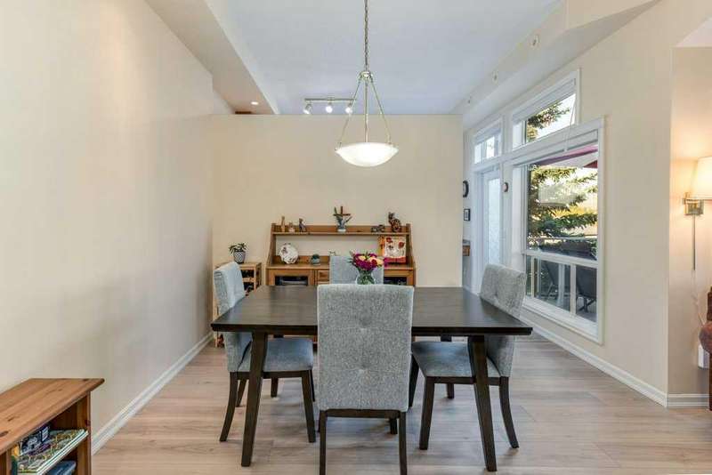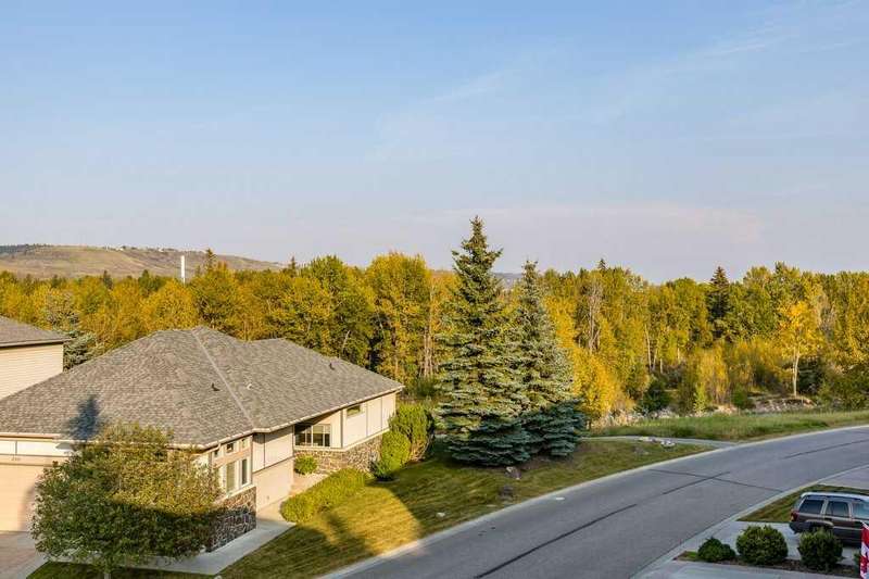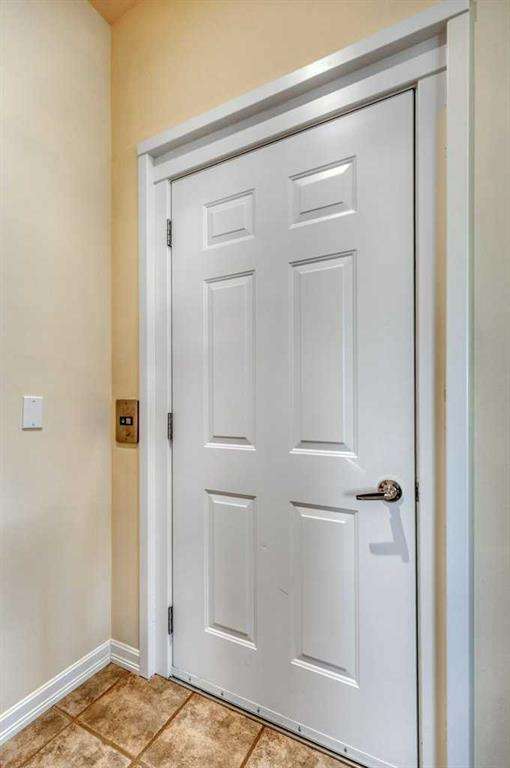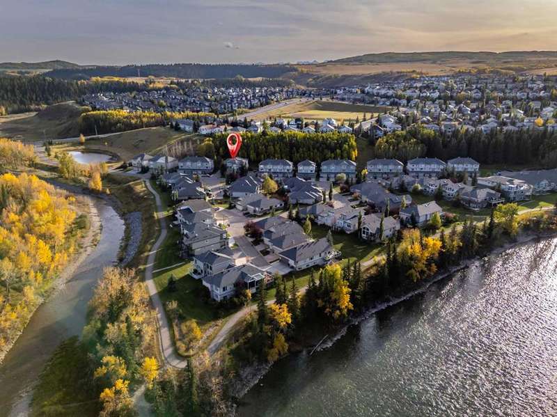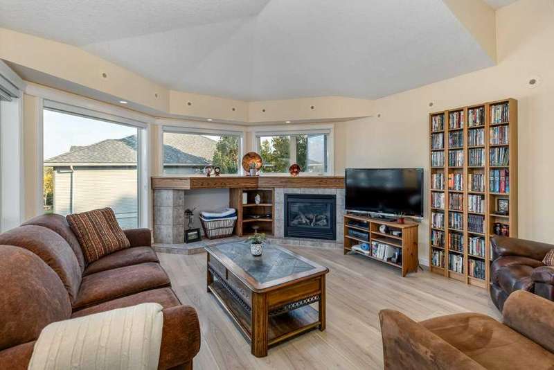 This is a rare opportunity to purchase a top-floor bungalow-style apartment with an oversized, heated double attached garage in the serene riverside community of Crawford Ranch. A secure, private 'New York' style elevator opens directly into your foyer, offering both convenience and privacy. The layout includes 10-foot ceilings, two bedrooms, and two full bathrooms. The living room features a cozy gas fireplace with built-ins, while the kitchen offers ample cabinetry, counter space, and access to a spacious deck. A separate dining area adds flexibility for everyday use or entertaining. The primary bedroom window backs onto a forested area, making it extremely private. The spacious ensuite includes a soaker tub, separate shower and large walk-in closet. The second bedroom and full bath are ideal for guests. In-suite laundry is located near the secondary exit, which leads directly to an outdoor greenspace. There is also the added bonus of a sink in the garage, with hot and cold water. Recent updates include a new hot water tank, new laminate flooring, new MET blinds (including some darkening blinds and motorized blinds) and custom cabinet work in the pantry & front closet. Steps from the river and walking paths, this home is well-suited for buyers seeking a practical, low-maintenance lifestyle in a quiet community.