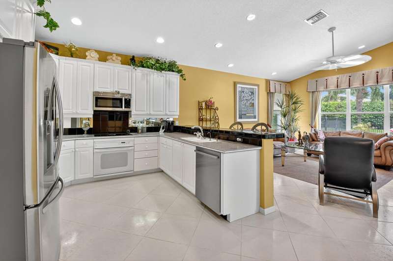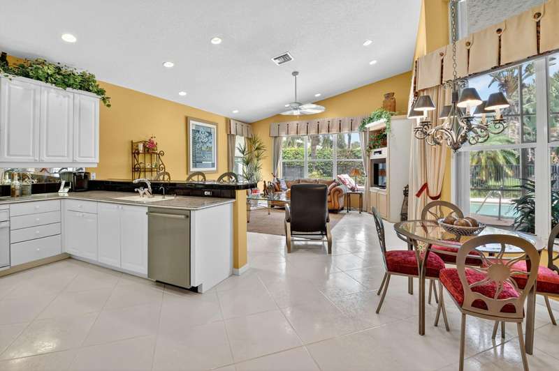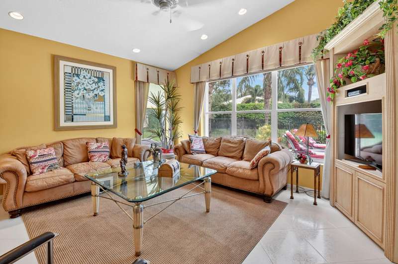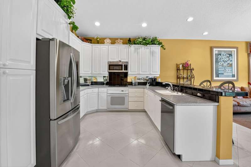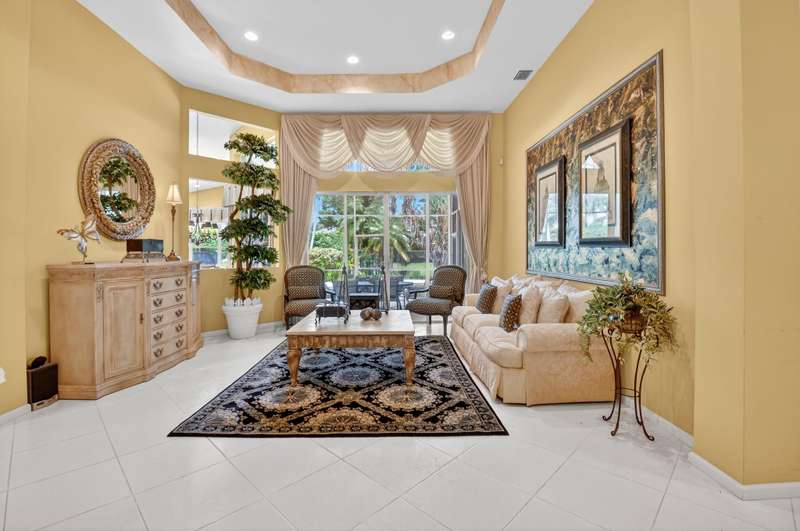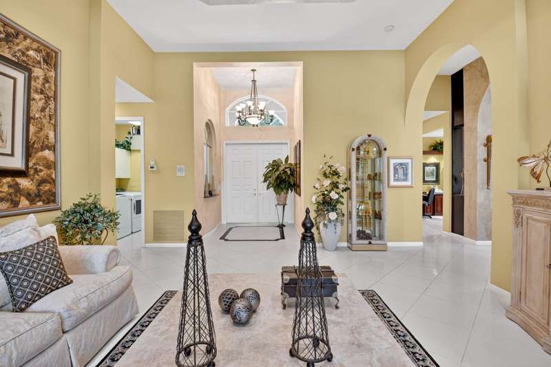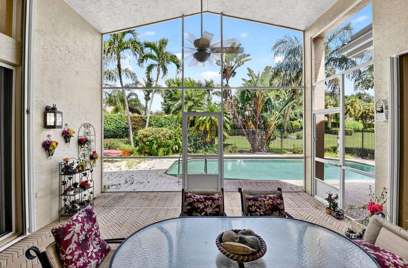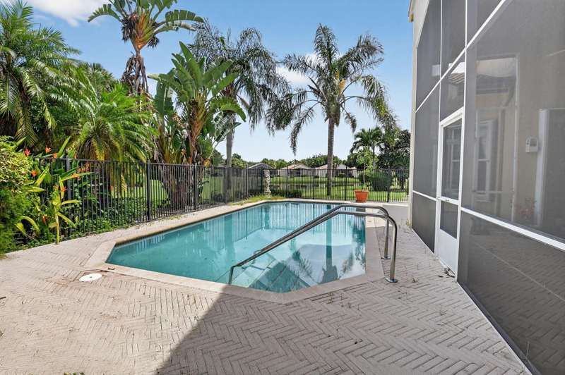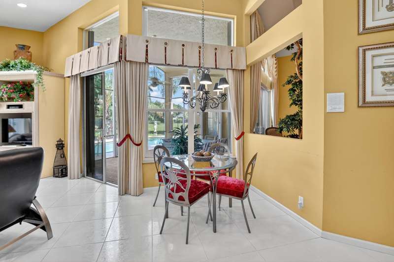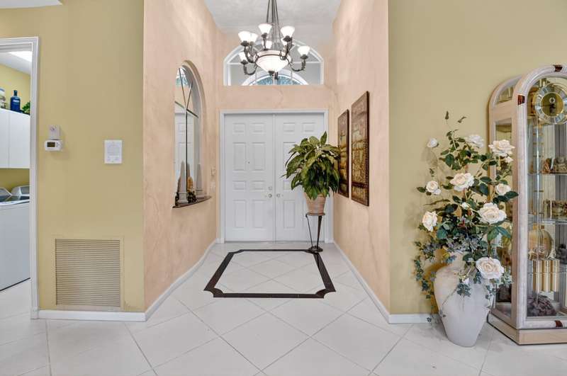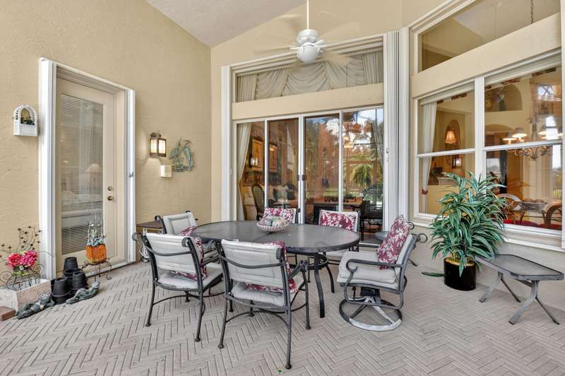 Immaculate 4BR/2.5BA Madrid on oversized lot with stunning pool. Elegant double-door entry opens to soaring ceilings and abundant natural light throughout. Gourmet kitchen features custom 42" cabinets, granite counters with backsplash, connecting seamlessly to spacious family room. Sliders from both living areas lead to screen-enclosed patio with private pool - perfect for entertaining. Master suite includes his & hers walk-in closets, luxurious bath with dual vanities, separate shower and Roman tub. Beautiful tile flows throughout all living areas. 4th bedroom currently serves as den with custom built-ins. Community boasts fabulous newly refurbished multi-million dollar clubhouse offering tennis, pickleball, state-of-the-art fitness center, lakeside café and more activities.