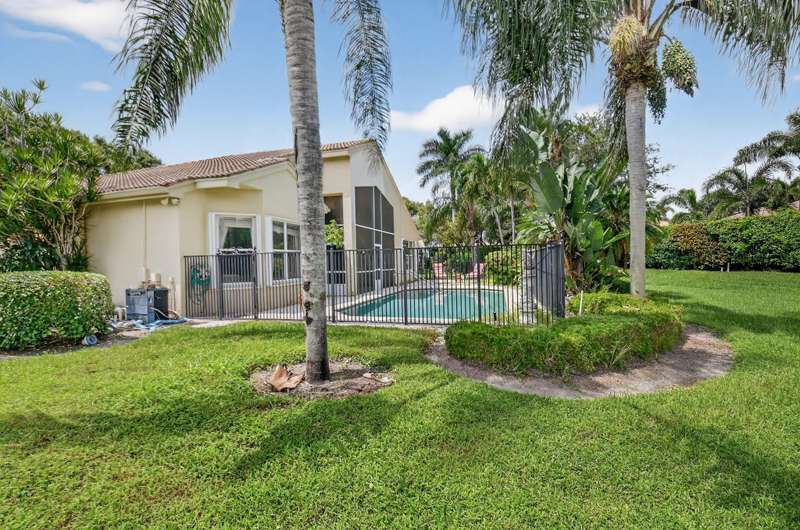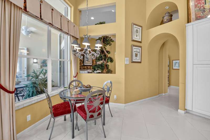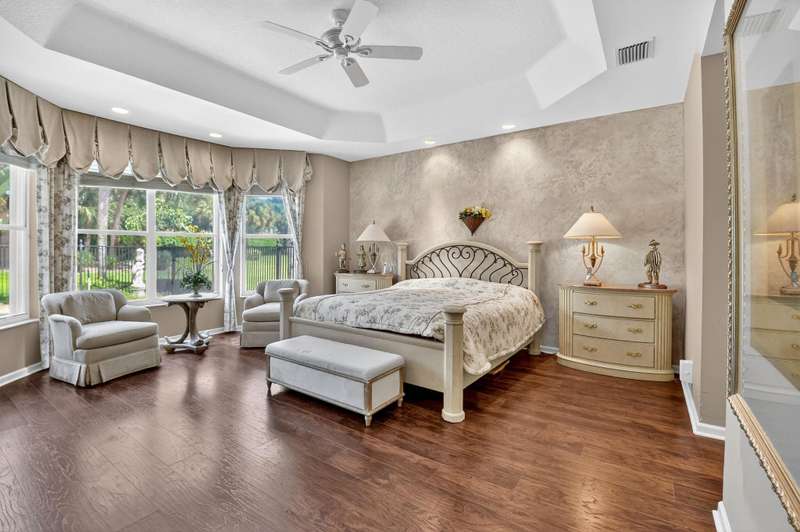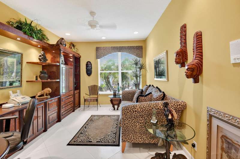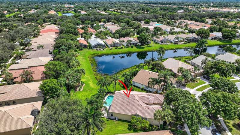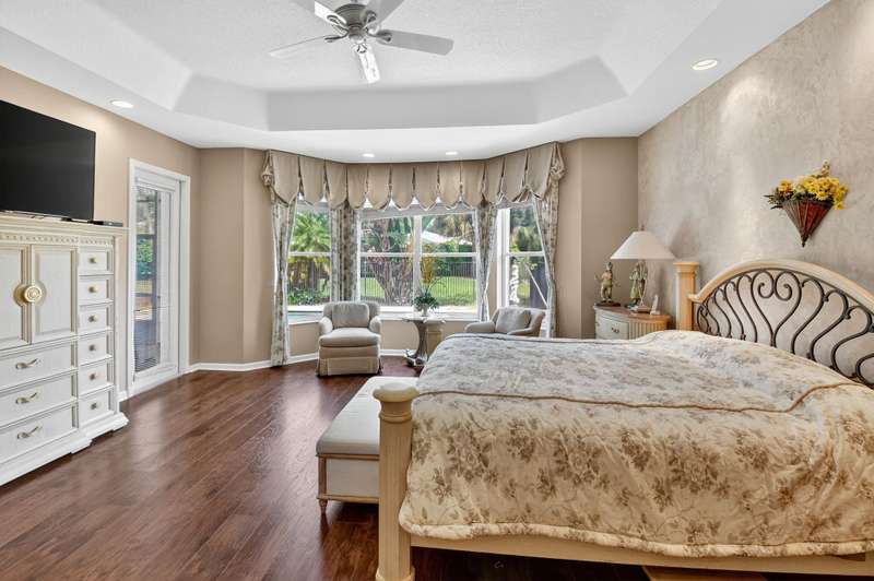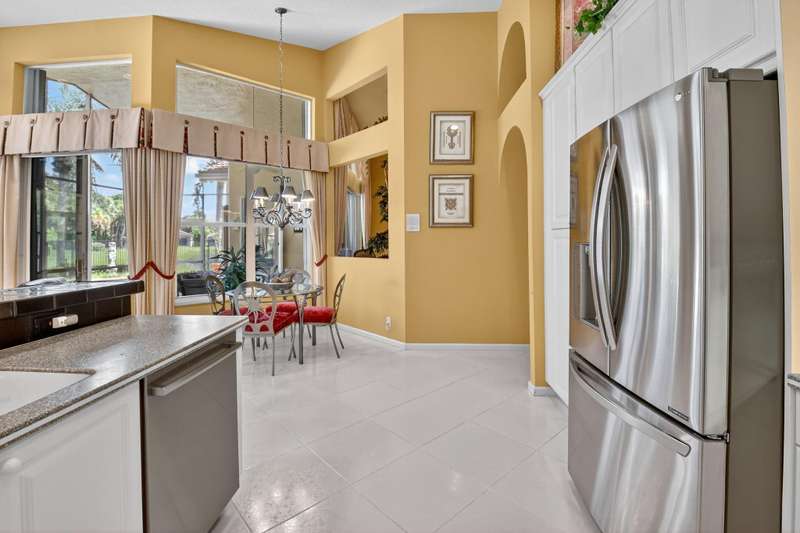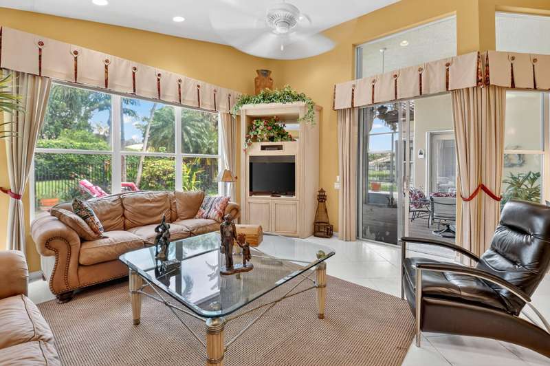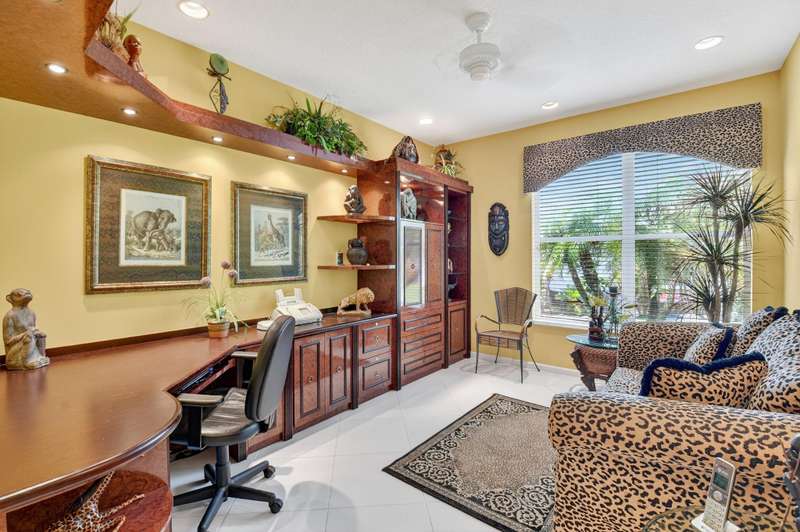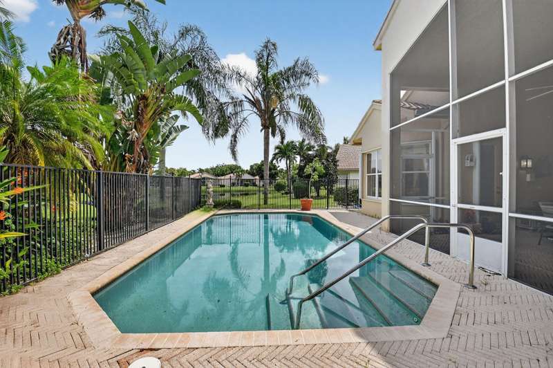 Immaculate 4BR/2.5BA Madrid on oversized lot with stunning pool. Elegant double-door entry opens to soaring ceilings and abundant natural light throughout. Gourmet kitchen features custom 42" cabinets, granite counters with backsplash, connecting seamlessly to spacious family room. Sliders from both living areas lead to screen-enclosed patio with private pool - perfect for entertaining. Master suite includes his & hers walk-in closets, luxurious bath with dual vanities, separate shower and Roman tub. Beautiful tile flows throughout all living areas. 4th bedroom currently serves as den with custom built-ins. Community boasts fabulous newly refurbished multi-million dollar clubhouse offering tennis, pickleball, state-of-the-art fitness center, lakeside café and more activities.