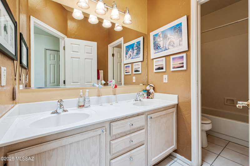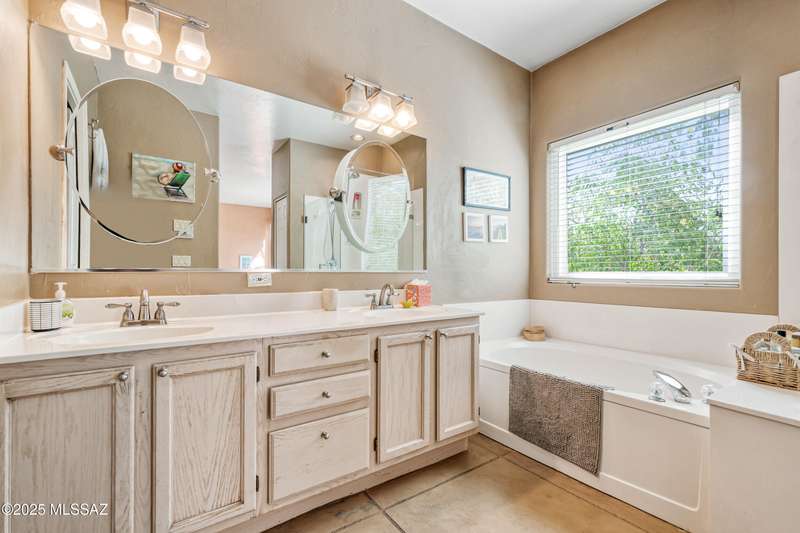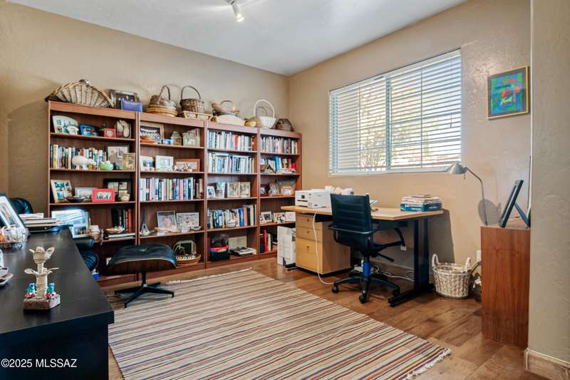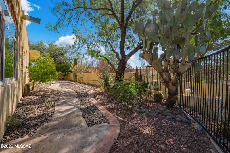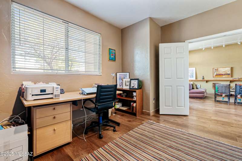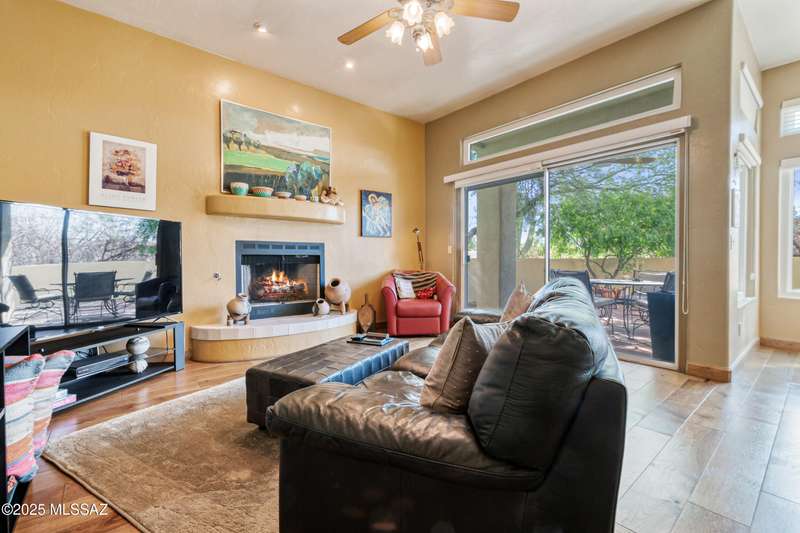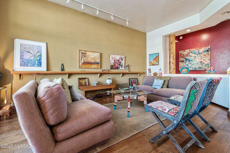 Sited in the lower foothills, this home with contemporary flair and southwest ambiance sits tucked away in a quiet cul de sac. Entry through inviting courtyard. Expansive living room with rustic viga posts. Updated kitchen with stainless appliances. Spacious dining room for special occasions plus a comfortable eat in kitchen for casual dining. Family room with gas fireplace opens to kitchen. Home has high ceilings and fans throughout. Engineered wood flooring in all common areas. Primary suite has separate shower and soaking tub, spacious walk in closet, and access to sparkling pool. Backyard includes covered patio and easy care landscaping. Convenient to Sabino Canyon Recreation Area, shopping, and restaurants.