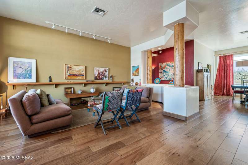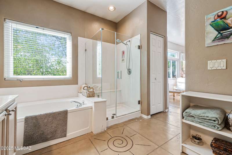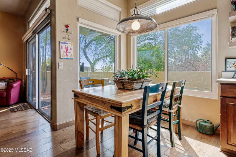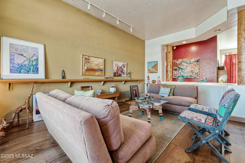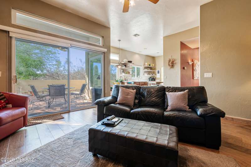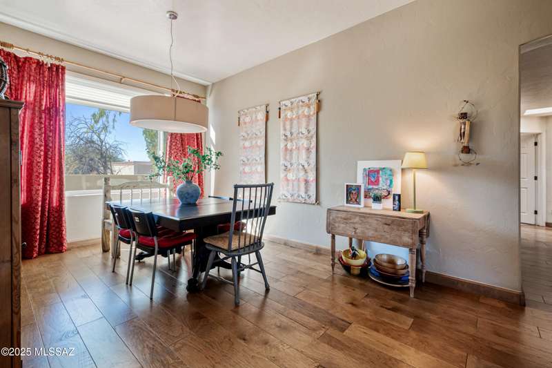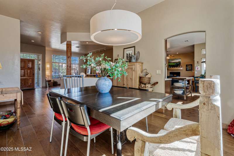 Sited in the lower foothills, this home with contemporary flair and southwest ambiance sits tucked away in a quiet cul de sac. Entry through inviting courtyard. Expansive living room with rustic viga posts. Updated kitchen with stainless appliances. Spacious dining room for special occasions plus a comfortable eat in kitchen for casual dining. Family room with gas fireplace opens to kitchen. Home has high ceilings and fans throughout. Engineered wood flooring in all common areas. Primary suite has separate shower and soaking tub, spacious walk in closet, and access to sparkling pool. Newer energy efficient windows installed on west side of home. Backyard includes covered patio and easy care landscaping. Convenient to Sabino Canyon Recreation Area, shopping, and restaurants.