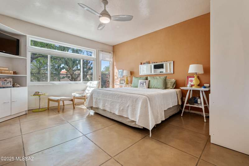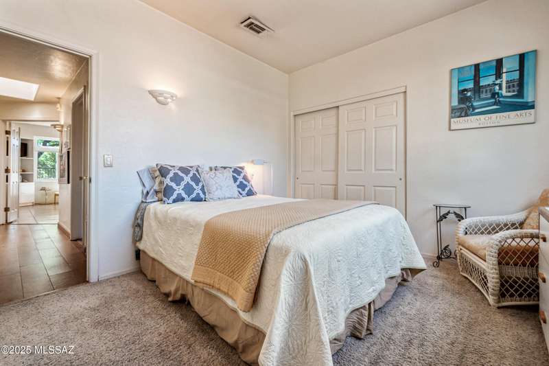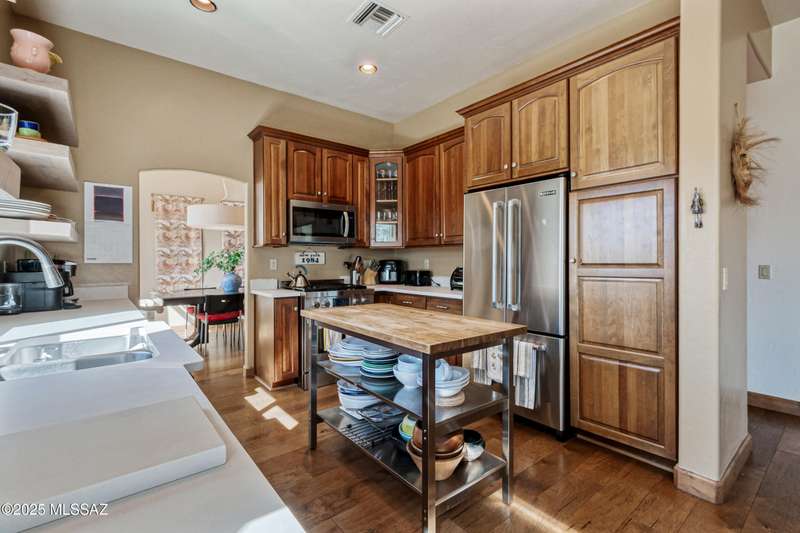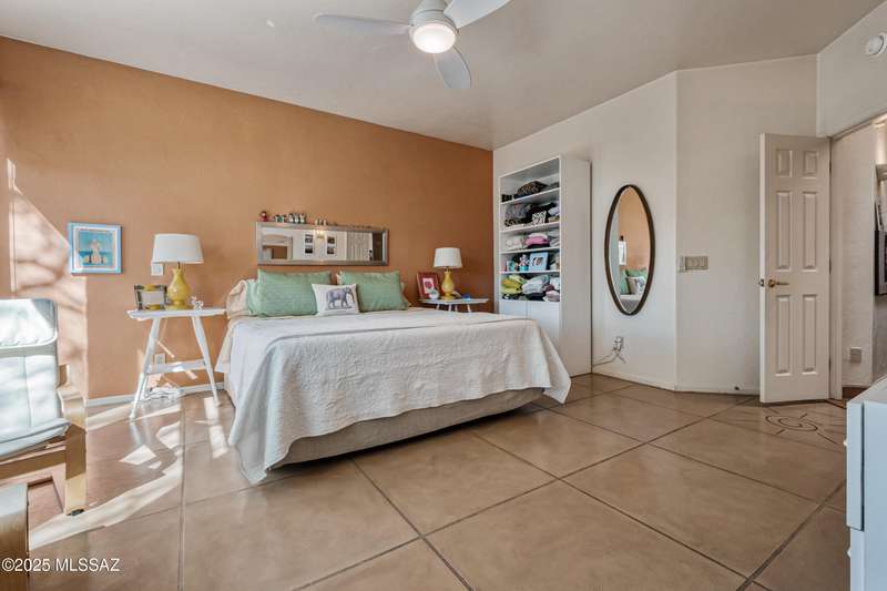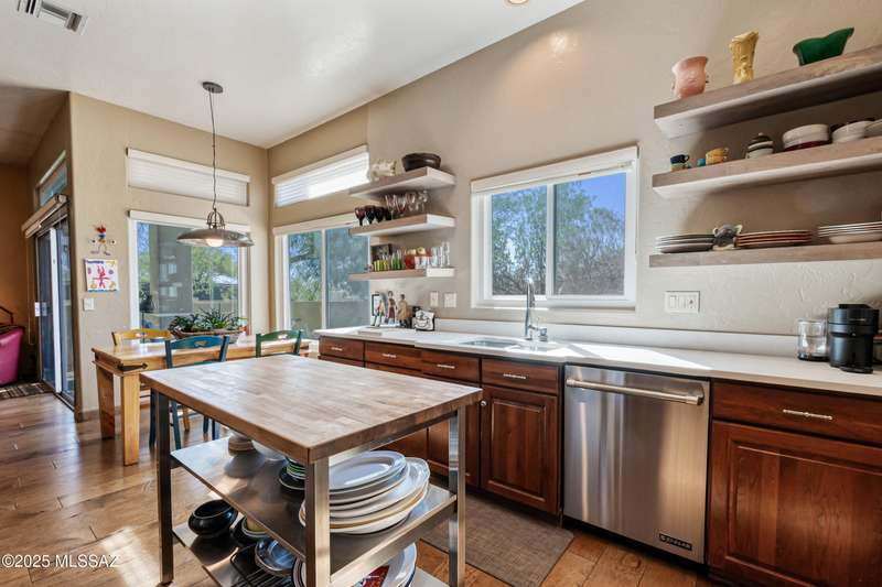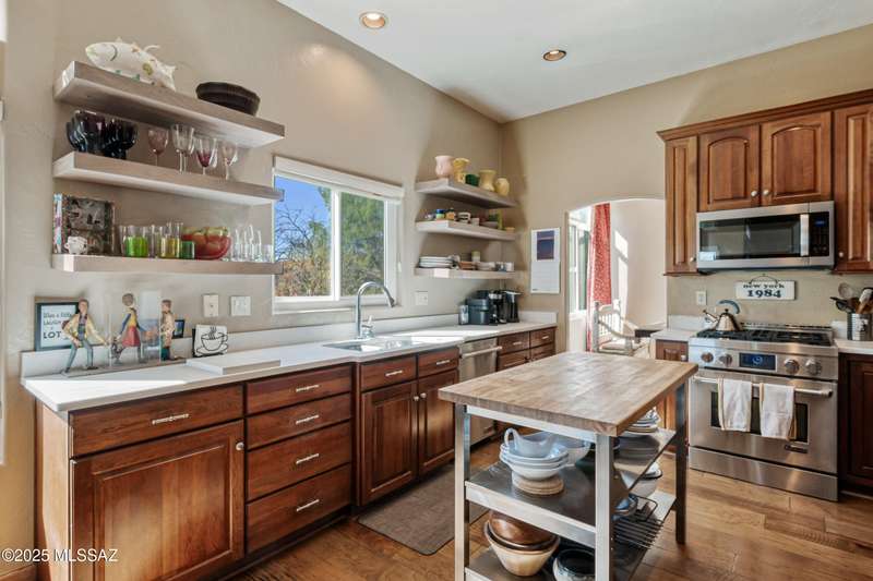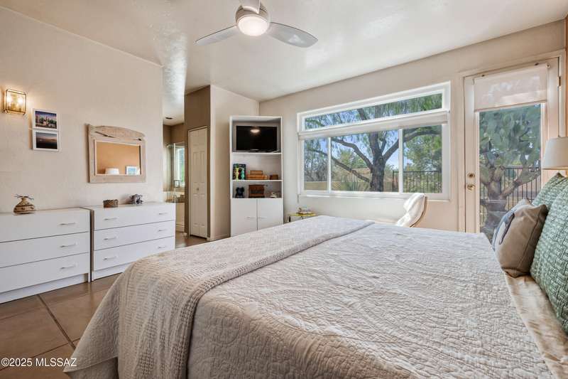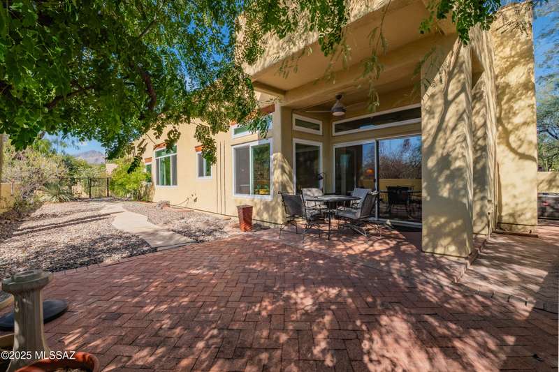 Sited in the lower foothills, this home with contemporary flair and southwest ambiance sits tucked away in a quiet cul de sac. Entry through inviting courtyard. Expansive living room with rustic viga posts. Updated kitchen with stainless appliances. Spacious dining room for special occasions plus a comfortable eat in kitchen for casual dining. Family room with gas fireplace opens to kitchen. Home has high ceilings and fans throughout. Engineered wood flooring in all common areas. Primary suite has separate shower and soaking tub, spacious walk in closet, and access to sparkling pool. Newer energy efficient windows installed on west side of home. Backyard includes covered patio and easy care landscaping. Convenient to Sabino Canyon Recreation Area, shopping, and restaurants.