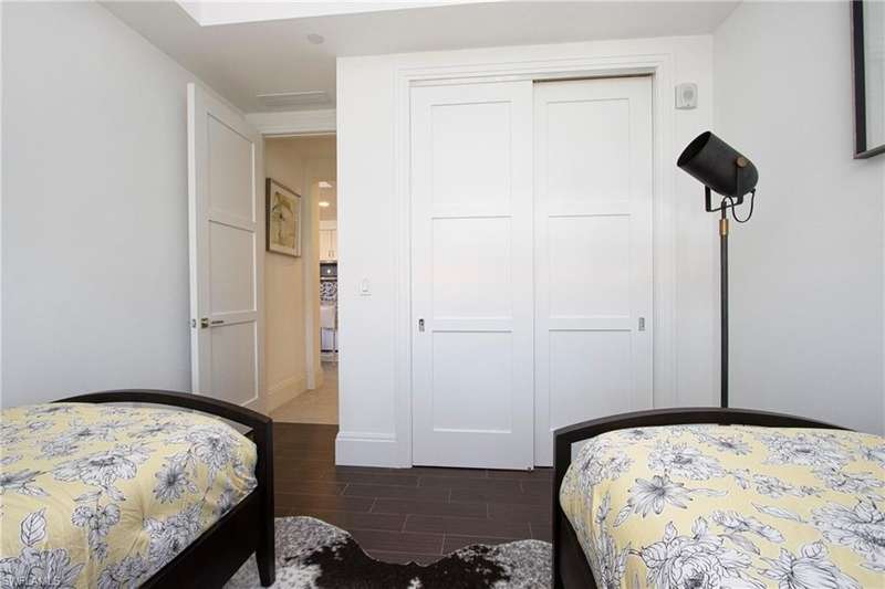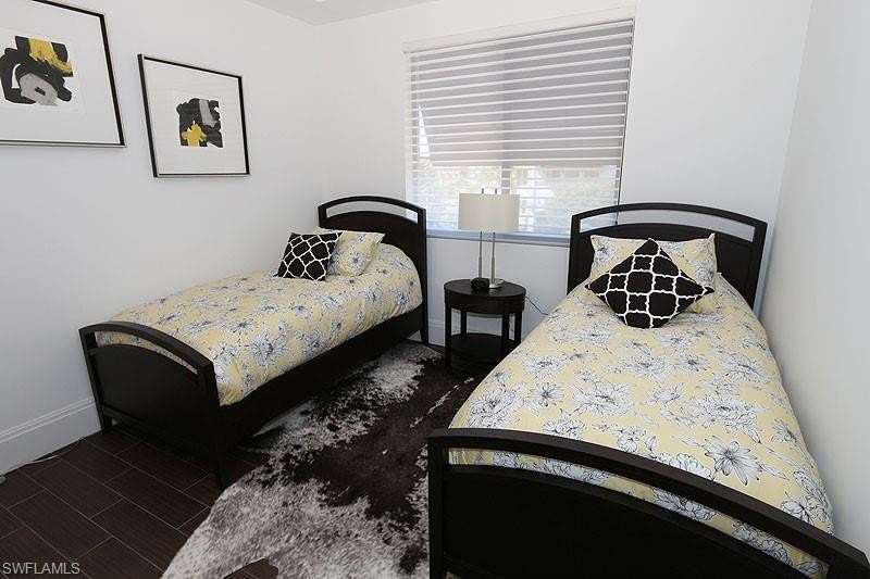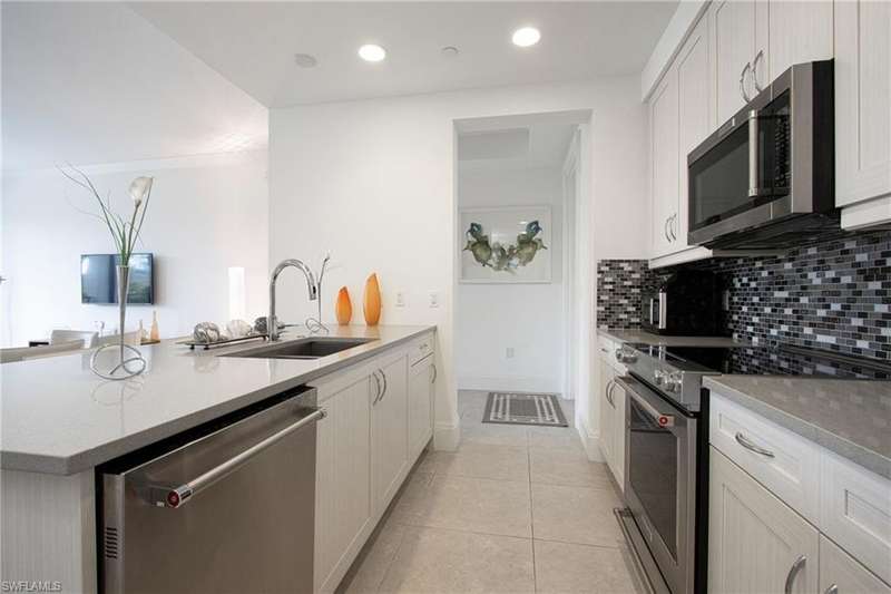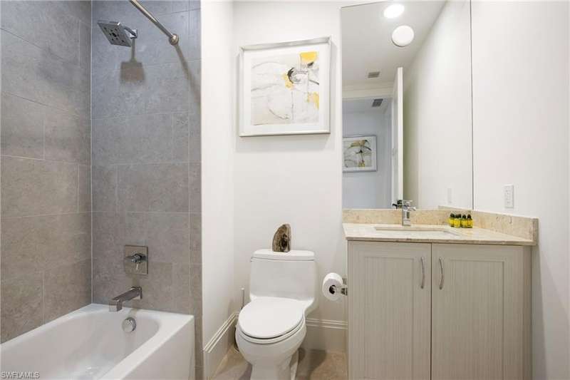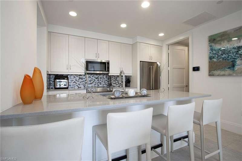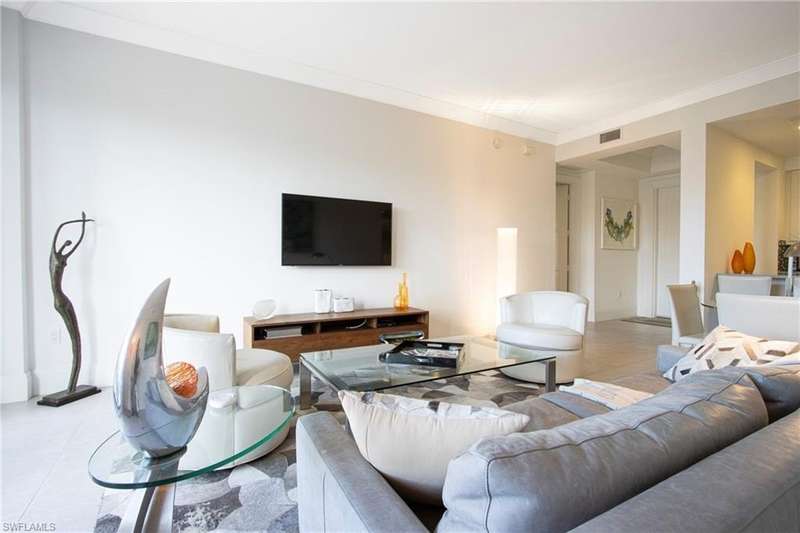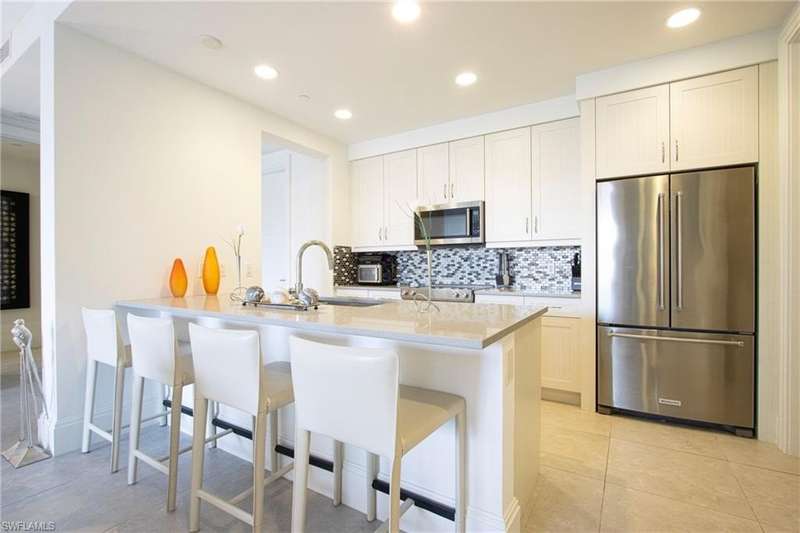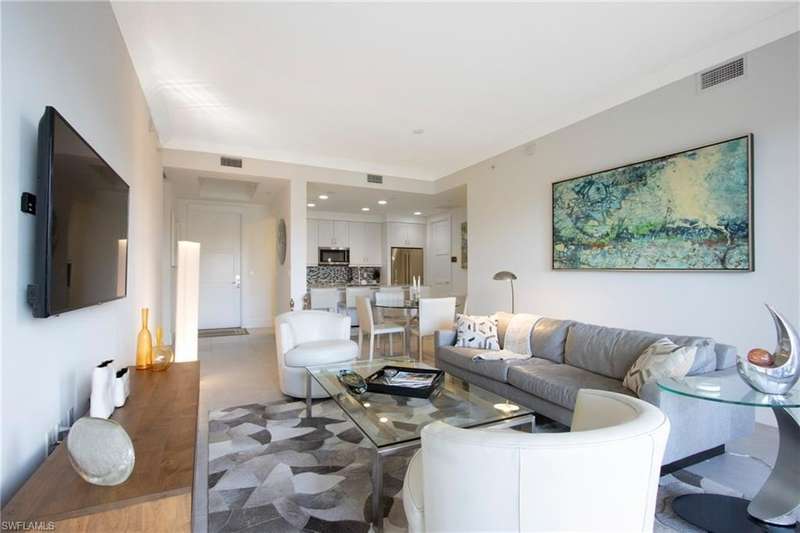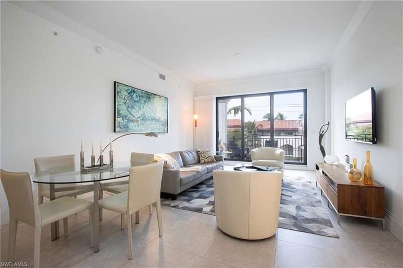 An exciting new concept of living has arrived in Olde Naples! Naples Square boasts the newest and most luxurious level of mid-rise condominium residency within the heart of the Naples area. This fabulous residence is furnished in a contemporary design scheme with accents of Florida colors as well as equipped with all modern features. Solid surface flooring throughout all living areas with area rugs gives the impression of clean lines. Sofa and two chairs in the living room. The glass dining room table seats four plus there are four bar stools at the breakfast bar. This residence also boasts a long open balcony overlooking the City street area. Every creature comfort has been provided to make a tenant's stay more convenient and enjoyable. Enjoy the amenities Naples Square has to offer including a heated pool & spa, exercise room, social room, BBQ grills, secured lobby access and on-site manager. Conveniently located close to 5th Avenue South shopping & dining district offering fine shopping, dining and entertainment.