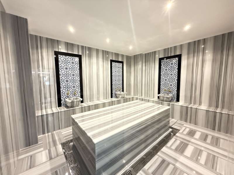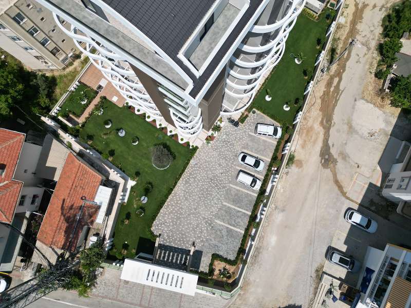 The single-block complex with sea and city views offers communal facilities such as a swimming pool, fitness center, sauna, relaxation area, children’s playground, adult game room, 24/7 security, building superintendent, camera surveillance, video intercom, landscaped garden with pergolas, jacuzzi, Turkish bath, barbecue area, Wi-Fi in common areas, and outdoor parking.