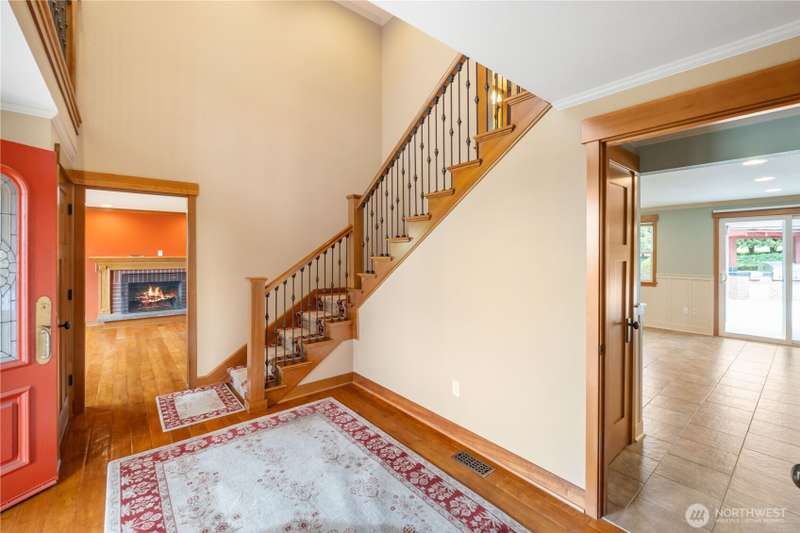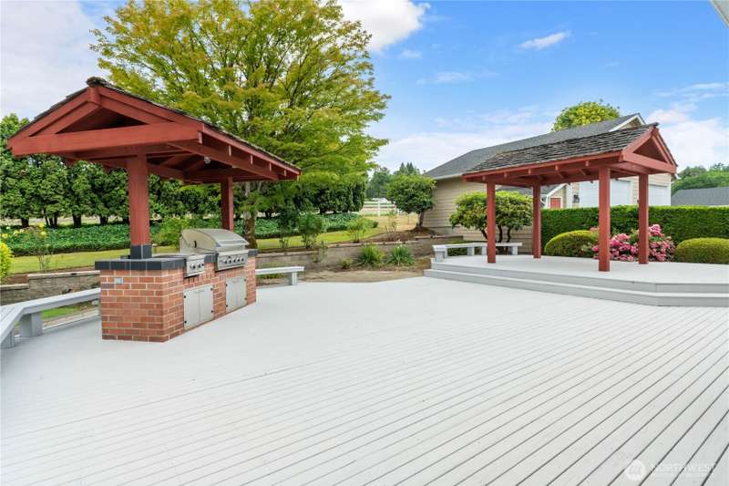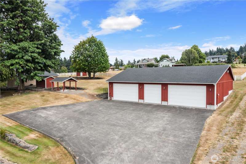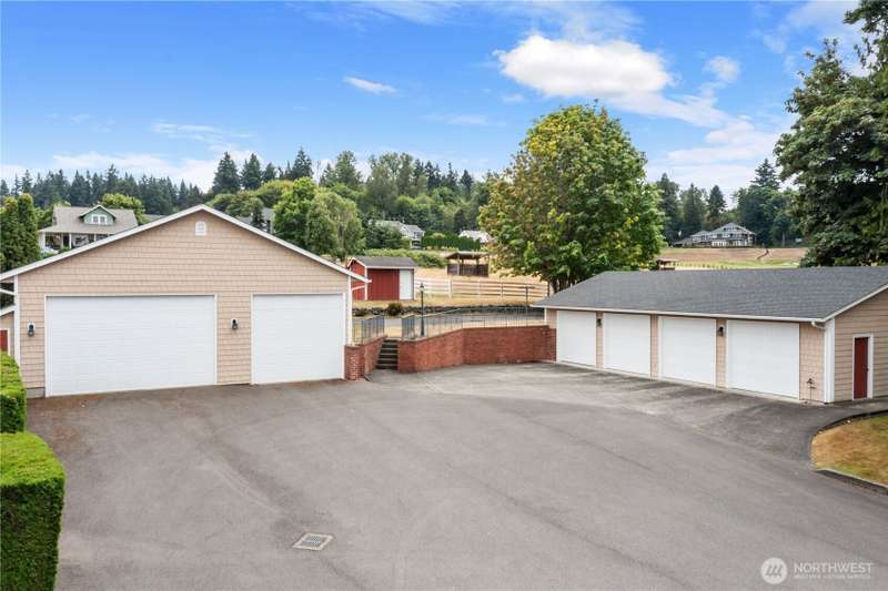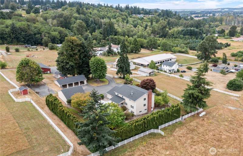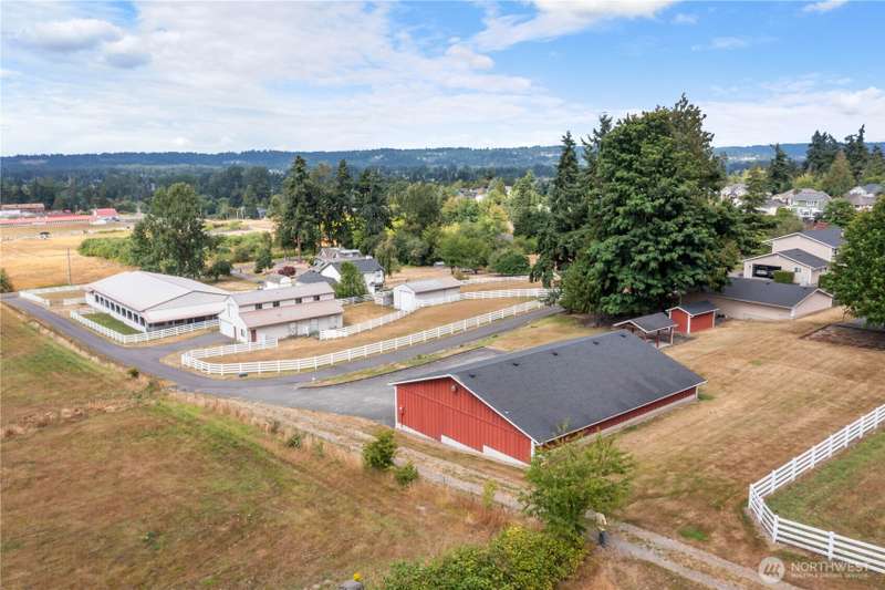 Incredible opportunity for rare combo of huge 4,242 sq ft updated home set up for gatherings both inside & outside w/1500+ sq ft deck & covered barbeque + gazebo. Car enthusiast dream w/2 car garage, detached 3 car & heated 4 car & 10 car garages. Covered riding 60' X 120' arena w/4 stalls & 6 stall barn w/ hay storage up in both & tractor storage bldg too. Pristine upgraded home inside & out w/beautiful island kitchen & custom cabinets, built in cabinets in dining room/office/upstairs landing/mud room/utility room, dual heat pumps, downstairs kitchenette ++, 40 yr roof, Hardie plank siding & sculptured landscaping. Appraised @ $2.2M. *Combine with MLS# 2407343 w/11.6 acres for horse grazing/rental house &/or future development options*
