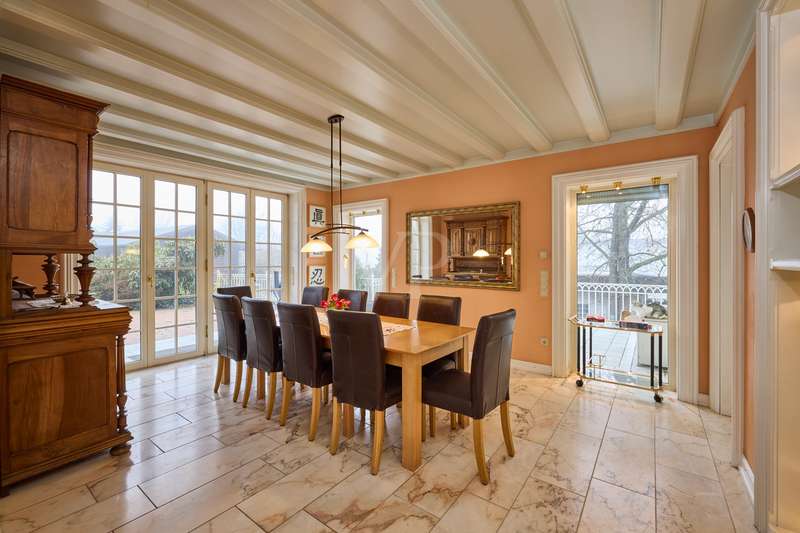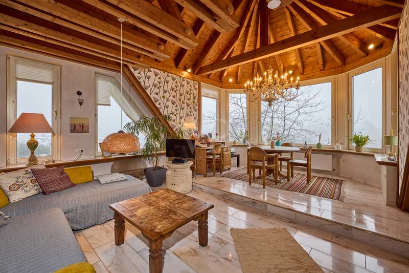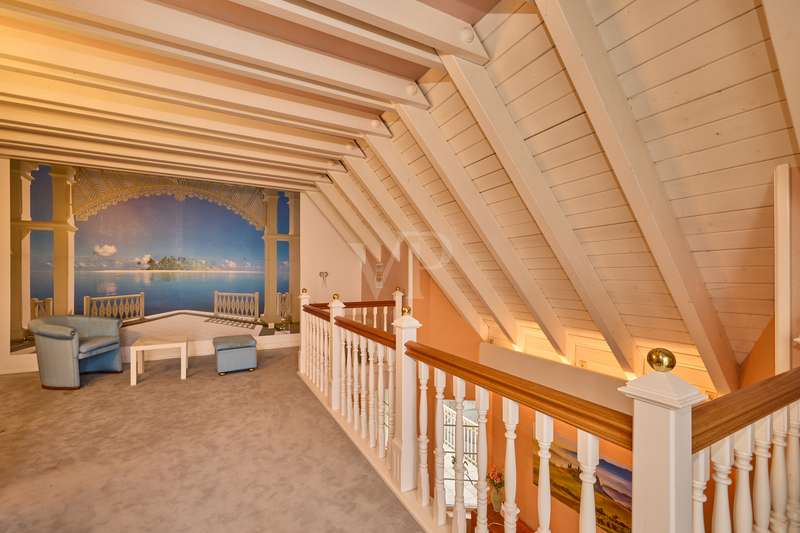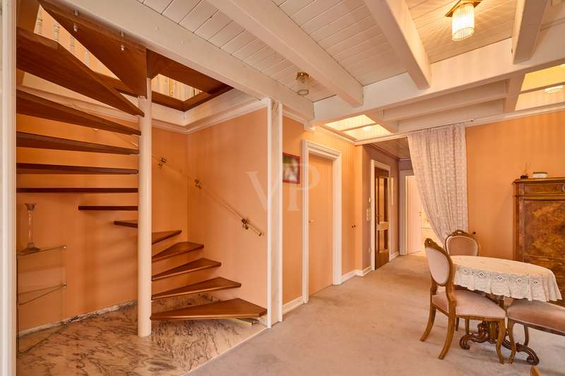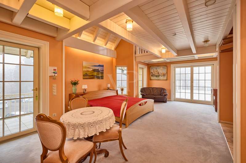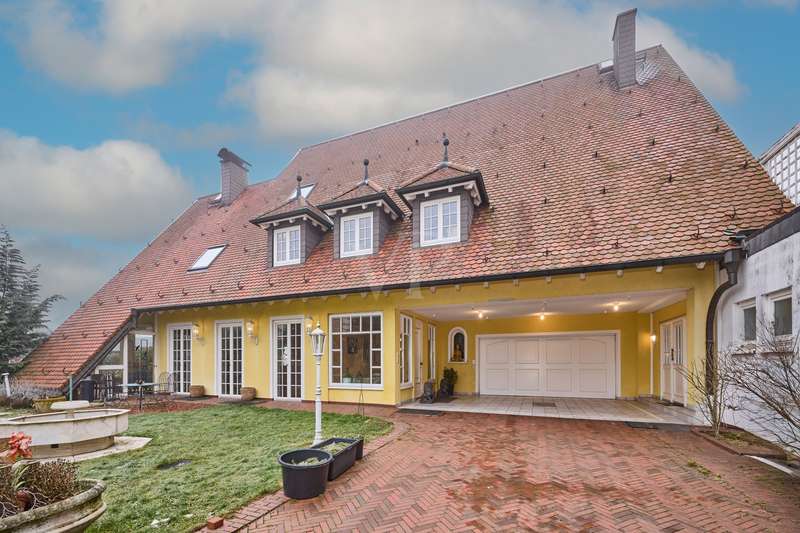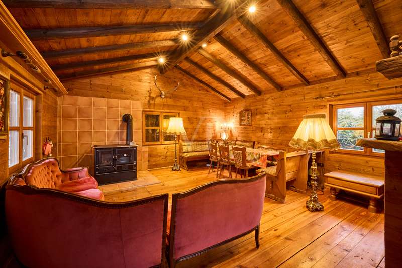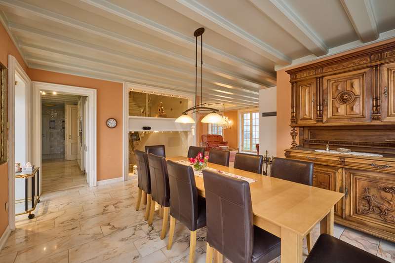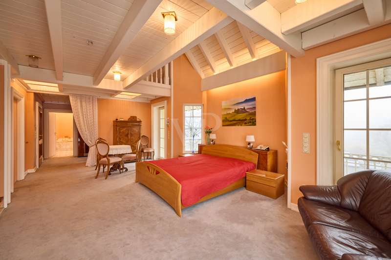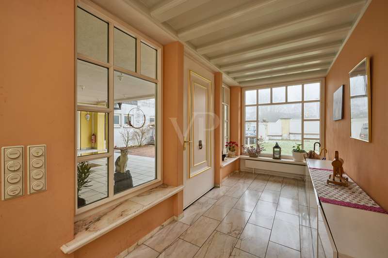 This special property combines living and working with a spacious plot and high-quality materials in the interior. The main entrance to the property is reached via the solid, electric courtyard gate. The inner courtyard offers parking space for several vehicles. There is also a double garage in the entrance area. The generously proportioned entrance area can be reached through the ornate, solid front door. The flooring on the first floor is covered with Italian marble. There is a separate guest WC in the hallway area. The open, light-flooded living/dining area of the property is ideal for large family gatherings in front of the wood-burning fireplace in a cozy atmosphere. The terrace areas on the first floor are seamlessly accessible from both rooms. A highlight of this living level is the modern kitchen with granite worktops and a separate seating area. The primary kitchen is perfectly complemented by a preparation kitchen with direct access to the garage. In the basement of the property there is a granny apartment accessible via separate external access. The granny apartment has a kitchen, a spacious bedroom, a bathroom, a living room and a storage room. There are also 3 spacious cellar rooms on this level. The upper floor of the property can be reached via the staircase, which is fitted with indirect lighting elements. This floor accommodates a total of 3 bedrooms. The primary bedroom extends over 2 spacious levels, with the bedroom, 2 dressing rooms and a daylight en-suite bathroom located on the first level. The 2nd level offers space for individual use and a view of the 1st level from the gallery. Furthermore, the south-east facing terrace with views of the natural surroundings can be accessed seamlessly from the bedroom. The installation of an elevator was also considered in this area in the past. The en-suite daylight bathroom has a bathtub and a spacious shower. There are also 2 spacious bedrooms on this living level. The doors in this area are made of oak and were custom-made to order. On the top floor of the property there are 3 further bedrooms as well as a living room and a toilet and laundry area. The outside area of the property features another highlight of this offer, the log cabin with a wood-burning fireplace and bar. Inspired by an Austrian mountain hut, this building exudes a very special charm and invites you to enjoy convivial evenings. The property is spacious and offers you plenty of creative freedom. The commercial unit impresses on the first floor with rooms that could alternatively be used as a bedroom, living room, bathroom and kitchen. The upper floor houses rented office space. The commercial complex also has 5 garages and a currently rented hall. The net cold rent for the rented premises currently amounts to approx. 1000 €/month.