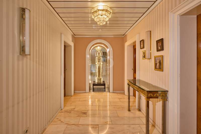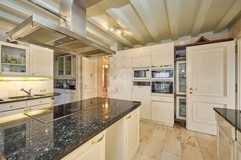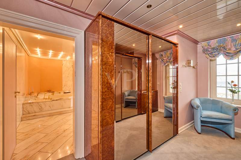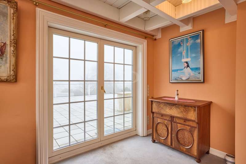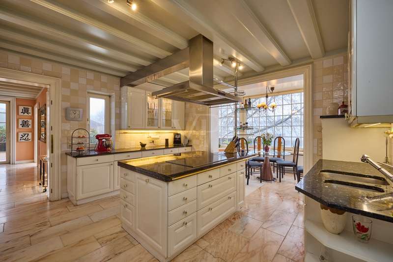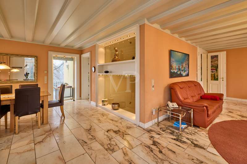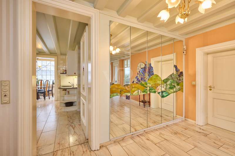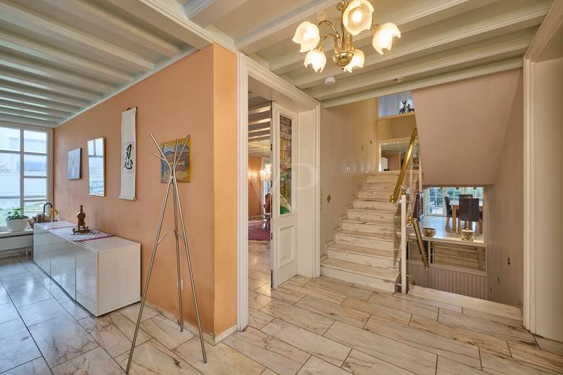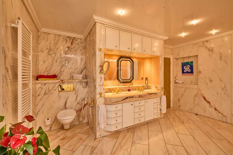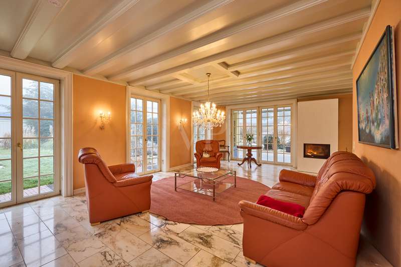 This special property combines living and working with a spacious plot and high-quality materials in the interior. The main entrance to the property is reached via the solid, electric courtyard gate. The inner courtyard offers parking space for several vehicles. There is also a double garage in the entrance area. The generously proportioned entrance area can be reached through the ornate, solid front door. The flooring on the first floor is covered with Italian marble. There is a separate guest WC in the hallway area. The open, light-flooded living/dining area of the property is ideal for large family gatherings in front of the wood-burning fireplace in a cozy atmosphere. The terrace areas on the first floor are seamlessly accessible from both rooms. A highlight of this living level is the modern kitchen with granite worktops and a separate seating area. The primary kitchen is perfectly complemented by a preparation kitchen with direct access to the garage. In the basement of the property there is a granny apartment accessible via separate external access. The granny apartment has a kitchen, a spacious bedroom, a bathroom, a living room and a storage room. There are also 3 spacious cellar rooms on this level. The upper floor of the property can be reached via the staircase, which is fitted with indirect lighting elements. This floor accommodates a total of 3 bedrooms. The primary bedroom extends over 2 spacious levels, with the bedroom, 2 dressing rooms and a daylight en-suite bathroom located on the first level. The 2nd level offers space for individual use and a view of the 1st level from the gallery. Furthermore, the south-east facing terrace with views of the natural surroundings can be accessed seamlessly from the bedroom. The installation of an elevator was also considered in this area in the past. The en-suite daylight bathroom has a bathtub and a spacious shower. There are also 2 spacious bedrooms on this living level. The doors in this area are made of oak and were custom-made to order. On the top floor of the property there are 3 further bedrooms as well as a living room and a toilet and laundry area. The outside area of the property features another highlight of this offer, the log cabin with a wood-burning fireplace and bar. Inspired by an Austrian mountain hut, this building exudes a very special charm and invites you to enjoy convivial evenings. The property is spacious and offers you plenty of creative freedom. The commercial unit impresses on the first floor with rooms that could alternatively be used as a bedroom, living room, bathroom and kitchen. The upper floor houses rented office space. The commercial complex also has 5 garages and a currently rented hall. The net cold rent for the rented premises currently amounts to approx. 1000 €/month.