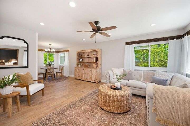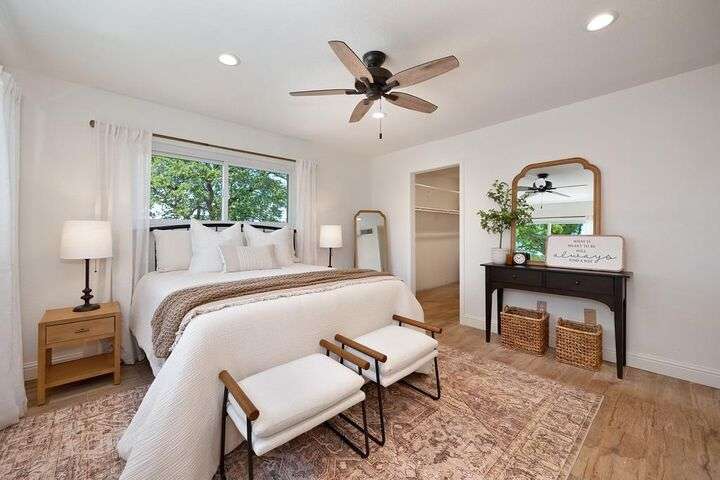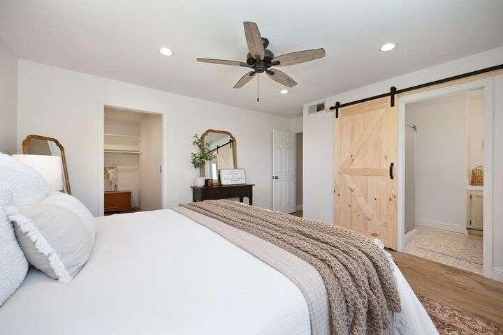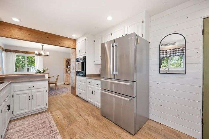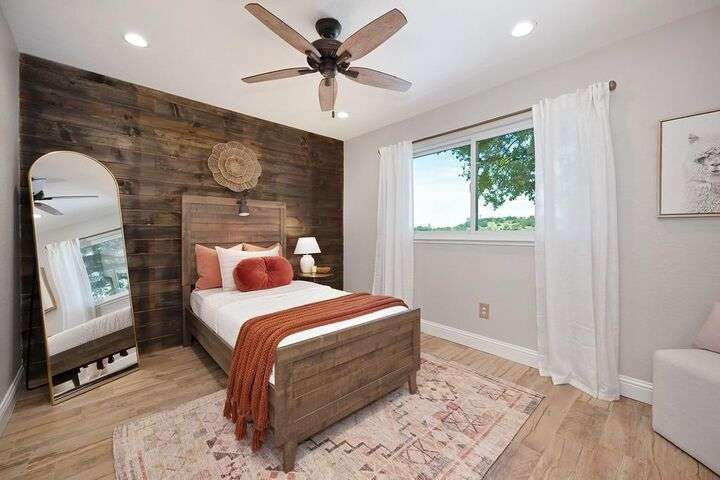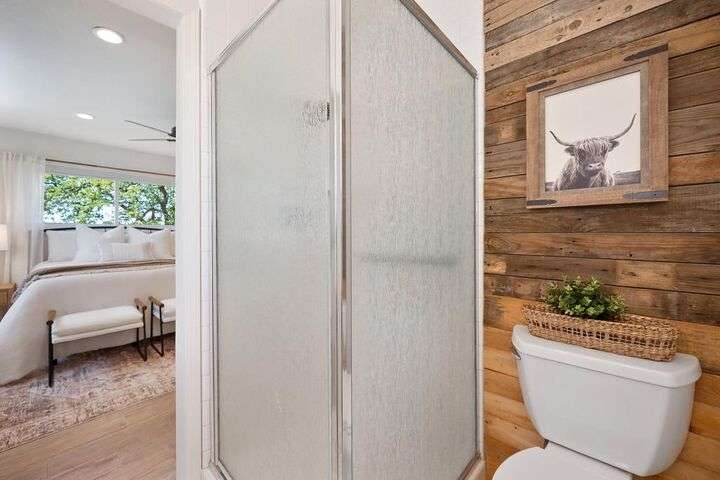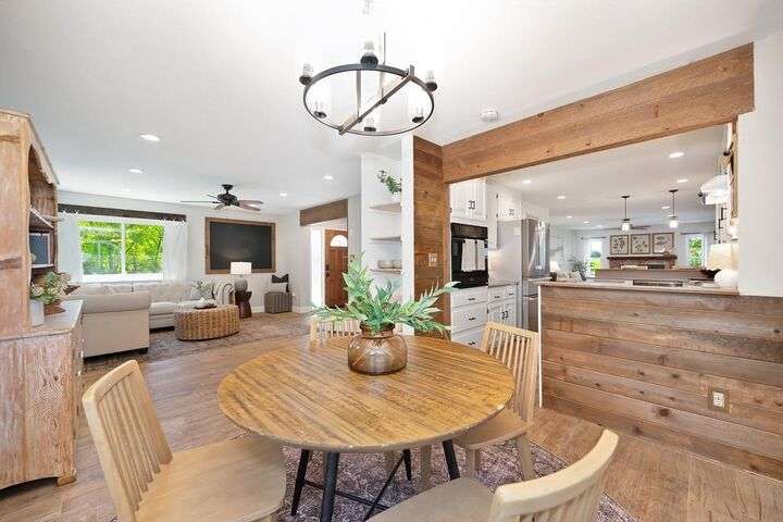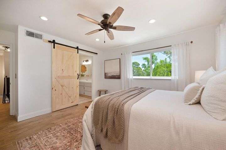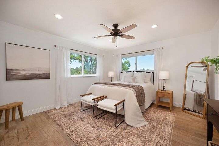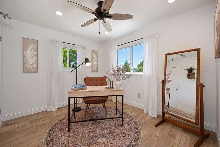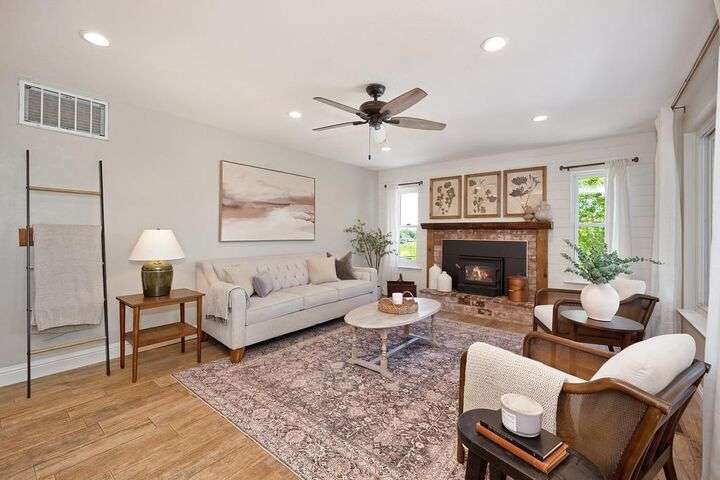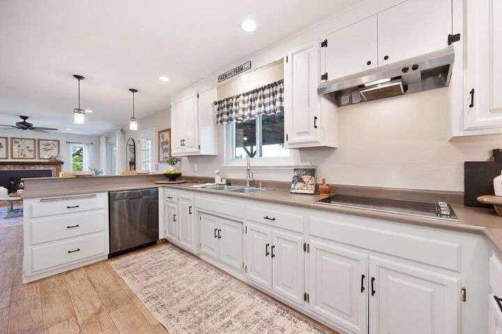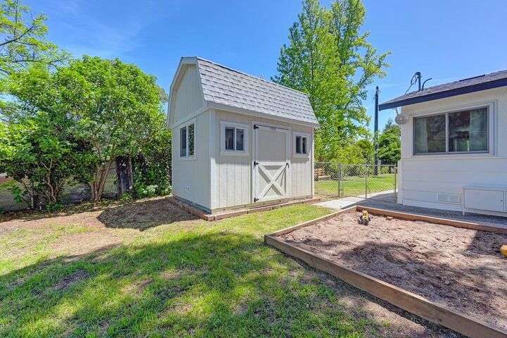 Among rolling hills, this property is like a dream and is unlike anything else on the market. Charming and classic, this modern farmhouse features a view that simply cannot be missed. You will want to sit out on the back patio or in the pasture for hours listening to the wind in the trees, gazing at the rolling hills, local ponds, and grapevines. Step inside and you will find rustic elegance throughout. The wood ceramic plank flooring throughout and the hexagon tiles in the bathrooms are a real highlight. Fresh interior and exterior paint, a brand new 30 yr roof, new Anderson lifetime windows, and other updates make this home not only turnkey, but a retreat. This home is ready for animals and the homestead you have been longing for. There are 2 large fenced and cross fenced pastures, 1 smaller fenced area that makes for large chicken area with a coop, several areas of shade and a single stall structure with a lean to for goats or horses, an additional fenced area with raised garden beds, 1/2 of irrigation water in the summer that feeds the year round pond, and an amazing well producing 15 gal / min. With four bedrooms, two and a half baths, multiple living areas, and a large kitchen this home is not lacking areas to entertain.