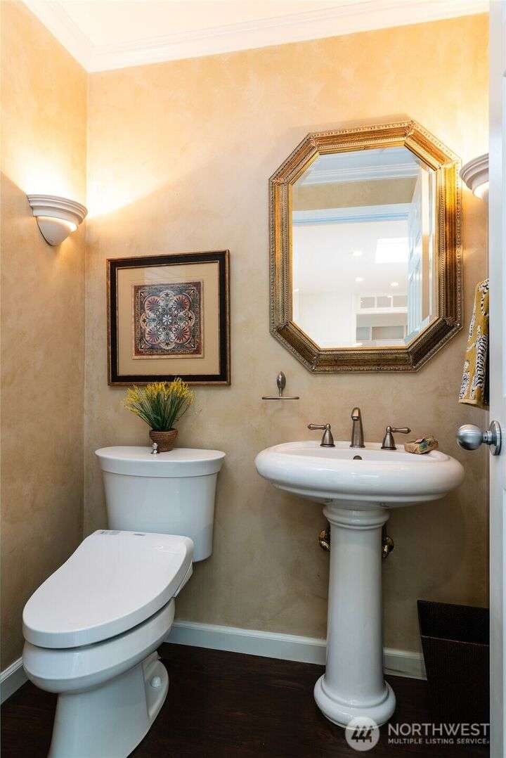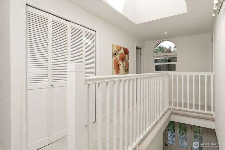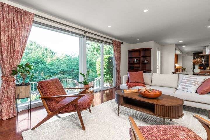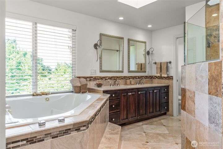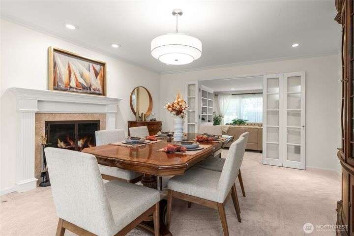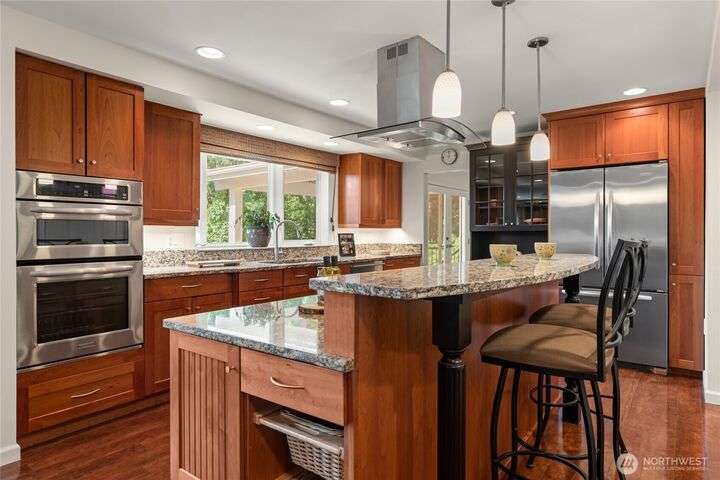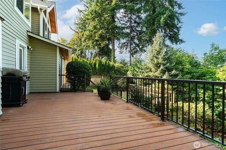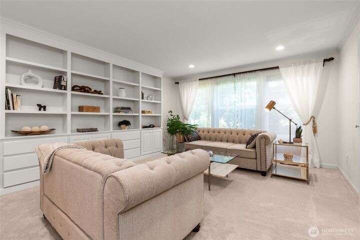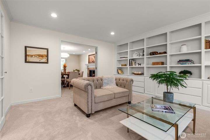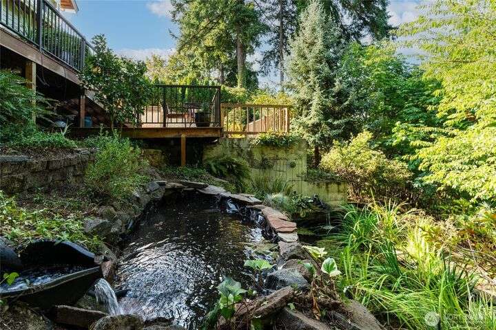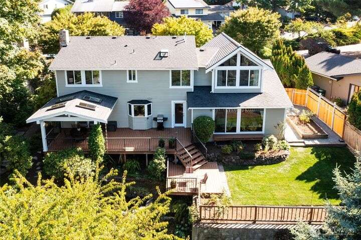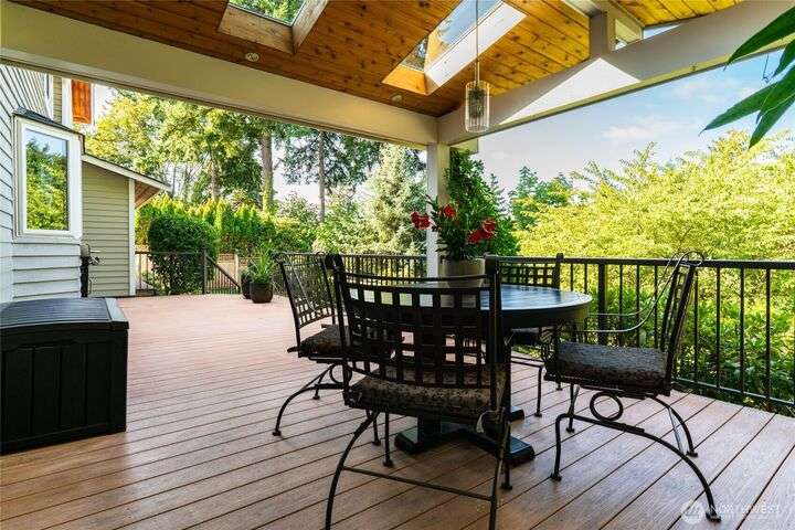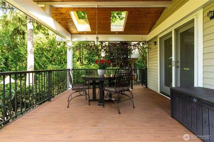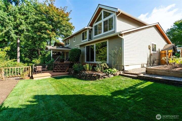 Nestled on a private lot bordering the Kirkland corridor, this Murray Franklin built home in Sandhurst blends custom built-ins, refined updates, and timeless curb appeal. Step onto the covered front porch and enter a light filled entry and living room with French doors and custom bookshelves. The ambiance filled dining room provides a gas fireplace, and opens to a covered outdoor living area, spacious deck, and landscaped yard. Chef’s kitchen boasts an island, gas cooktop, and garden window. Open great room with hardwood floors offers a built-in entertainment center and window wall. Upstairs, a skylit hallway leads to three generous bedrooms and a luxurious primary suite with vaulted ceilings, walk-in closet, and spa-inspired 5-piece bath.