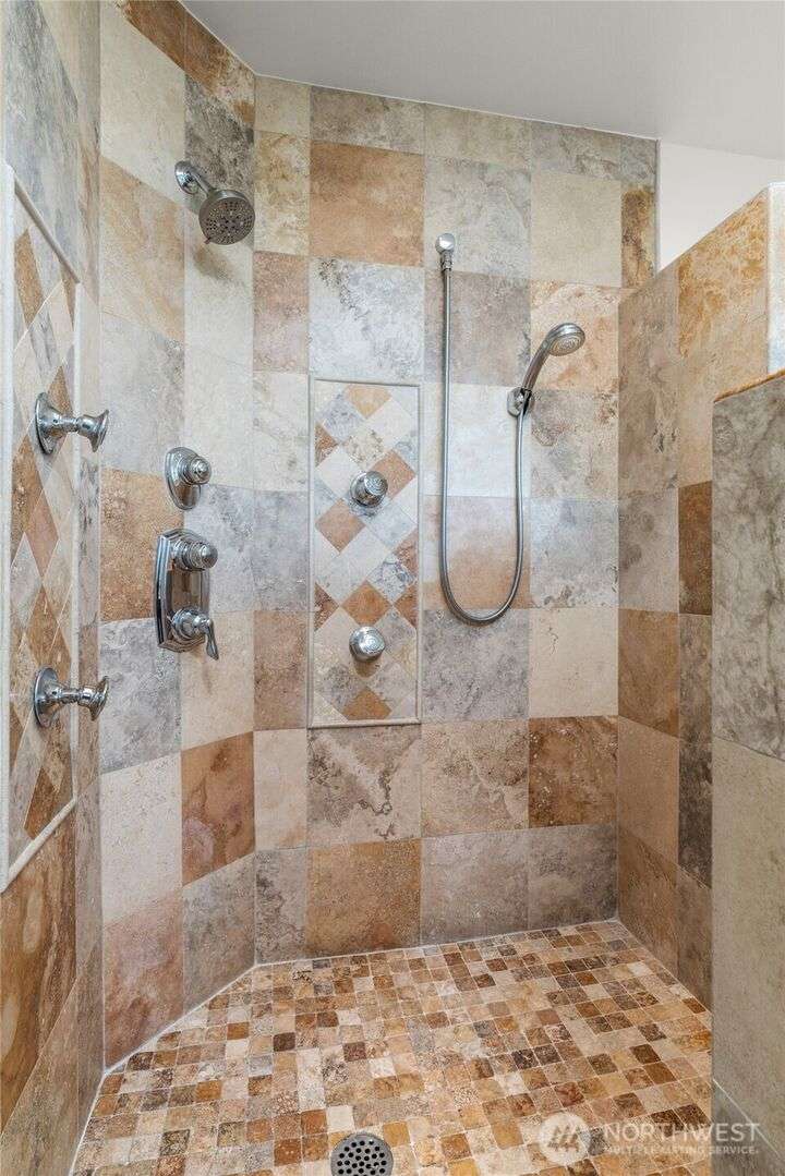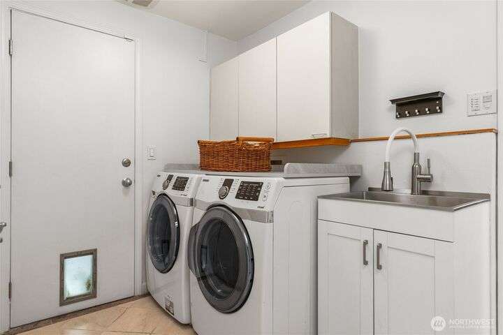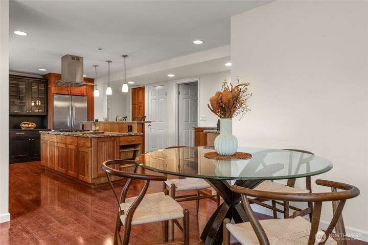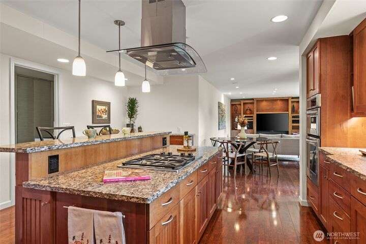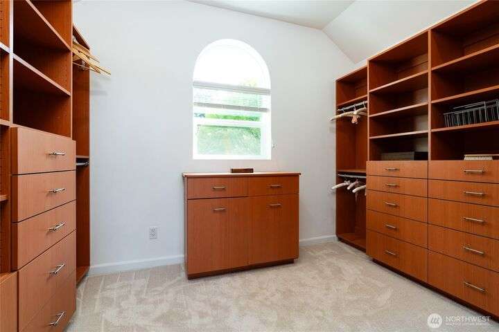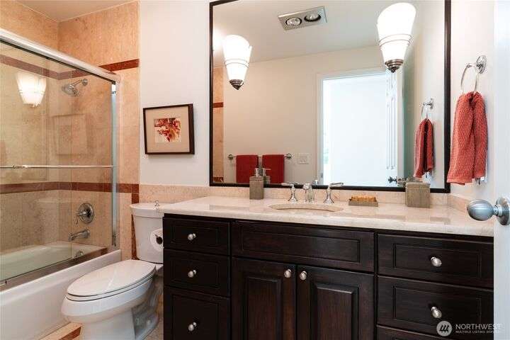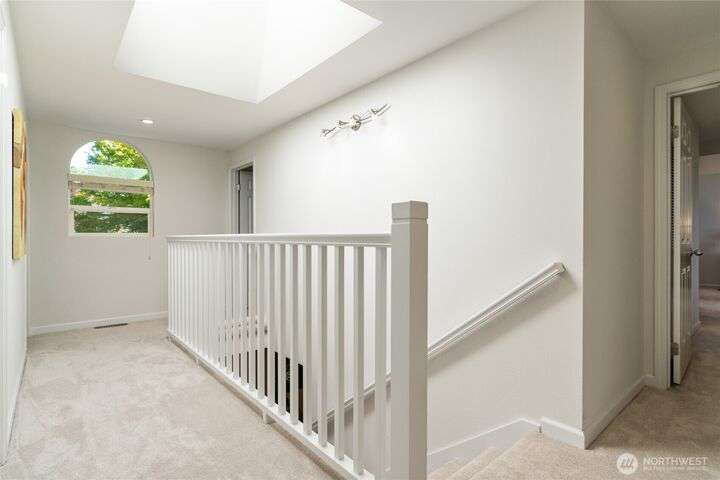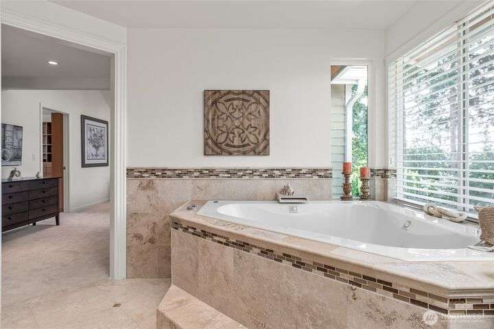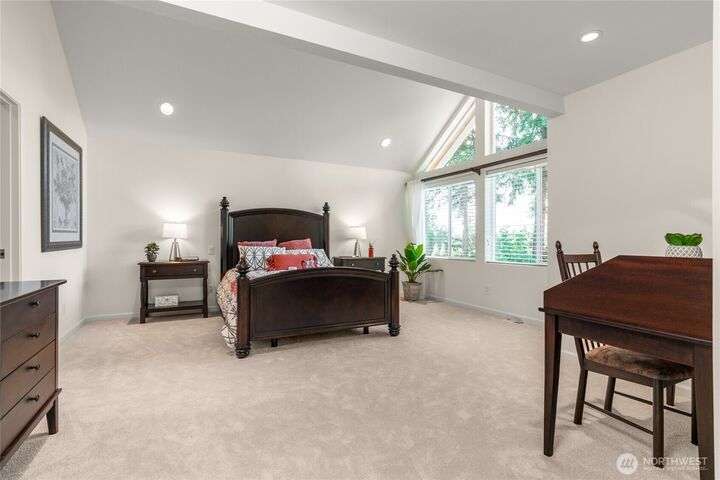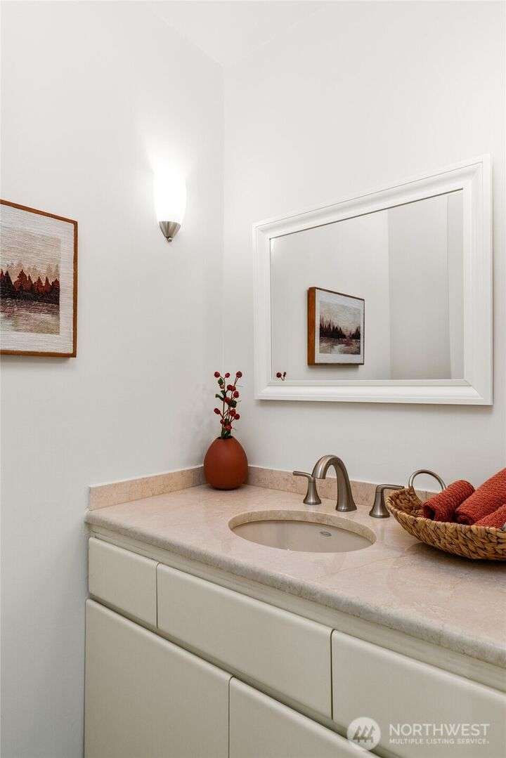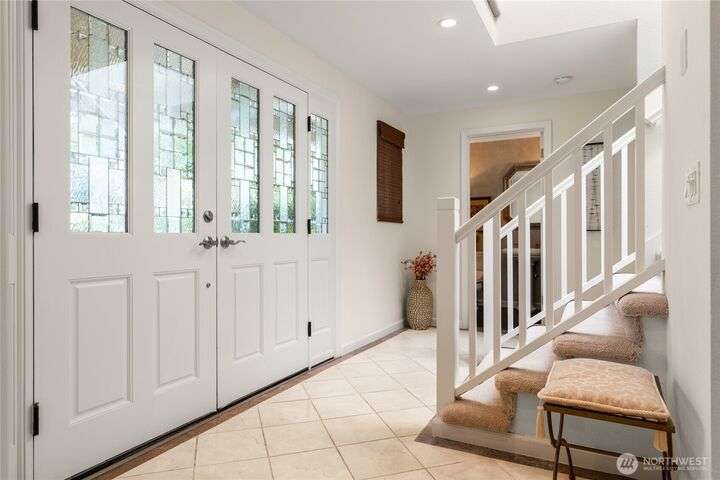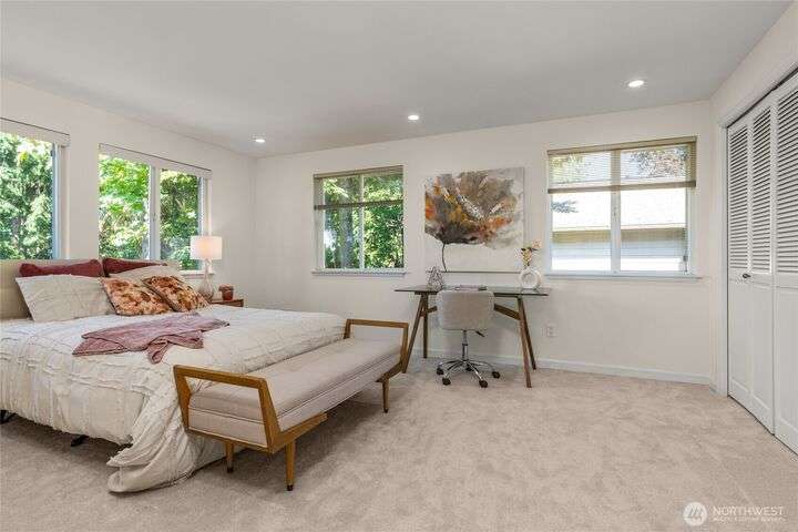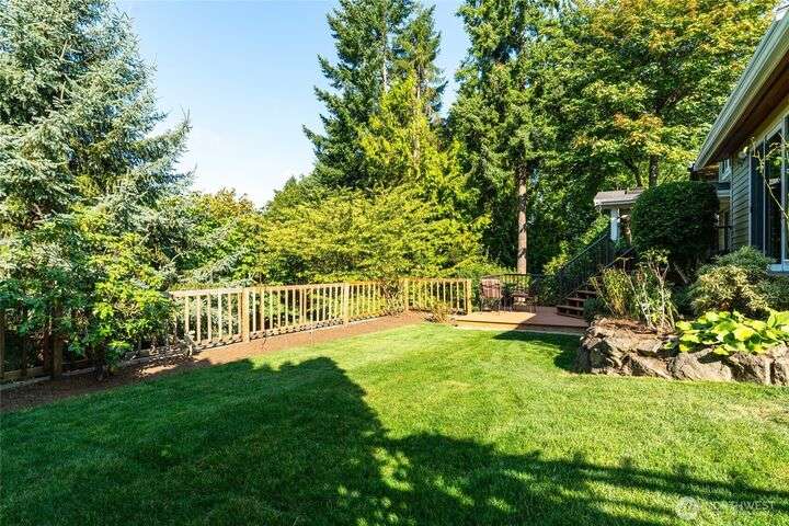 Nestled on a private lot bordering the Kirkland corridor, this Murray Franklin built home in Sandhurst blends custom built-ins, refined updates, and timeless curb appeal. Step onto the covered front porch and enter a light filled entry and living room with French doors and custom bookshelves. The ambiance filled dining room provides a gas fireplace, and opens to a covered outdoor living area, spacious deck, and landscaped yard. Chef’s kitchen boasts an island, gas cooktop, and garden window. Open great room with hardwood floors offers a built-in entertainment center and window wall. Upstairs, a skylit hallway leads to three generous bedrooms and a luxurious primary suite with vaulted ceilings, walk-in closet, and spa-inspired 5-piece bath.