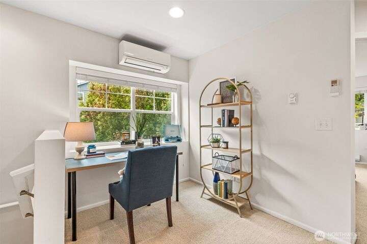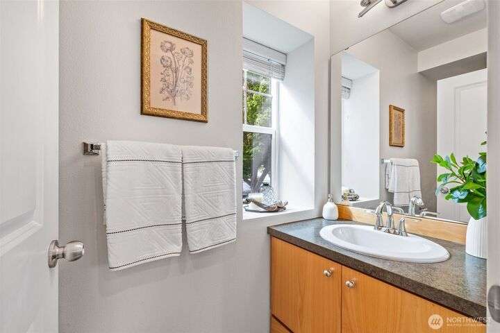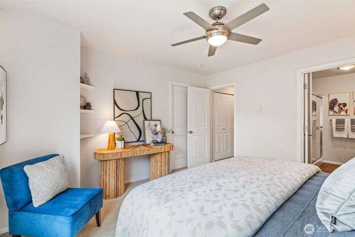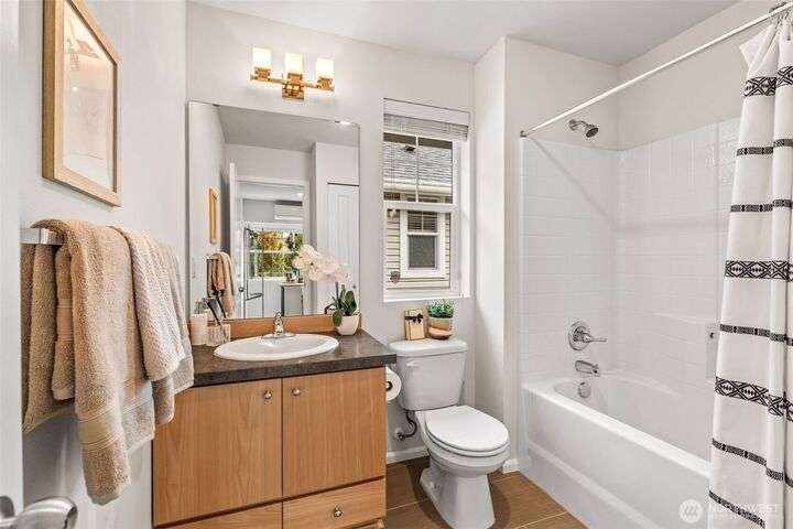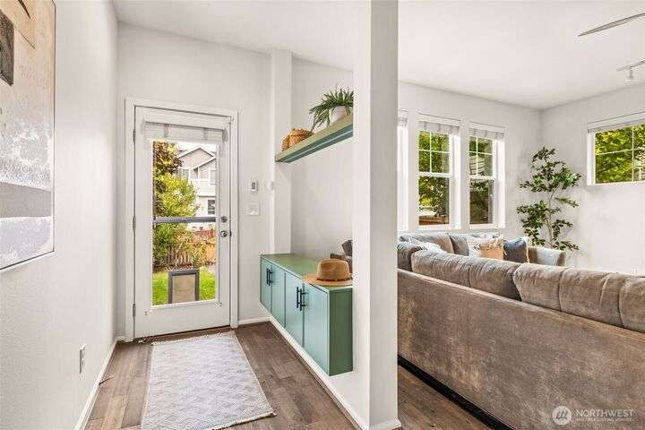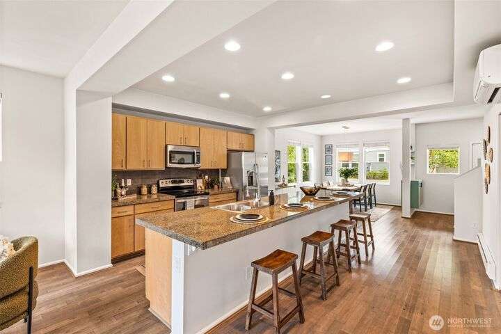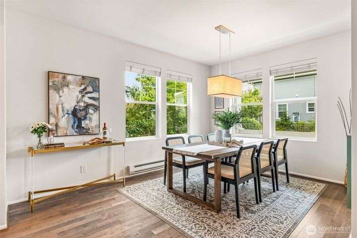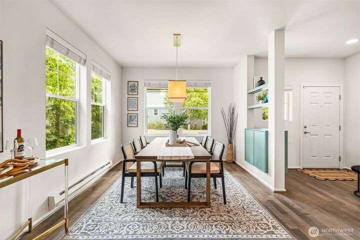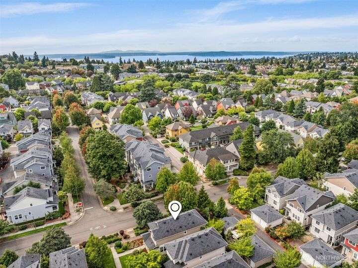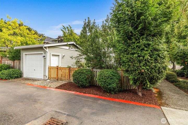 Step into this sunlit retreat, set on a large corner lot — a rare combo for this neighborhood. The detached home balances privacy with community charm. The main level features soaring ceilings, abundant natural light, and an open kitchen with oversized island, stainless appliances, and ample storage, all flowing seamlessly into the dining and living areas anchored by a cozy fireplace. Upstairs, three bedrooms include a spacious primary suite with walk-in closet and private bath. Outside, enjoy a fully fenced backyard with patio, apple trees, grapevines, and your own strawberries and blueberries. A detached garage adds both security and convenience. With an easy commute to downtown Seattle, this turn-key home blends comfort and lifestyle.