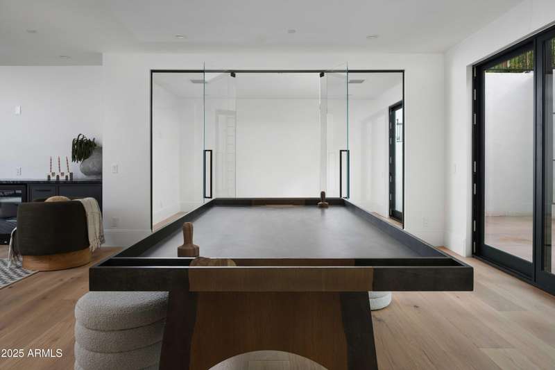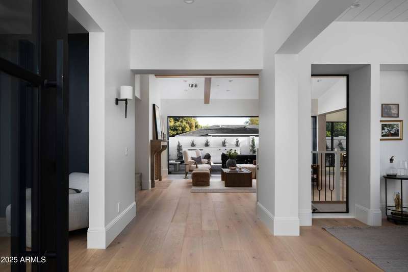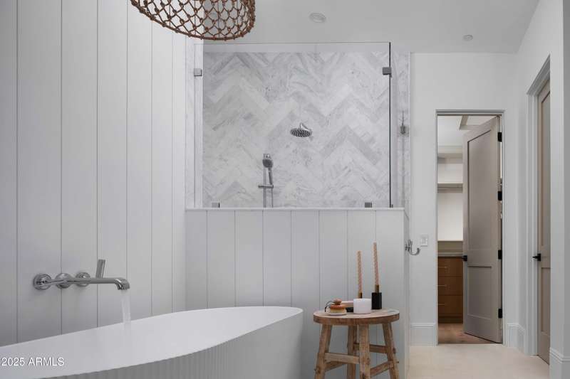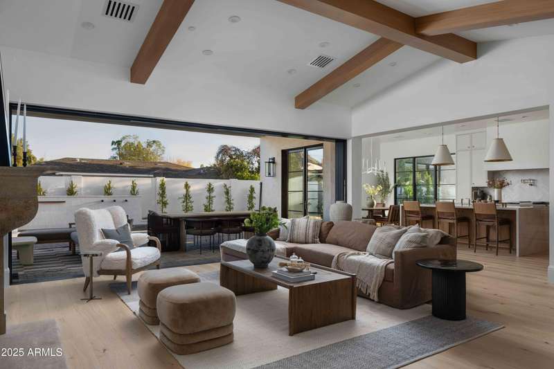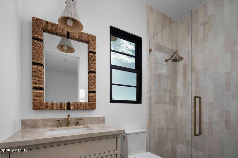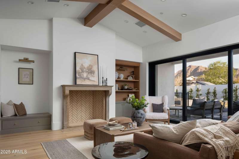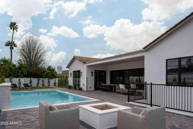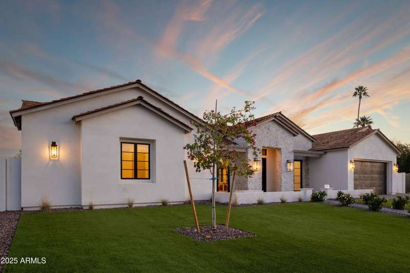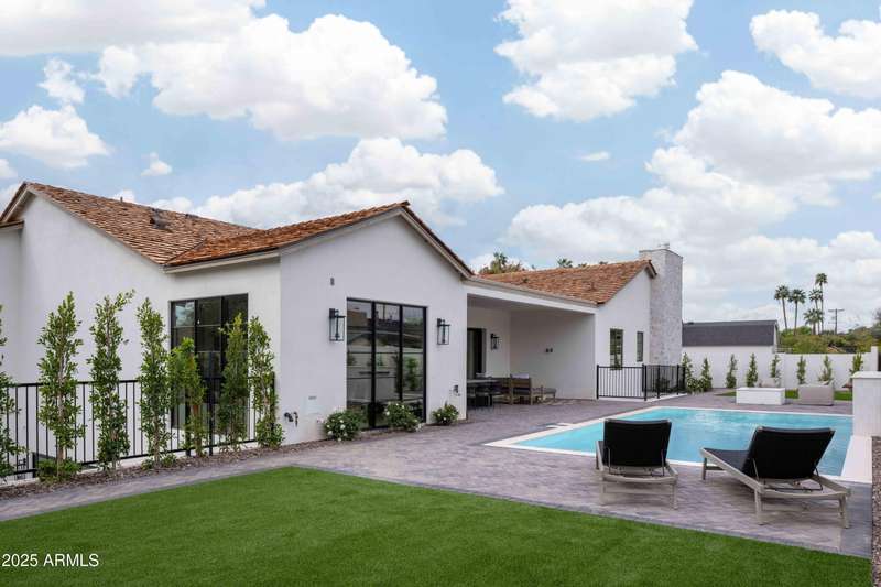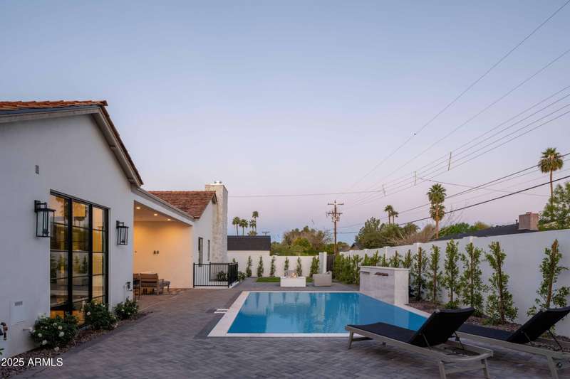 Experience the best of Arcadia Proper living in this exquisite coastal-style estate by Toon Co. Development. Set with the stunning backdrop of Camelback Mountain, this newly constructed five-bedroom, six-and-a-half-bath home spans 5,213 square feet on a generous one-third-acre lot. From the moment you arrive, you will appreciate the shake roof and timeless curb appeal, while inside, reclaimed French limestone fireplaces in the family room and master retreat provide a sense of warm sophistication. The open-concept main level is designed for full family living, featuring a dedicated office, formal dining room, gourmet kitchen, inviting gathering areas, and a seamless transition to the covered patio and sparkling pool—perfect for effortless indoor-outdoor living. Downstairs, a large basement with two walkout patios adds another layer of versatility, offering a game room, theater, gym, powder bath, wet bar, and full guest quarters. Whether you're seeking ample space for children and extended family or a private retreat for hosting friends, the thoughtfully designed lower level meets every lifestyle need. A three-car garage provides generous storage for vehicles, a golf cart, bikes, and toys, while the home's expansive square footage ensures comfort and functionality across the entire property.