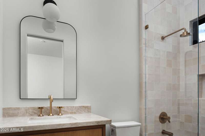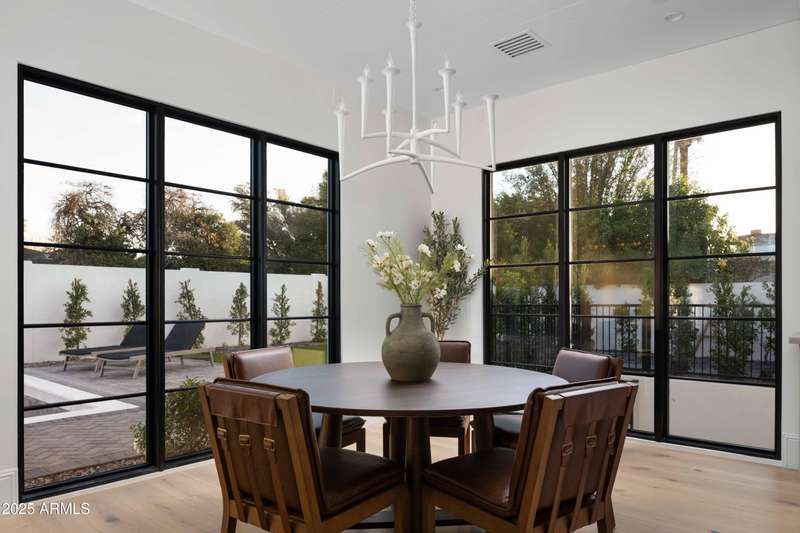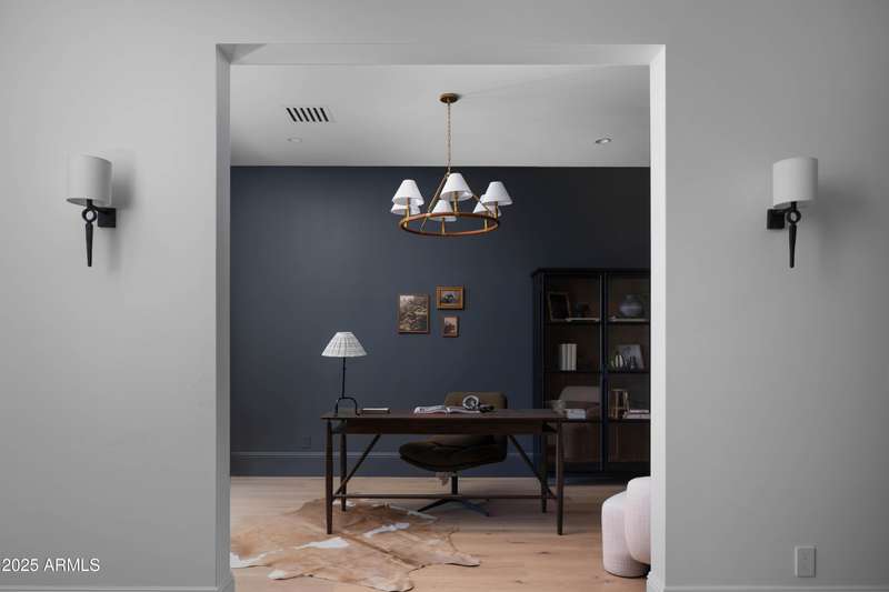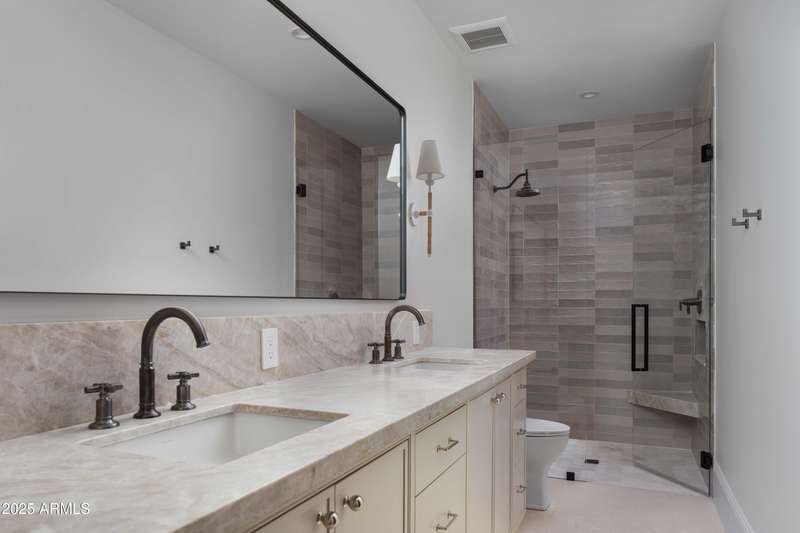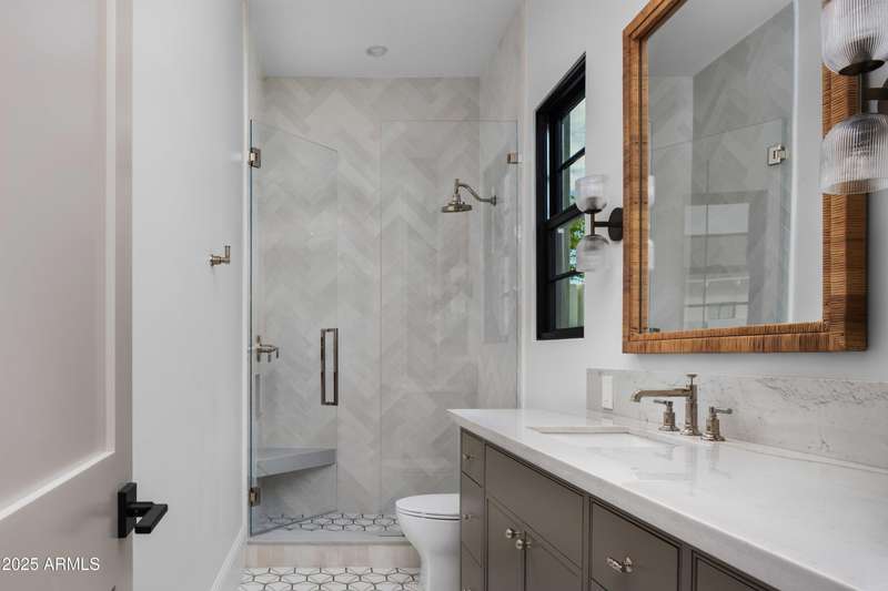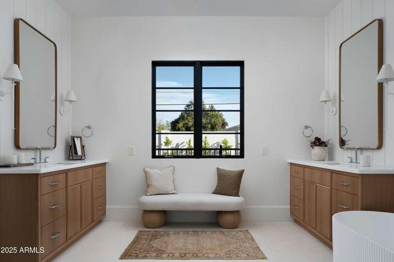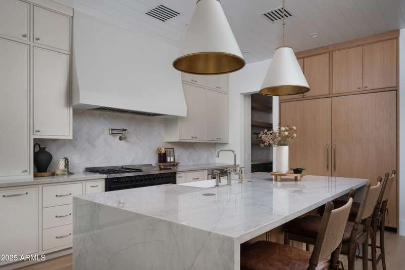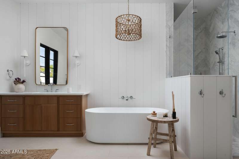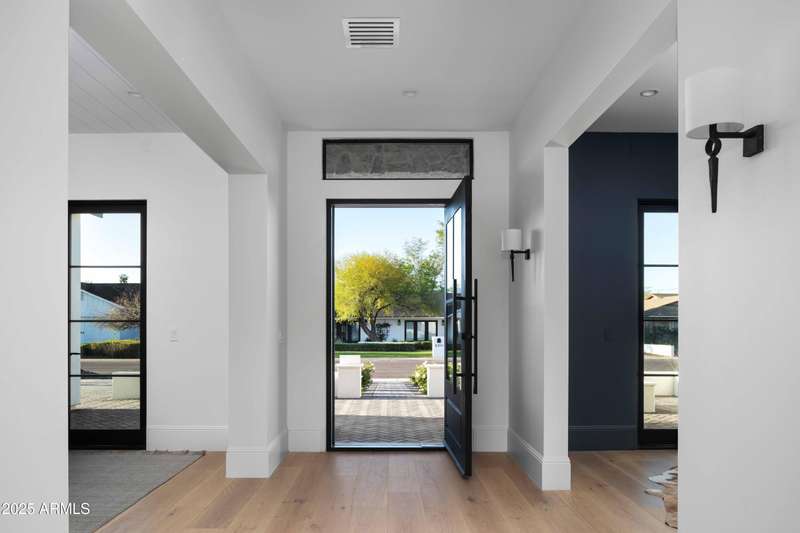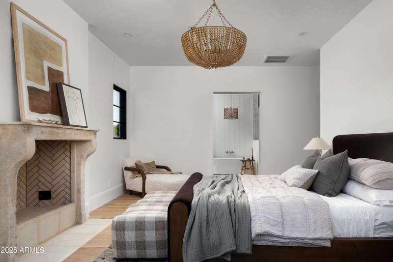 Experience the best of Arcadia Proper living in this exquisite coastal-style estate by Toon Co. Development. Set with the stunning backdrop of Camelback Mountain, this newly constructed five-bedroom, six-and-a-half-bath home spans 5,213 square feet on a generous one-third-acre lot. From the moment you arrive, you will appreciate the shake roof and timeless curb appeal, while inside, reclaimed French limestone fireplaces in the family room and master retreat provide a sense of warm sophistication. The open-concept main level is designed for full family living, featuring a dedicated office, formal dining room, gourmet kitchen, inviting gathering areas, and a seamless transition to the covered patio and sparkling pool—perfect for effortless indoor-outdoor living. Downstairs, a large basement with two walkout patios adds another layer of versatility, offering a game room, theater, gym, powder bath, wet bar, and full guest quarters. Whether you're seeking ample space for children and extended family or a private retreat for hosting friends, the thoughtfully designed lower level meets every lifestyle need. A three-car garage provides generous storage for vehicles, a golf cart, bikes, and toys, while the home's expansive square footage ensures comfort and functionality across the entire property.
