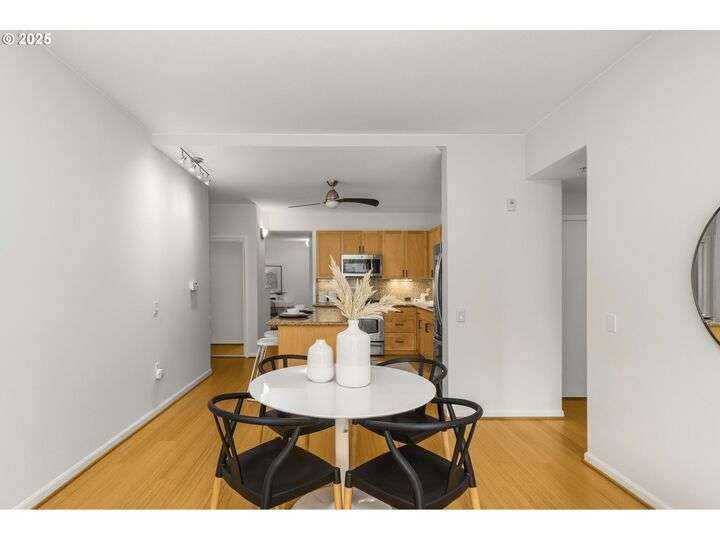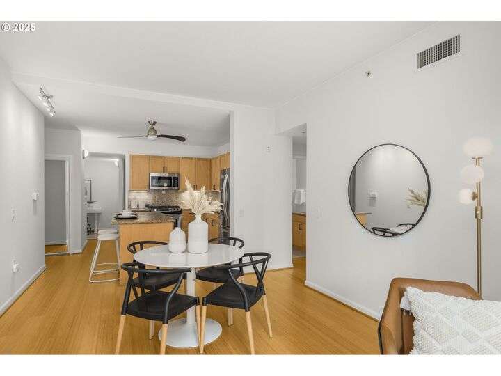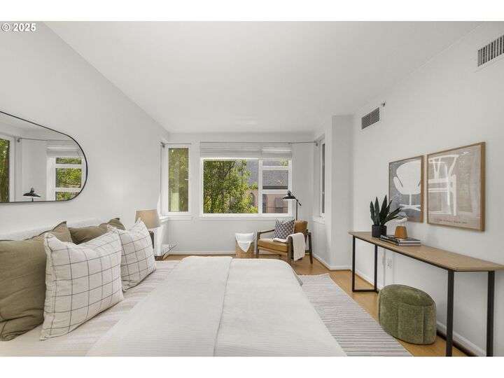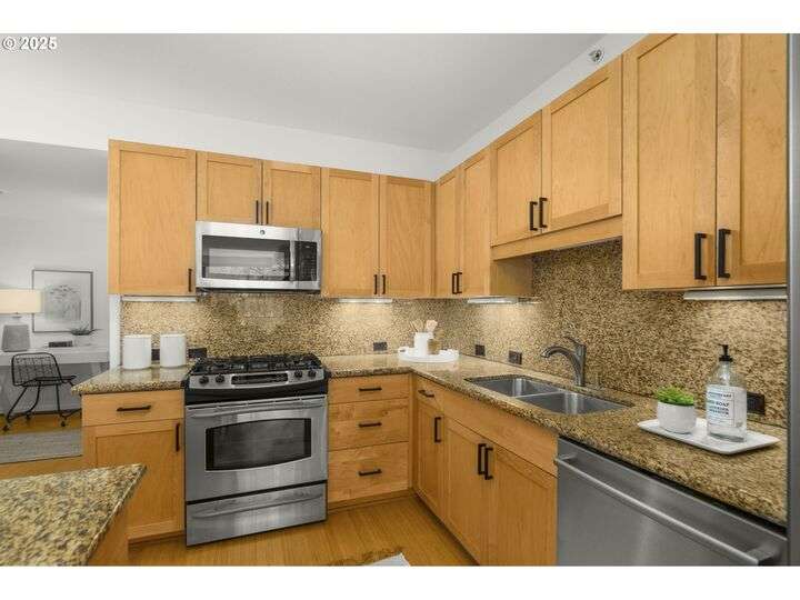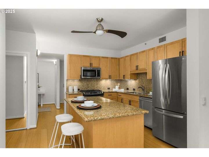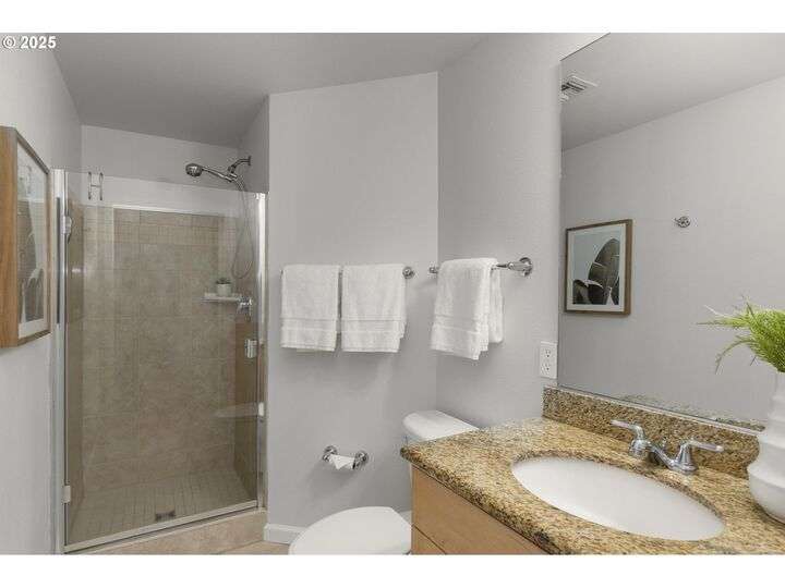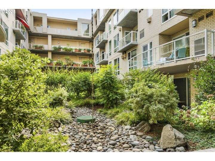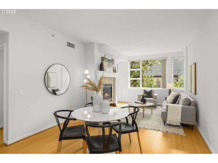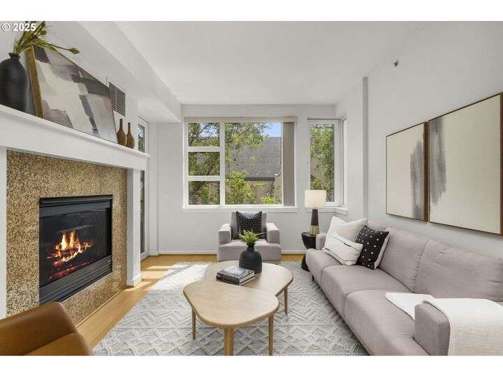 Welcome to this Charming Contemporary Condo in the heart of Northeast, one of Portland’s most desirable neighborhoods. This south-facing residence offers an abundance of natural light, high ceilings, and an open-concept design that blends modern style with everyday comfort. The beautifully appointed kitchen is a chef’s dream, featuring granite countertops, a gas range, stainless steel appliances, and an inviting eat-in bar perfect for entertaining. The living area boasts bamboo floors, a cozy gas fireplace, and access to a private balcony where you can enjoy the sunny, southern exposure. The primary suite is a true retreat, complete with three double closets offering ample storage and an en-suite bath featuring a tub/shower combo and double sinks. A versatile den provides extra space for a home office, while a convenient laundry room with built-in cabinetry ensures additional organization, tucked out of sight. This home also includes two parking spaces and a secure storage unit. Set within a beautifully maintained community with lush courtyards and common areas, this condo is just steps from coffee shops, restaurants, and grocery stores. With an impressive Walk Score of 95 and Bike Score of 100, you’ll enjoy effortless access to everything this vibrant neighborhood has to offer. Don’t miss this opportunity to own a stunning, move-in-ready home in one of Portland’s best locations!