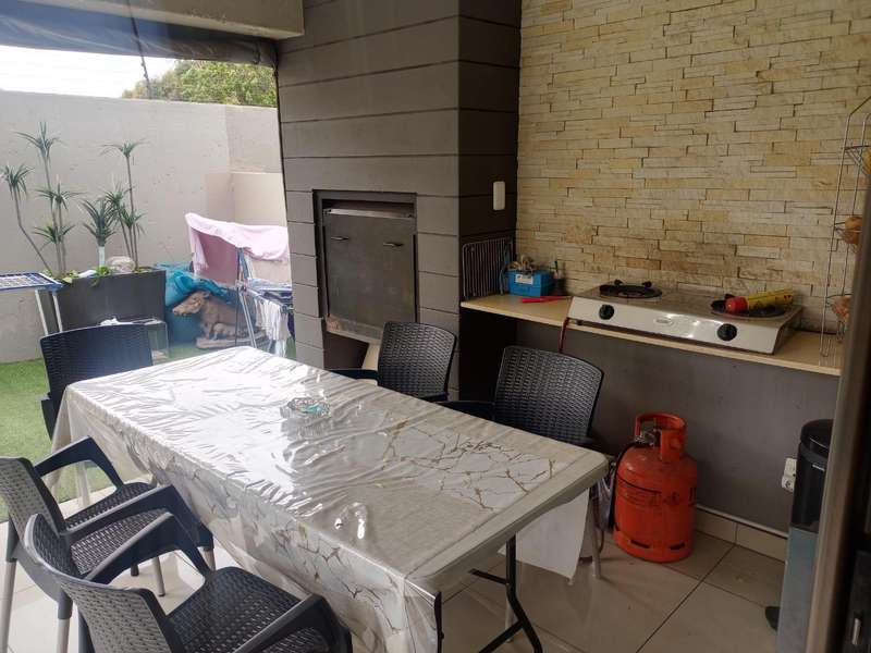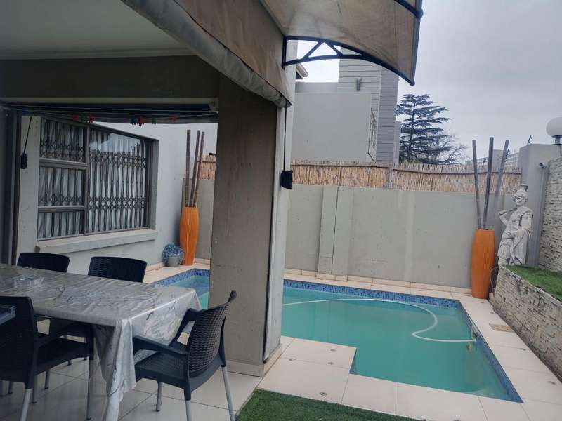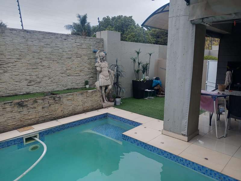 Step outside to the patio, complete with a built-in braai, that overlooks the sparkling blue pool and a charming garden area.