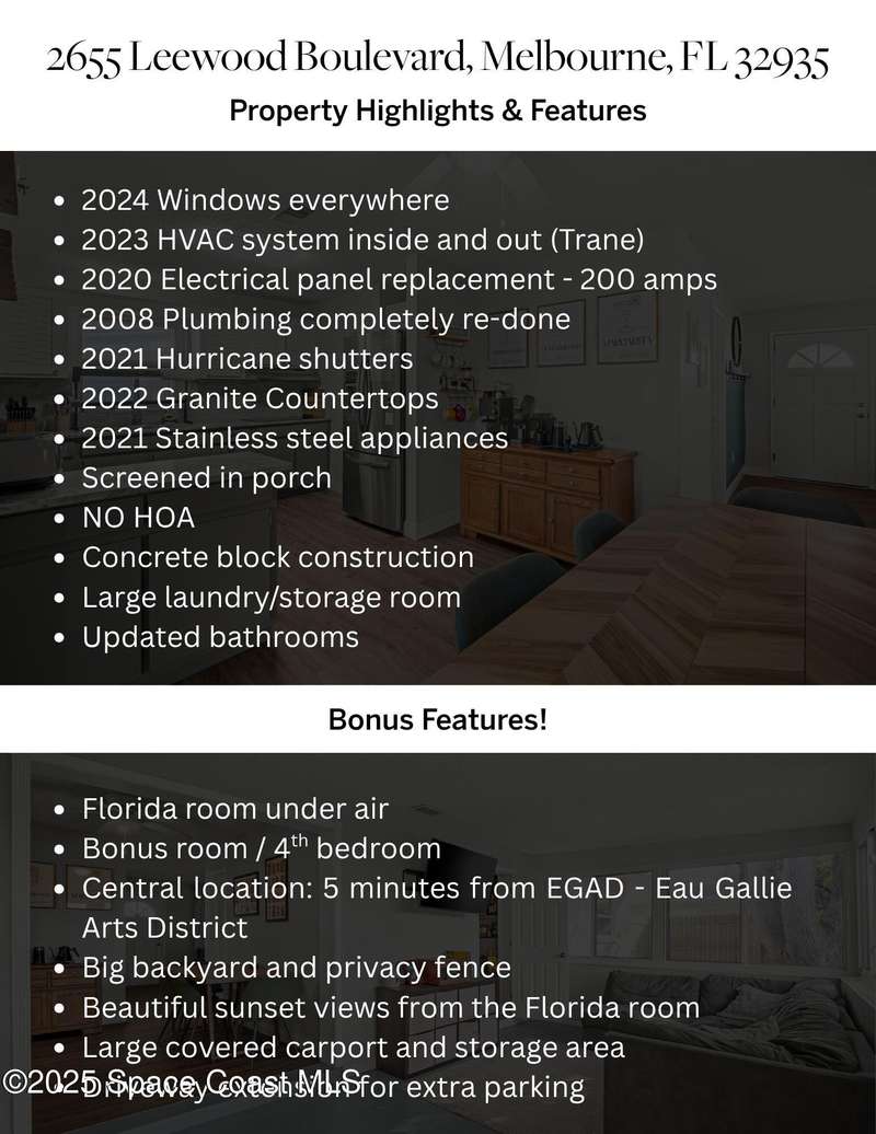 Beautifully updated and move-in ready, this Melbourne gem blends comfort, style, and peace of mind. Featuring 2024 windows & shutters, a 2023 Trane HVAC system, 2022 granite counters, and 2021 stainless steel appliances & flooring, plus updated plumbing! The open layout includes a bright Florida room under air, updated baths, and a bonus room perfect as a 4th bedroom or office. Enjoy gorgeous sunset views from the screened porch or private backyard with a full privacy fence. Concrete block construction, a newer 200-amp electrical panel, and hurricane shutters offer lasting security. With a large laundry room, covered carport, and no HOA, this home delivers space, freedom, and convenience-just 5 minutes from the vibrant Eau Gallie Arts District.
