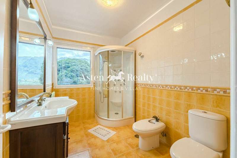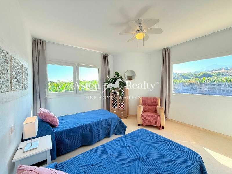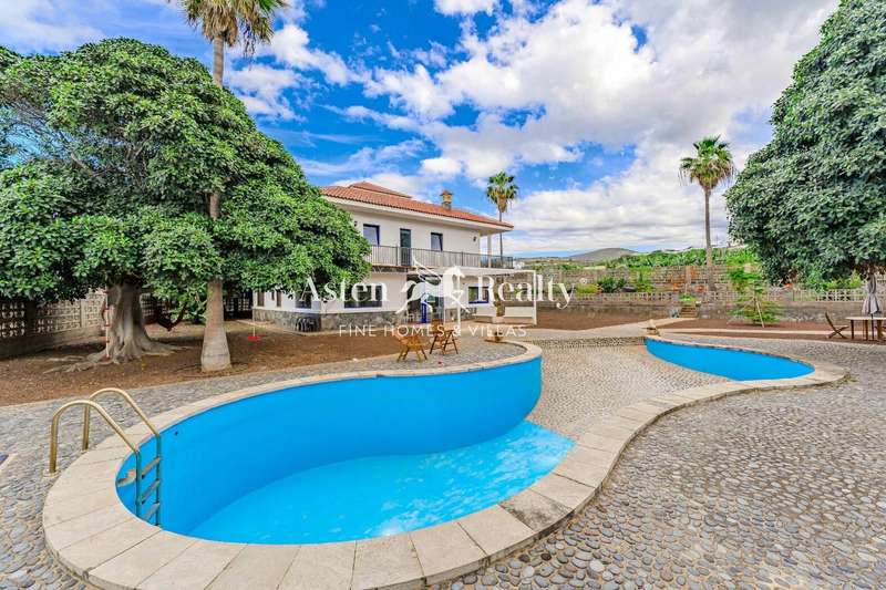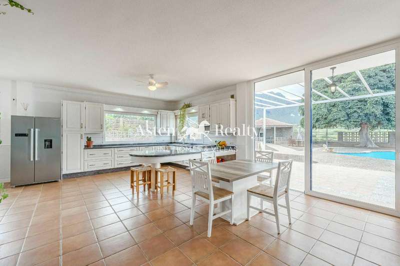 The stately home, built over two floors, has been renovated to include large windows that maximize views of the ocean, Teide, and the lush surrounding landscape. The ground floor features an open-plan living-dining area with an integrated kitchen of approximately 100 m², opening directly onto the terrace, the 76 m² saltwater pool, and the barbecue area. Additionally, it includes a full bathroom, a service area, and a large garage.