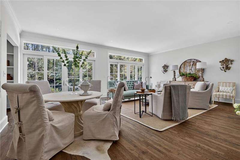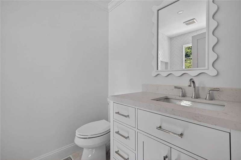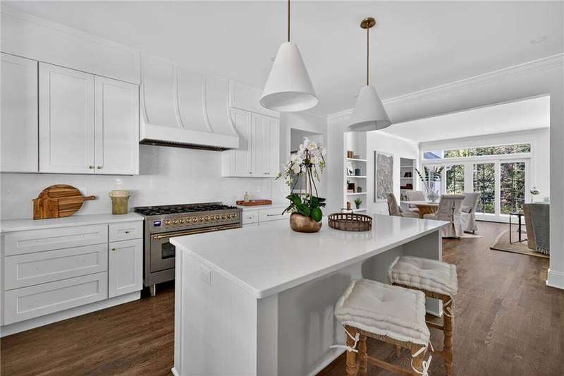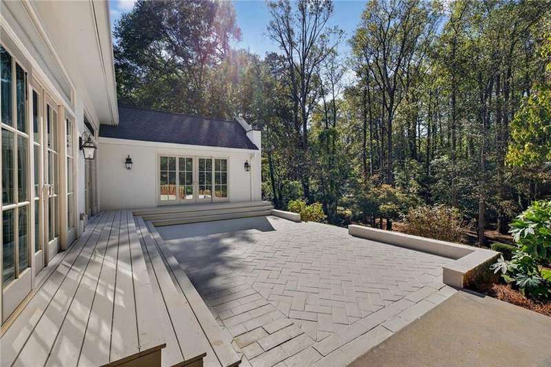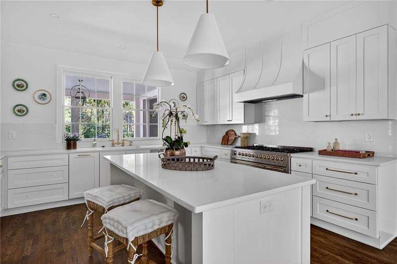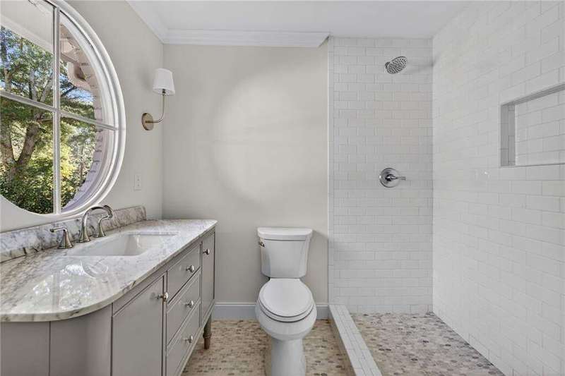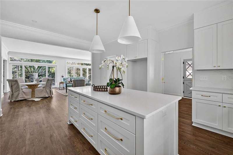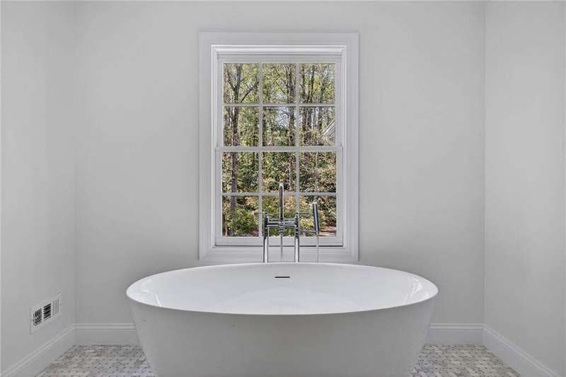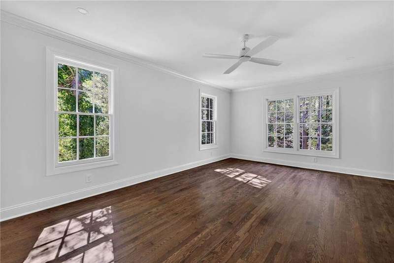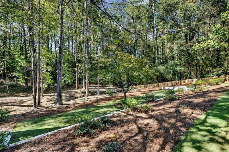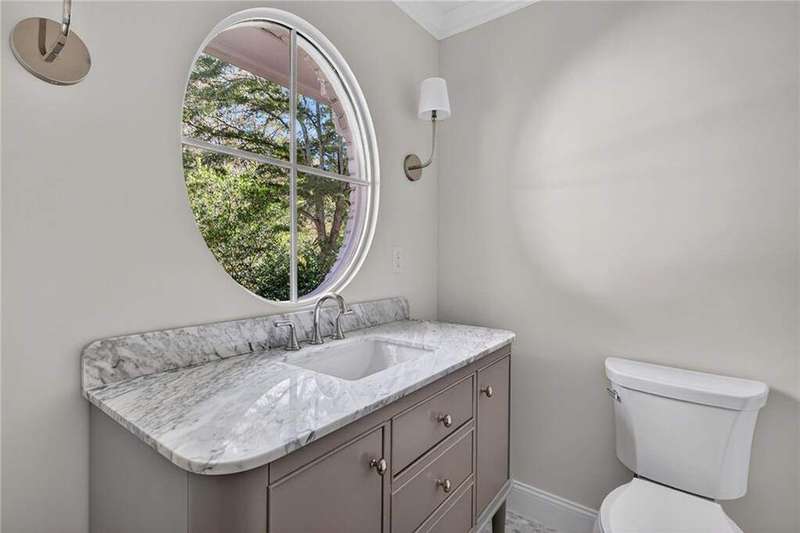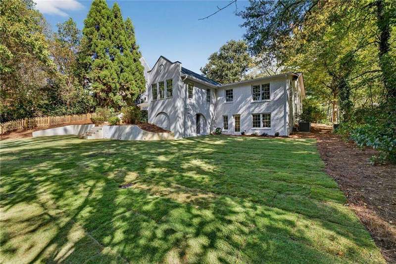 Tucked in the coveted Castlewood neighborhood, this stunning Buckhead home has been completely renewed from the ground up under the direction of award-winning architect Claire Smith and designer Nona Pappas. Set on a rare one-acre, pool-ready lot, the home balances classic architecture with a clean, modern feel. The main level flows effortlessly between the dining room with a wood-burning fireplace, sunroom, kitchen, and living areas, all opening up to the gorgeous, flat backyard that is perfect for family activities, entertaining, or a future pool. Hardwood floors throughout and tall French doors fill the home with natural light and enhance the sense of indoor-outdoor living. The kitchen features custom cabinetry, Calacatta Venezia quartz counters and backsplash, a walk-in pantry, an Italian-made 48" range, and premium unlacquered brass plumbing fixtures. The main-level primary suite offers peaceful garden views and a luxurious bath with marble finishes, polished nickel plumbing fixtures, and custom cabinetry. High-end details run throughout the home, including Circa lighting and a marble sink in the powder bath. Two additional bedrooms with en-suite baths complete the main level. The terrace level provides two guest suites, generous living space, and is stubbed for a future kitchenette. Located just a short golf cart ride from Morris Brandon, the home offers easy access to Atlanta's top private schools and the best of Buckhead living. Every detail, from ceiling heights to window placement, reflects thoughtful architecture that feels both classic and current.