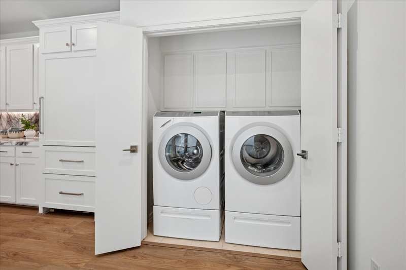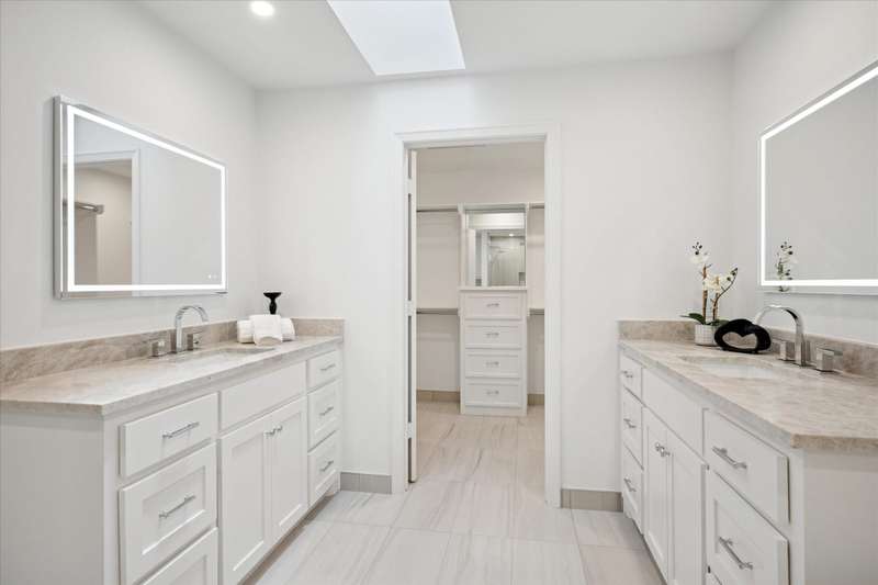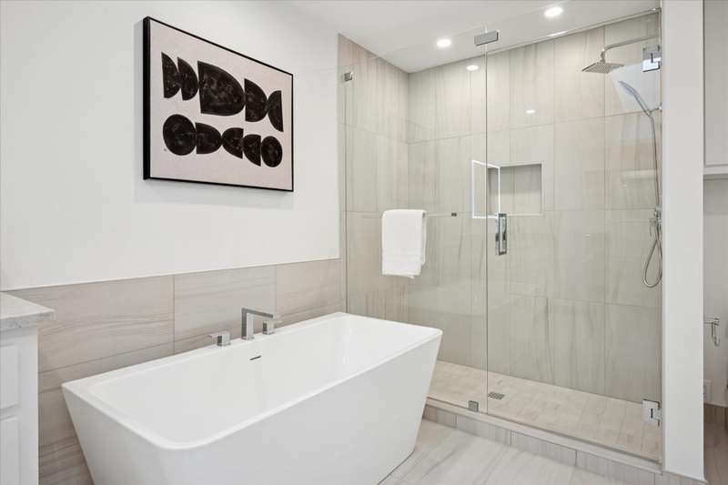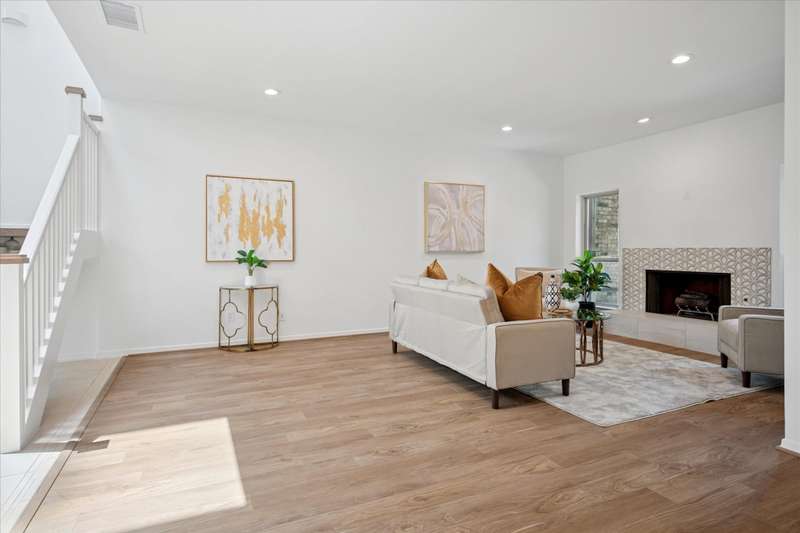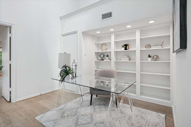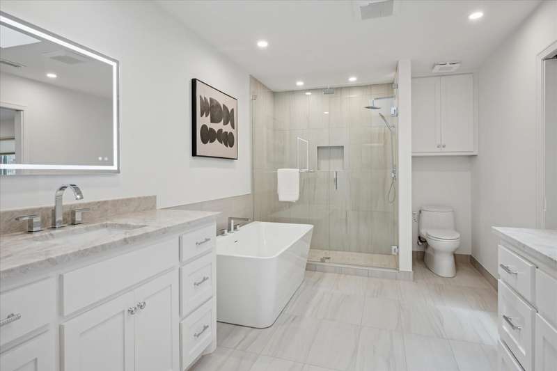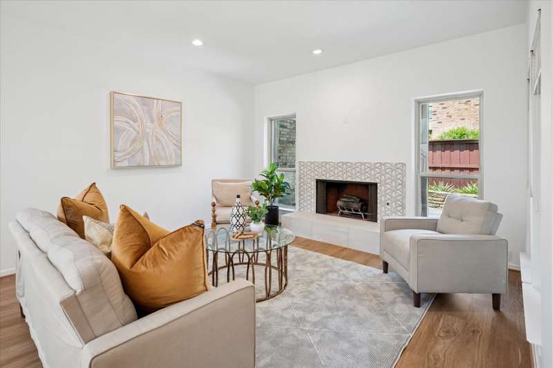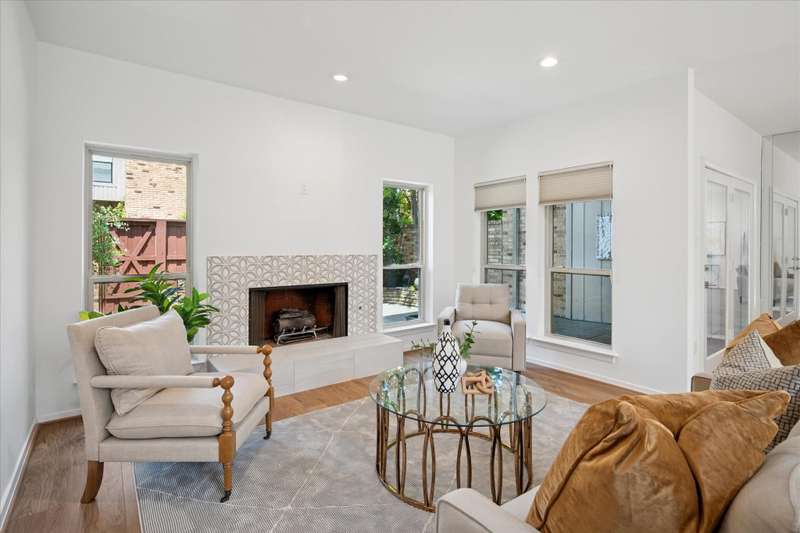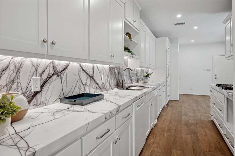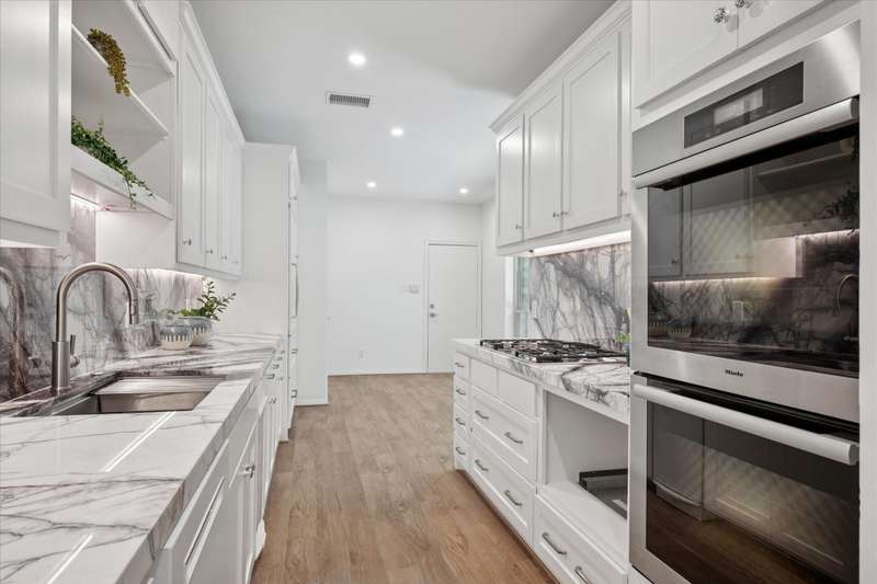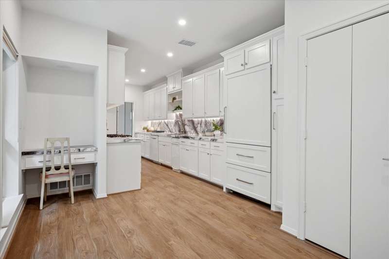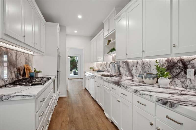 Ultra Sophisticated & Recently Remodeled! This stunning home blends modern luxury with timeless elegance, featuring soaring ceilings, abundant natural light, and courtyard views that evoke the charm of New Orleans. The open, flowing floorplan is anchored by a chefs kitchen reconfigured with precision: a 36 inch Miele gas cooktop with Viking downdraft, Miele double ovens, paneled Sub Zero refrigerator freezer, Bosch dishwasher, and Insta Hot water. Custom soft close cabinetry is finished with designer hardware, while dramatic Lilac Classic Extra marble countertops and full backsplashes make a bold statement. A large stainless sink with integrated accessories and LED under cabinet lighting complete this dream space. The primary suite is a true retreat, offering a sitting area, dual custom walk in closets, and a spa like bath with porcelain tile, his and hers vanities with Taj Mahal countertops, Brizo faucets, lighted defogging mirrors, a freestanding soaking tub, and a frameless glass shower with thermal mixer, rainfall, and hand shower. The secondary suite is equally refined with a new vanity, deep soaking tub, porcelain tile, and skylight. Additional highlights include all new LED lighting, modern ceiling fans, beautiful wood and tile flooring, a dramatic open tread white oak staircase, designer fireplace surround, Hunter Douglas shades, and a loft with built ins under natural skylights. The peaceful stamped concrete patio with planter beds invites outdoor living, while the oversized garage easily accommodates a full size crew cab truck. Miele washer and dryer, refrigerator and freezer in garage, and full sprinkler system are included. Every detail from Toto toilets to Baldwin hardware reflects thoughtful design and high end finishes, creating a home that is both sophisticated and welcoming.