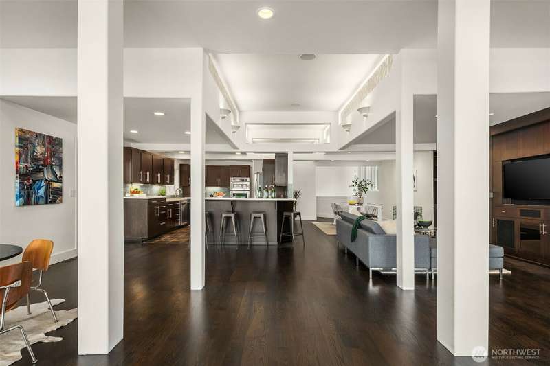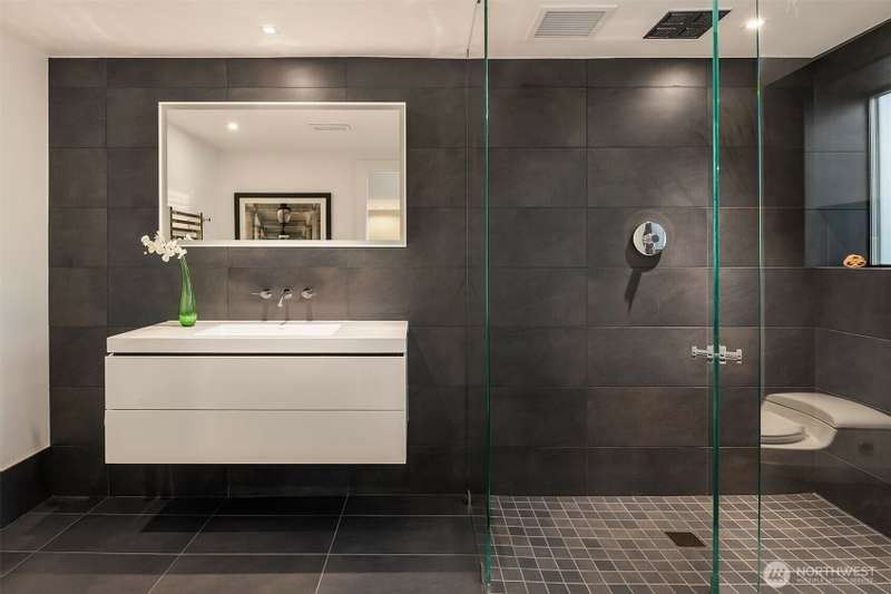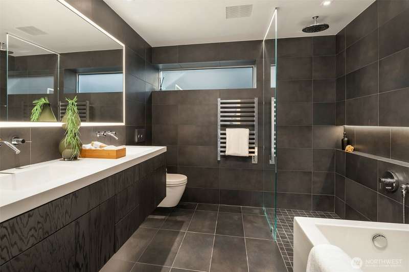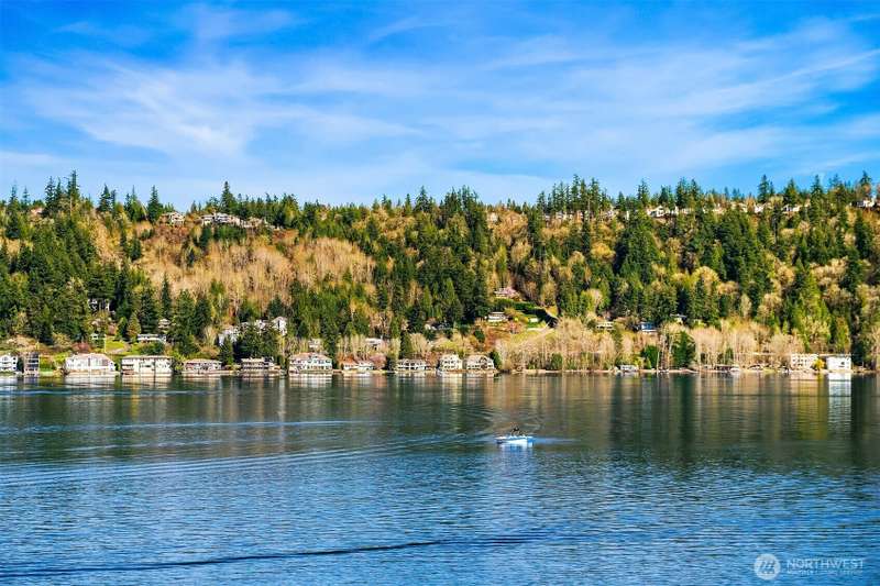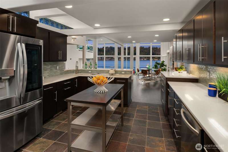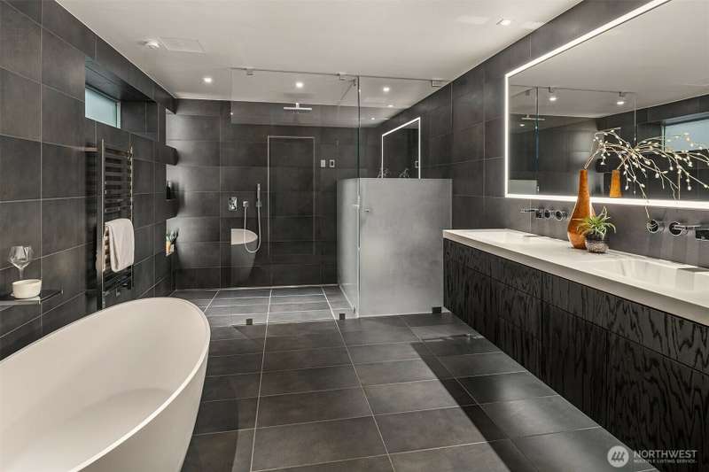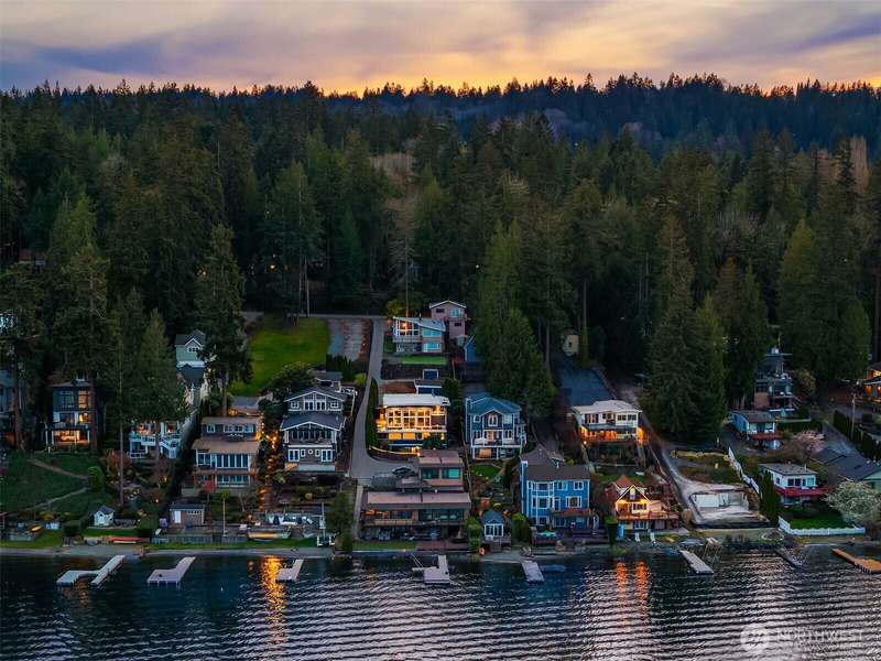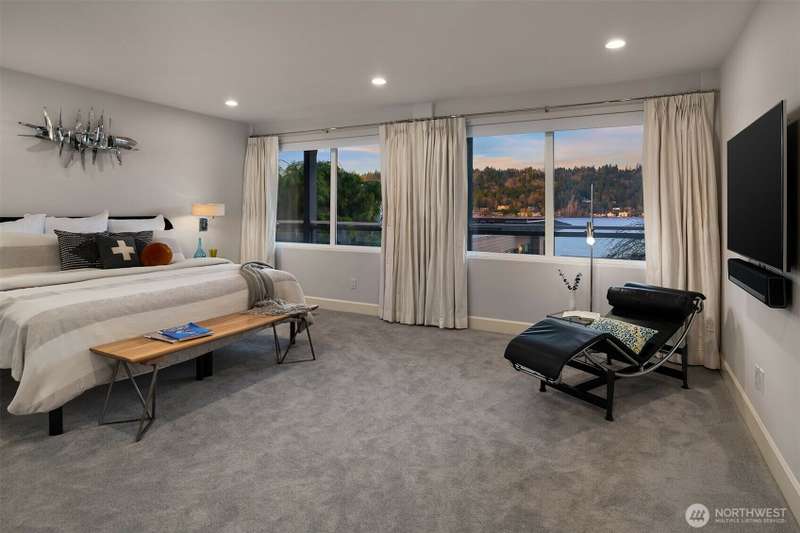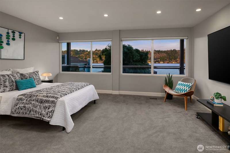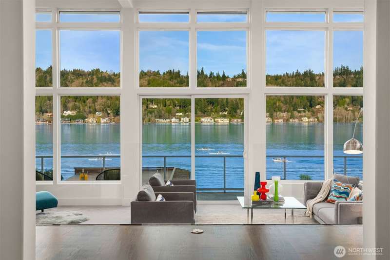 Spectacular Lake Sammamish view home with floor-to-ceiling windows framing jaw-dropping 180-degree vistas of liquid blue. Extensively remodeled with high-end finishes, this architectural gem offers sophisticated living. A dramatic great room sits beneath a lofted office, commanding expansive views. The luxurious primary suite boasts a spa-like bath that rivals boutique hotels, with a sleek floating vanity, heated floors and a freestanding tub. Entertainers will appreciate the wine cellar, gourmet kitchen and perfectly positioned spaces to soak in breathtaking scenery. Modern amenities include Lutron lighting, automatic blinds, a 3-car garage with EV charging, and a seamless transition from bright airy days to sophisticated evening ambiance.