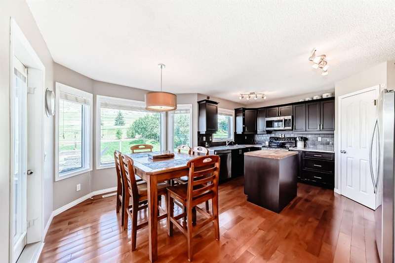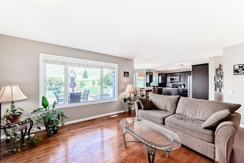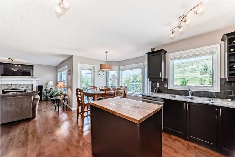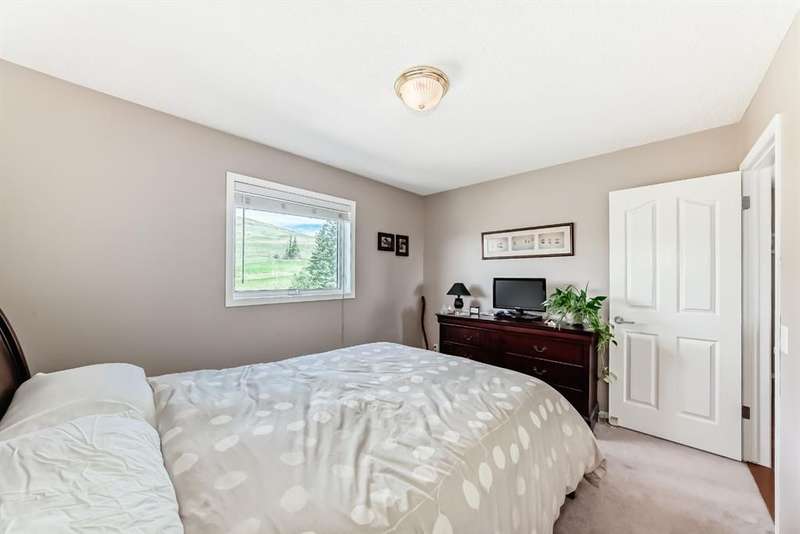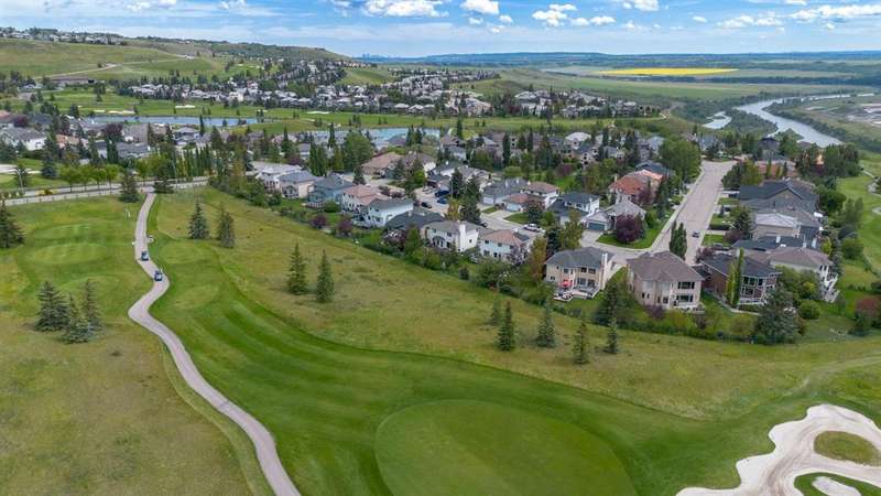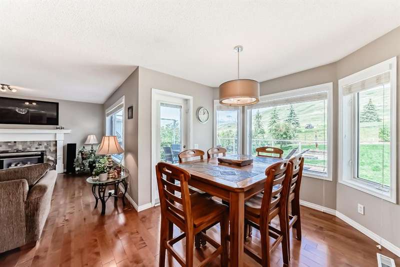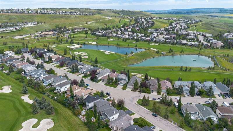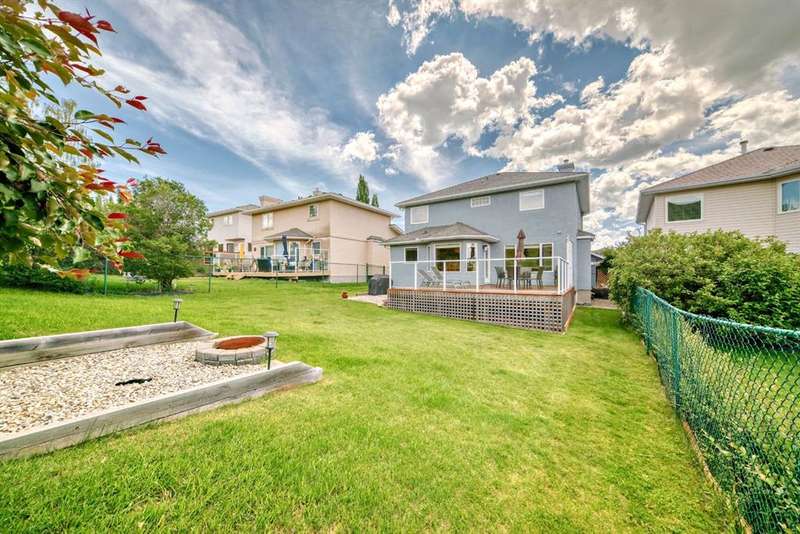 Welcome to your dream home—an immaculate and fully finished two-storey residence perfectly positioned on a quiet, desirable street and backing onto the golf course (with no stray balls). Enjoy peaceful mornings and unforgettable evenings with gorgeous mountain views, a beautifully landscaped large yard, and an expansive deck that's perfect for entertaining or relaxing. Perfectly surrounded by mature trees, and with a relaxing fire pit area, this yard is an ideal outdoor oasis. This ideal location gives you a perfect view of the hang gliders from the Cochrane Hill, plus it has easy access to the Glenbow Ranch Provincial Park trails which are part of the Trans Canada Trail system. For those with young families, you'll appreciate the park and playground nearby. Inside, this thoughtfully designed home offers plenty of options and tons of finished living space. The main floor is both functional and elegant, offering a formal dining room, front sitting room, bright breakfast nook, and a large living room with a cozy gas fireplace and gorgeous backyard and golf course views. The kitchen is updated with stainless steel appliances, a corner pantry, island counter, and views that will make meal prep a pleasure. A 2-piece powder room and convenient laundry room complete the main level. The upper level features three spacious bedrooms, including a huge primary suite with a luxurious full ensuite with oversized jetted tub and a walk-in closet. This bedroom is very oversized, easily fitting a king bed and large furniture while still allowing space to move. Up here, you'll also find two more good sized bedrooms and another full bathroom for kids or guests. Downstairs, the fully developed lower level boasts a fourth bedroom, full bathroom, a large rec room with ceiling outlets, an exercise area, and ample storage for all your needs. The convenient double garage also offers plenty of built-in storage space. Whether you're hosting gatherings or enjoying a quiet evening under the stars, this exceptional home blends comfort, style, and location in one unbeatable package. Don’t miss your chance to live in one of the area's most sought-after neighborhoods!