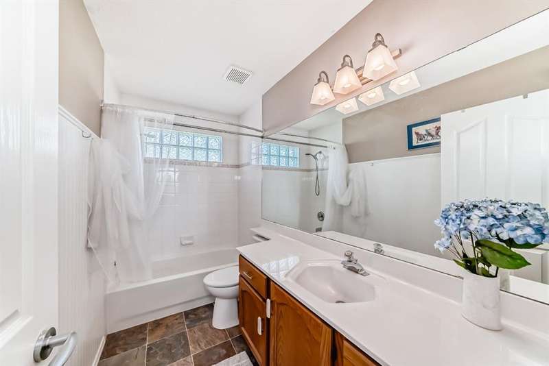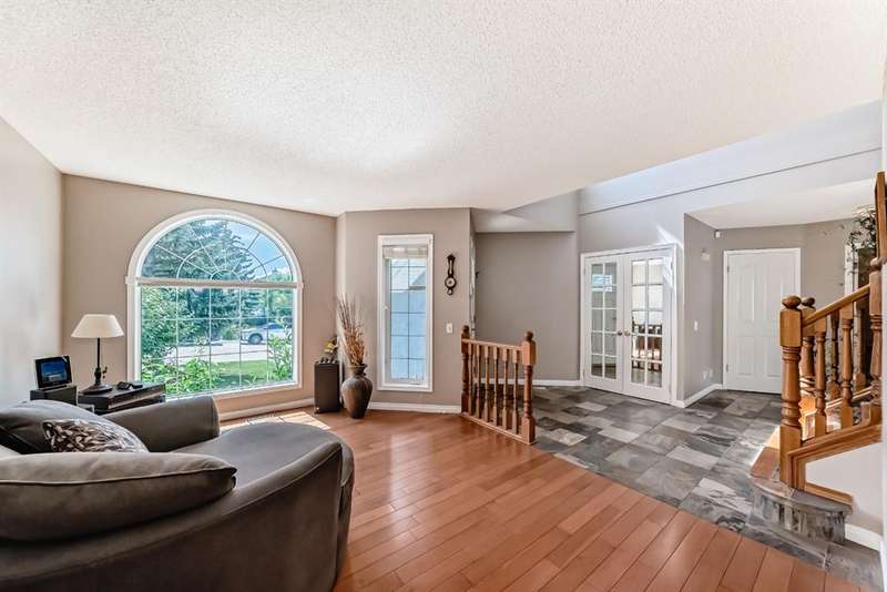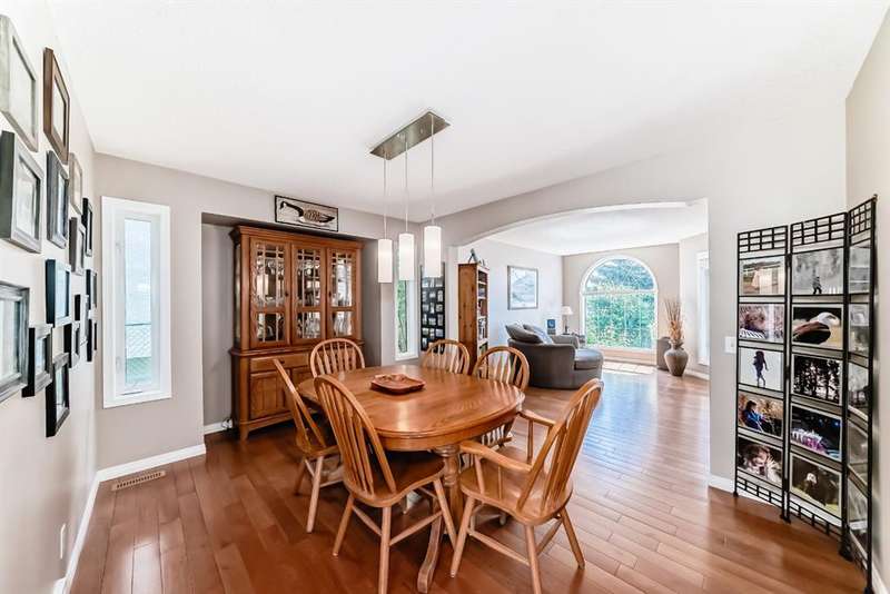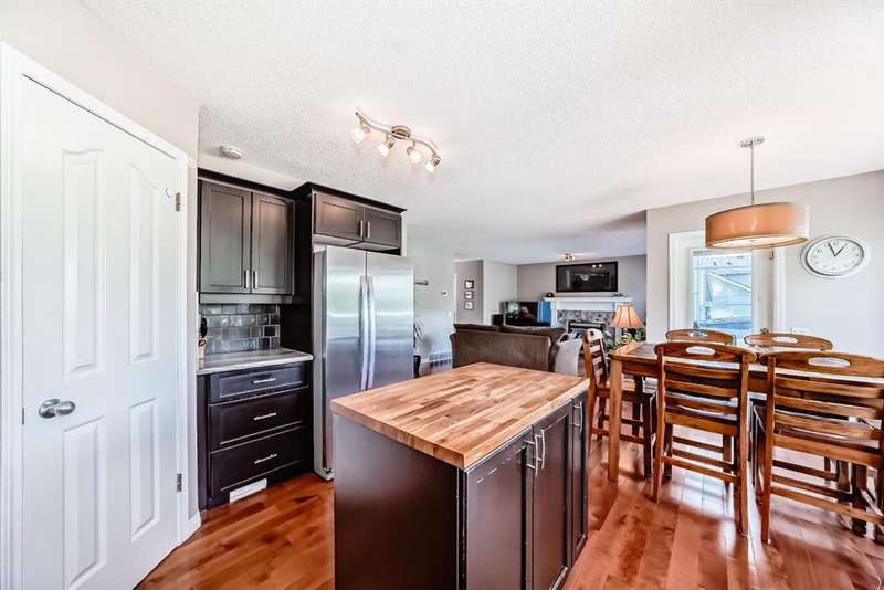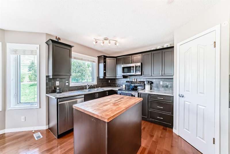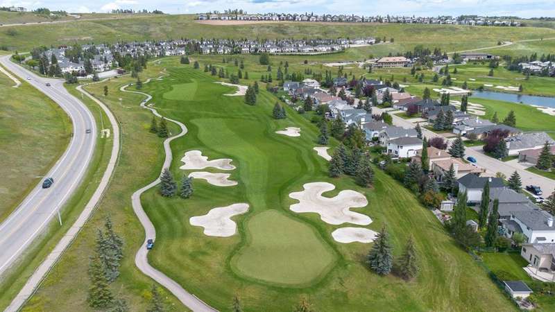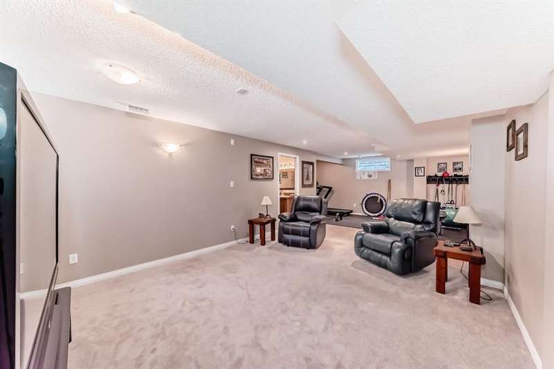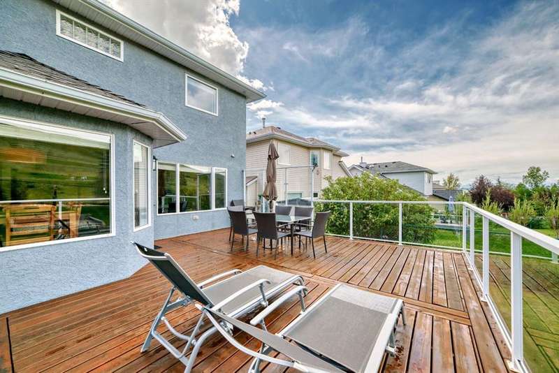 Welcome to your dream home—an immaculate and fully finished two-storey residence perfectly positioned on a quiet, desirable street and backing onto the golf course (with no stray balls). Enjoy peaceful mornings and unforgettable evenings with gorgeous mountain views, a beautifully landscaped large yard, and an expansive deck that's perfect for entertaining or relaxing. Perfectly surrounded by mature trees, and with a relaxing fire pit area, this yard is an ideal outdoor oasis. This ideal location gives you a perfect view of the hang gliders from the Cochrane Hill, plus it has easy access to the Glenbow Ranch Provincial Park trails which are part of the Trans Canada Trail system. For those with young families, you'll appreciate the park and playground nearby. Inside, this thoughtfully designed home offers plenty of options and tons of finished living space. The main floor is both functional and elegant, offering a formal dining room, front sitting room, bright breakfast nook, and a large living room with a cozy gas fireplace and gorgeous backyard and golf course views. The kitchen is updated with stainless steel appliances, a corner pantry, island counter, and views that will make meal prep a pleasure. A 2-piece powder room and convenient laundry room complete the main level. The upper level features three spacious bedrooms, including a huge primary suite with a luxurious full ensuite with oversized jetted tub and a walk-in closet. This bedroom is very oversized, easily fitting a king bed and large furniture while still allowing space to move. Up here, you'll also find two more good sized bedrooms and another full bathroom for kids or guests. Downstairs, the fully developed lower level boasts a fourth bedroom, full bathroom, a large rec room with ceiling outlets, an exercise area, and ample storage for all your needs. The convenient double garage also offers plenty of built-in storage space. Whether you're hosting gatherings or enjoying a quiet evening under the stars, this exceptional home blends comfort, style, and location in one unbeatable package. Don’t miss your chance to live in one of the area's most sought-after neighborhoods!