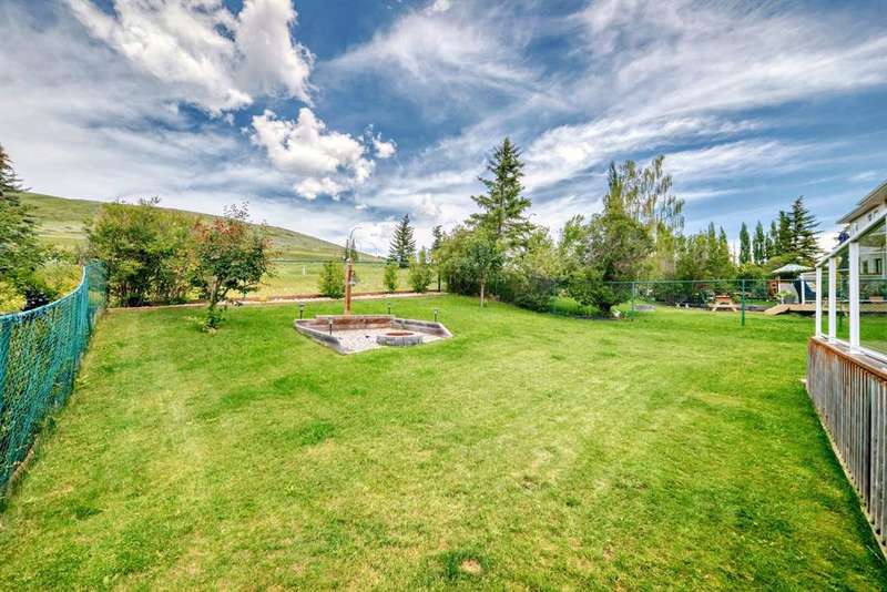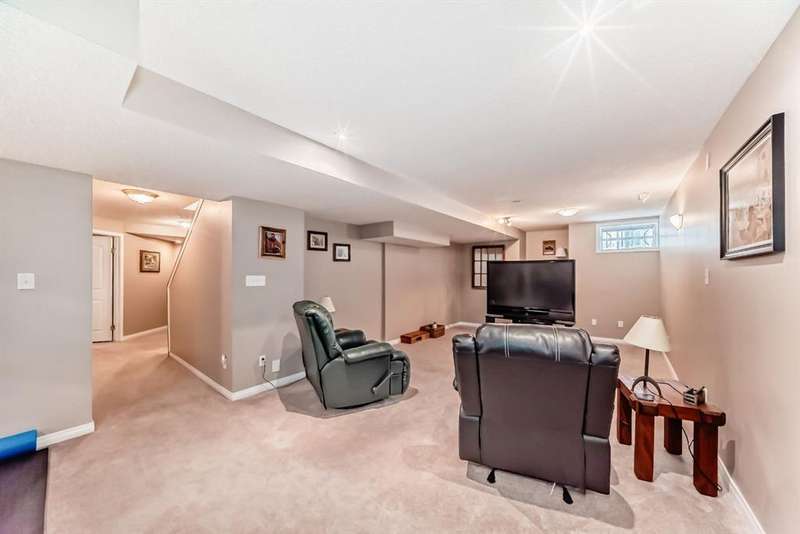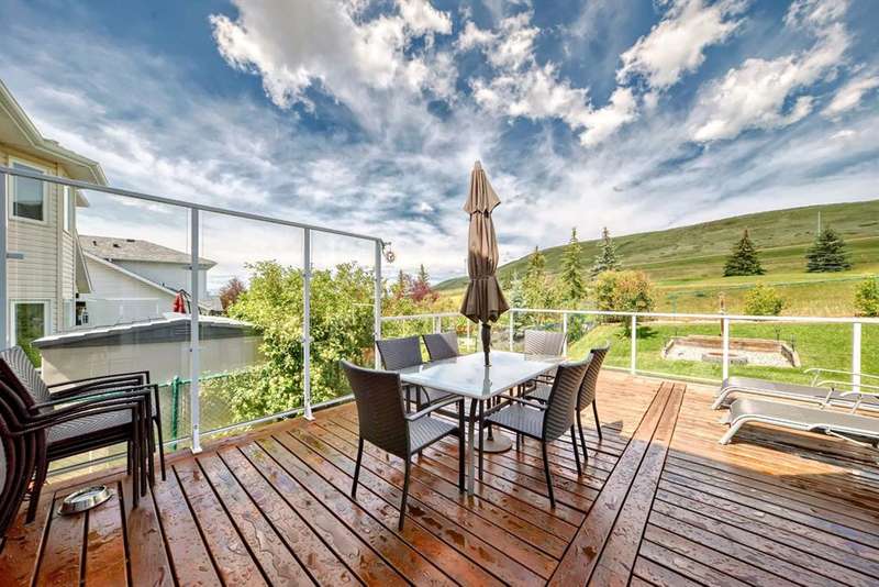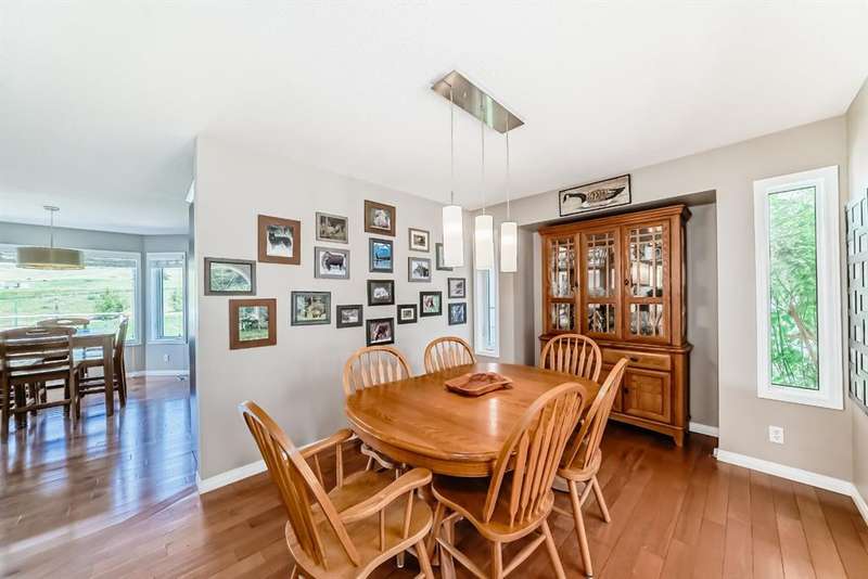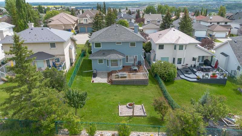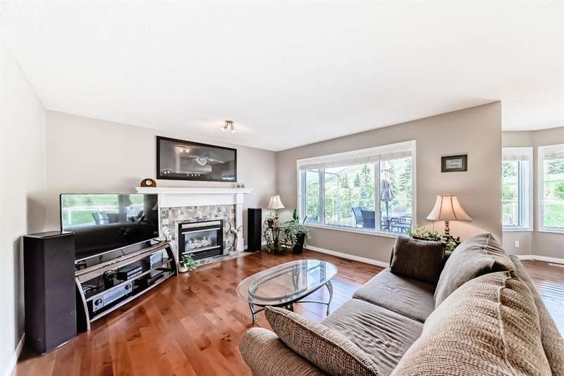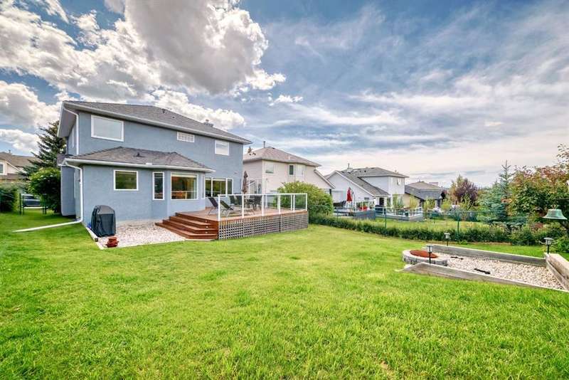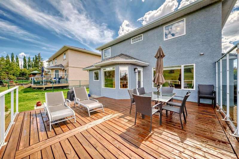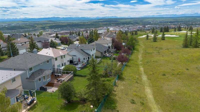 Welcome to your dream home—an immaculate and fully finished two-storey residence perfectly positioned on a quiet, desirable street and backing onto the golf course (with no stray balls). Enjoy peaceful mornings and unforgettable evenings with gorgeous mountain views, a beautifully landscaped large yard, and an expansive deck that's perfect for entertaining or relaxing. Perfectly surrounded by mature trees, and with a relaxing fire pit area, this yard is an ideal outdoor oasis. This ideal location gives you a perfect view of the hang gliders from the Cochrane Hill, plus it has easy access to the Glenbow Ranch Provincial Park trails which are part of the Trans Canada Trail system. For those with young families, you'll appreciate the park and playground nearby. Inside, this thoughtfully designed home offers plenty of options and tons of finished living space. The main floor is both functional and elegant, offering a formal dining room, front sitting room, bright breakfast nook, and a large living room with a cozy gas fireplace and gorgeous backyard and golf course views. The kitchen is updated with stainless steel appliances, a corner pantry, island counter, and views that will make meal prep a pleasure. A 2-piece powder room and convenient laundry room complete the main level. The upper level features three spacious bedrooms, including a huge primary suite with a luxurious full ensuite with oversized jetted tub and a walk-in closet. This bedroom is very oversized, easily fitting a king bed and large furniture while still allowing space to move. Up here, you'll also find two more good sized bedrooms and another full bathroom for kids or guests. Downstairs, the fully developed lower level boasts a fourth bedroom, full bathroom, a large rec room with ceiling outlets, an exercise area, and ample storage for all your needs. The convenient double garage also offers plenty of built-in storage space. Whether you're hosting gatherings or enjoying a quiet evening under the stars, this exceptional home blends comfort, style, and location in one unbeatable package. Don’t miss your chance to live in one of the area's most sought-after neighborhoods!