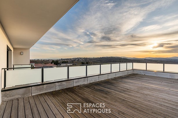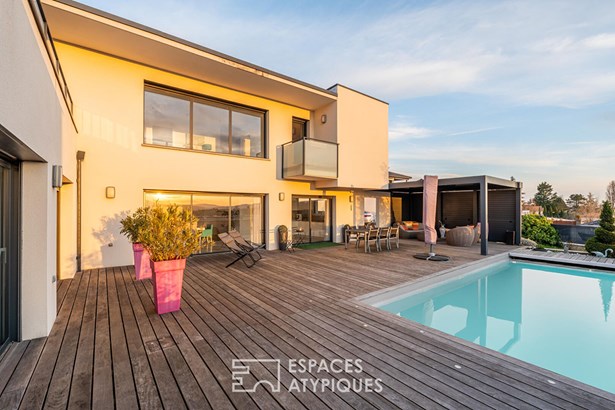Nestled in the heart of the prestigious town of Limonest, this contemporary villa of approximately 300 sqm offers a privileged living environment, combining modernity and comfort. Built on a landscaped plot of 1,020 sqm, it benefits from a breathtaking view of the sunset and the Monts du Lyonnais.