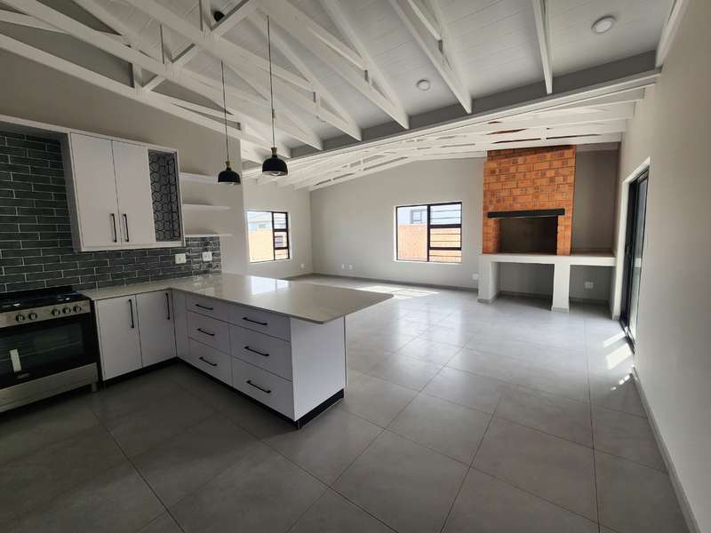 Brand New North-Facing Home in Fountains Estate – No Transfer Duty! Step into a fresh, contemporary lifestyle with this newly built, north-facing gem in the sought-after Fountains Estate, Jeffreys Bay. Designed with comfort, space, and easy living in mind, this home blends sleek modern finishes with a warm, inviting feel. Spacious & Modern Living: Set on a fully walled 640m² stand, the property offers plenty of secure outdoor space for children and pets. Inside, the 170m² layout under roof is light-filled and thoughtfully designed, Featuring: • 3 generous bedrooms • 2 stylish bathrooms (main en-suite) • Open-plan living and dining area with exposed trusses for extra volume and style A Kitchen That’s Both Functional & Stylish: • Ample cupboard space • Gas hob & electric oven • Seamless flow into living areas • Separate scullery with direct access to the garage Entertainer’s Dream: A built-in braai that doubles as a cozy fireplace makes entertaining easy year-round. Sliding doors open the living space to the outdoors, ready for you to make the most of the coastal lifestyle. Premium Features: ? Double automated garage (fully tiled & ceiling finished) ? Prepped platform for a 5000L water tank (tank not included) ? Brand-new alarm system & automatic front gate ? Fully enclosed garden – a blank canvas for your dream landscape Why This Home? With no transfer duty (VAT included in the price) and similar homes available directly from the developer, now is the perfect time to secure your spot in this thriving estate. Location: Fountains Estate, Jeffreys Bay Bedrooms: 3 Bathrooms: 2 Garage: Double automated Erf size: 640m² Under roof: 170m² Arrange a private viewing today and discover the lifestyle that makes Fountains Estate one of Jeffreys Bay’s most sought-after addresses.