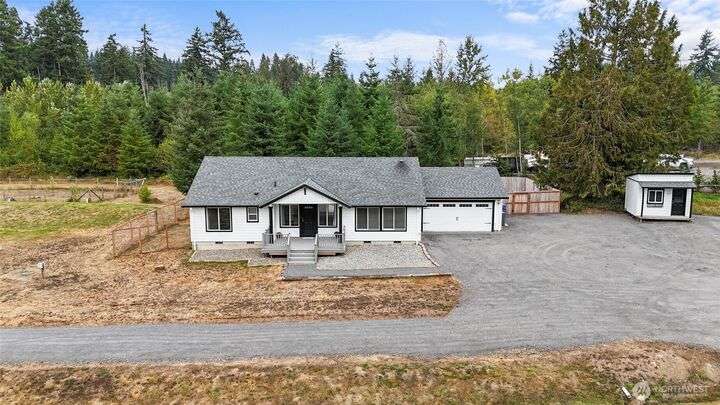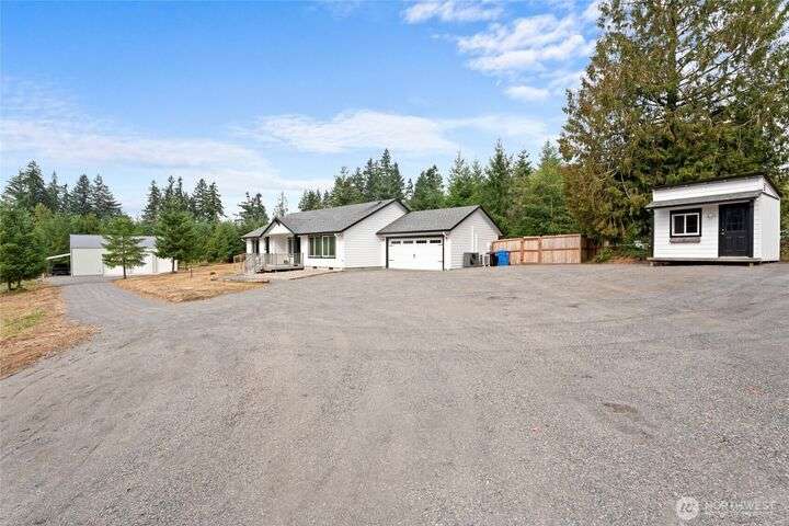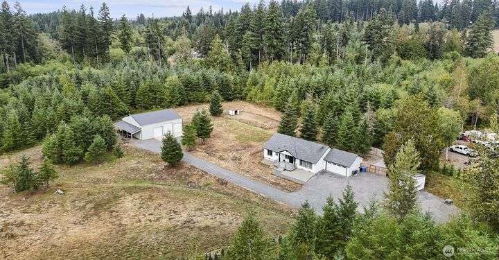 Don't miss this great opportunity to live away from the hustle and bustle, yet 7 min from I-5. This 5+ acre parcel has recent improvement of a 1840 sqft 3-Bay SHOP w/concrete floors (strong enough to install car lift), heated, center RV door, plus 2-bays w/electric openers. Additional 10x40 lean-to for storing wood, tractors etc. The home offers 3bed/2 full baths, den, mudroom/laundry from attached dbl car garage. Garage has cool epoxy flooring, insulated garage door, NEW whole-house filtration system AND wired for generator. Newer tile flooring in main living and LVP in bedrooms. The kitchen will make you go WOW! All new cabinets with tons of storage. Low cost living - put this one on your list! Back on the market - no inspection done.