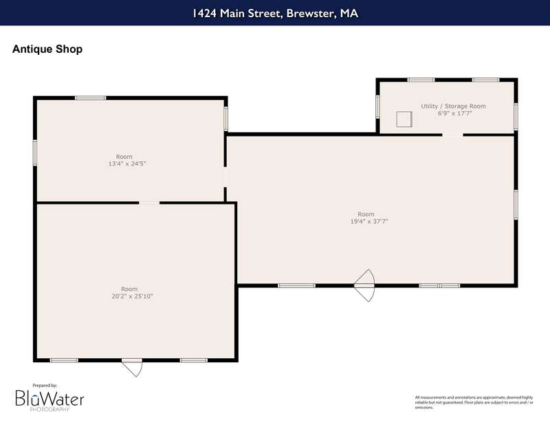 Charming Antique Home with Detached Antique Shop Storefront on Over 2 Acres in Historic Brewster. The ''Sea Captain's Town,'' renowned for its rich maritime heritage, a beloved Cape Cod community is a popular summer destination, home to the breathtaking Brewster Flats--an expansive stretch of tidal flats along Cape Cod Bay--as well as scenic bicycle routes including the Cape Cod Rail Trail. Nestled on beautiful and historic Main Street (Route 6A), this unique property offers endless potential. The antique home, full of original charm, needs restoration, providing a rare opportunity for a new owner to return it to its former glory. A detached antique store adds value--perfect for those looking to live and work from this idyllic location. Inside the main house, you'll find a spacious eat-in kitchen, warm & inviting living room with original wood floors, a cozy den/office, one bedroom, & a full bath on the first floor & two additional bedrooms upstairs. Step outside & enjoy everything Bre