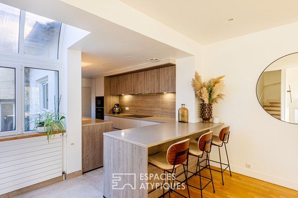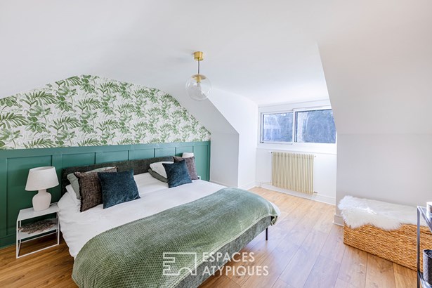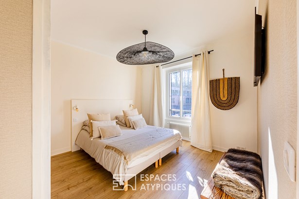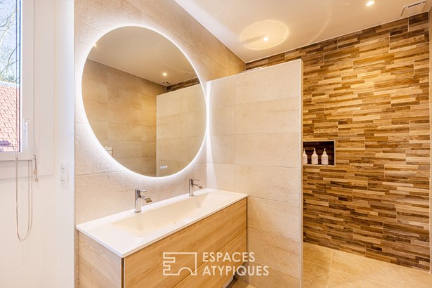 The cozy living room and the dining room with its beautiful openings to the outside create a warm atmosphere, ideal for entertaining. The modern kitchen, in wood and beige tones, is equipped with a convivial central island, perfect for cooking with family or friends. Four bedrooms with a strong style By taking the staircase, you access on two floors four bedrooms full of charm, decorated with natural materials and soothing colors. Each floor has its own bathroom. The high-end bathroom on the first floor, with its walk-in shower and backlit mirror, offers a wellness space worthy of a hotel.